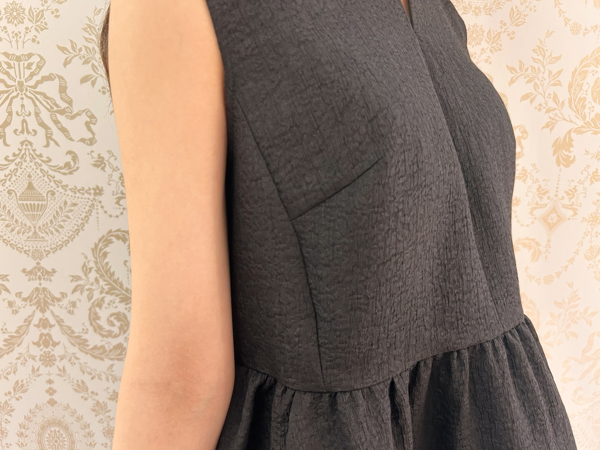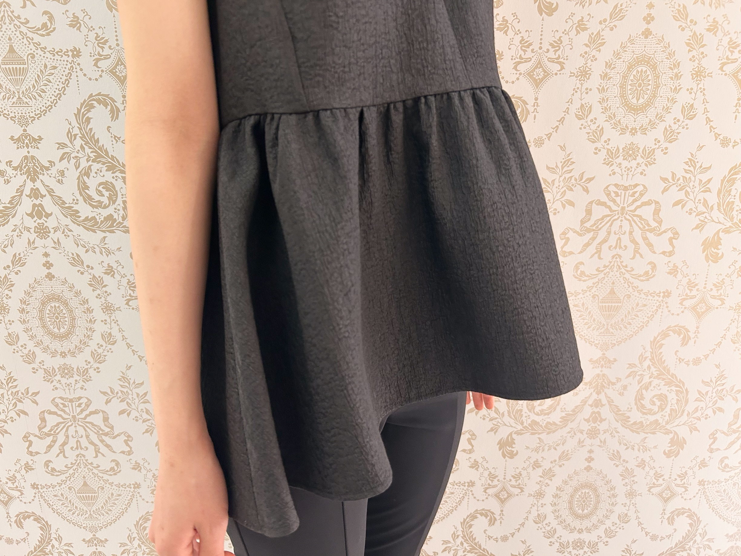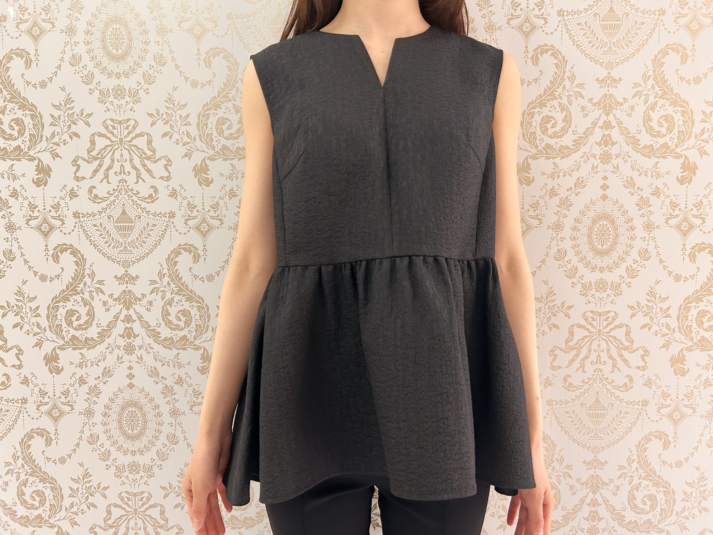 主役となるのは、表情豊かな素材感が魅力のジャガードノースリーブペプラムブラウス。