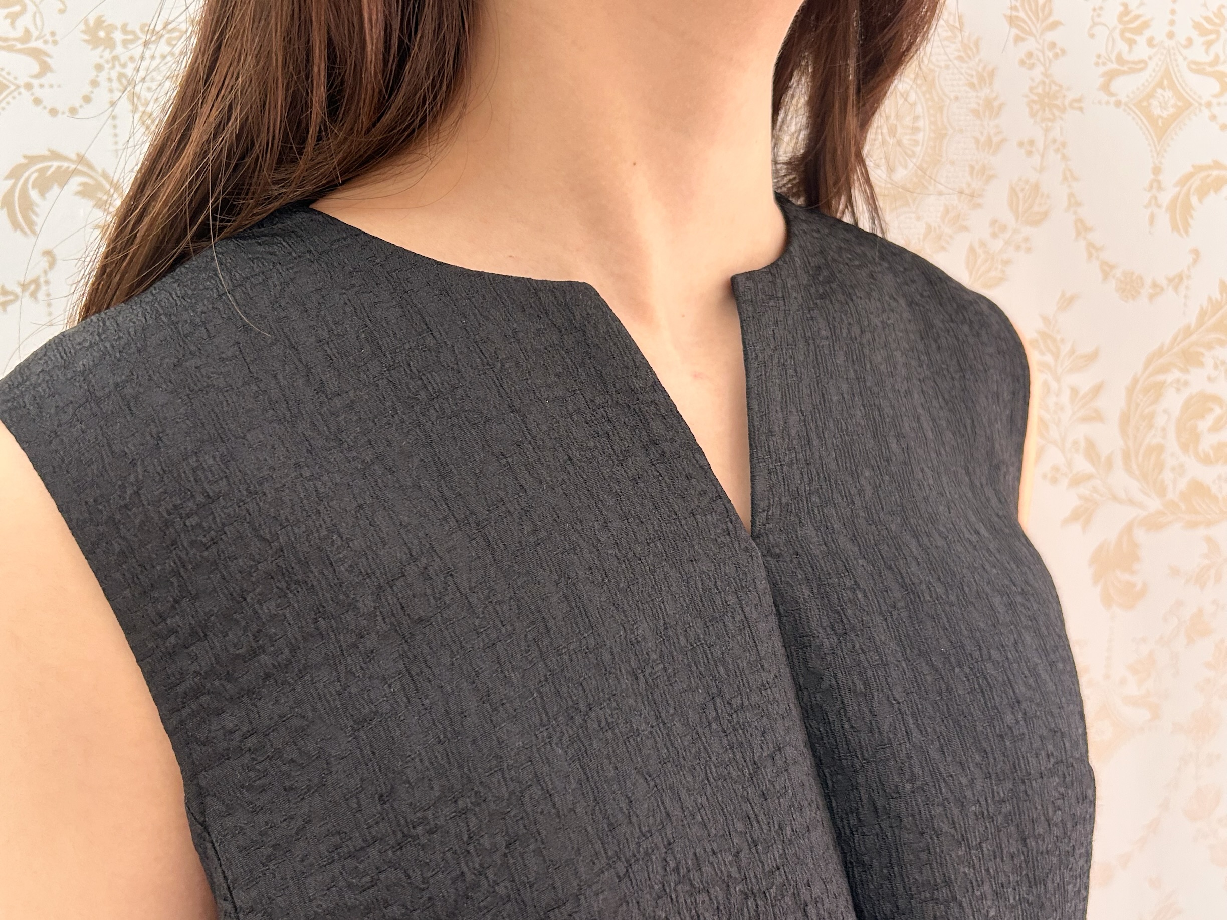 胸元サイドに入ったダーツが立体的なシルエットを生み、女性らしいラインを自然に引き立ててくれます。