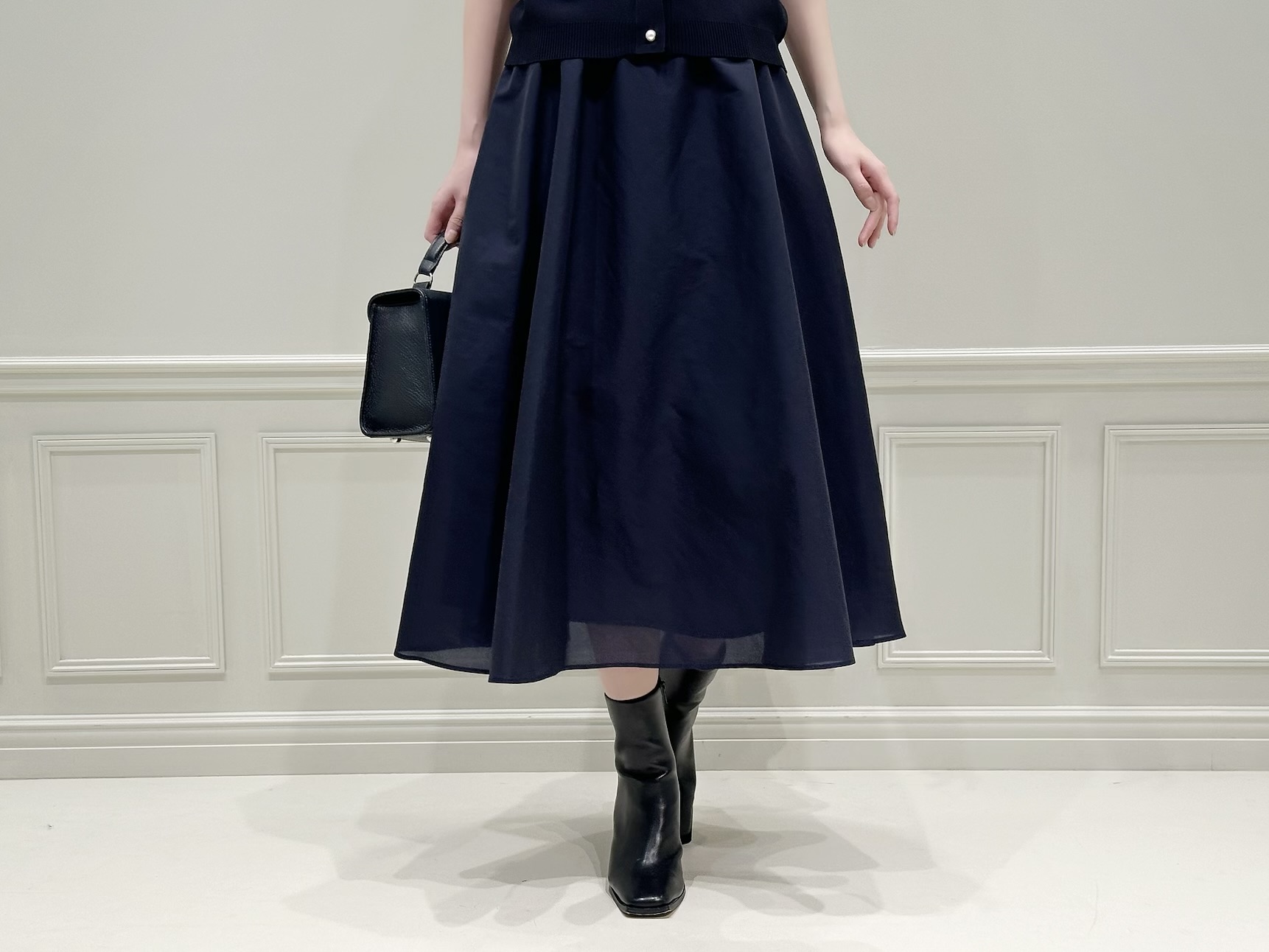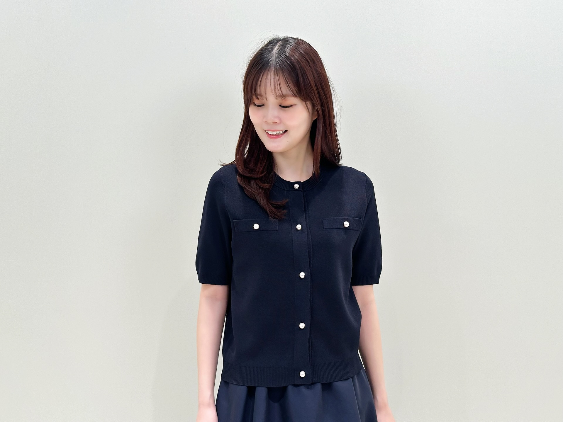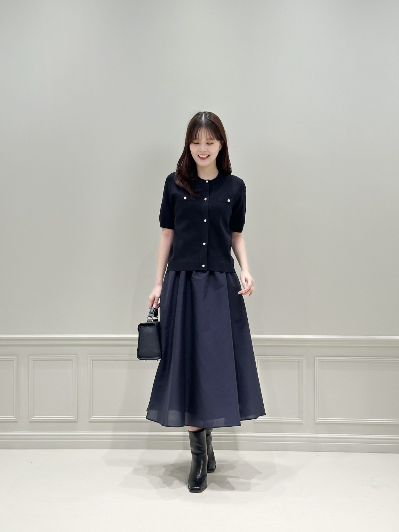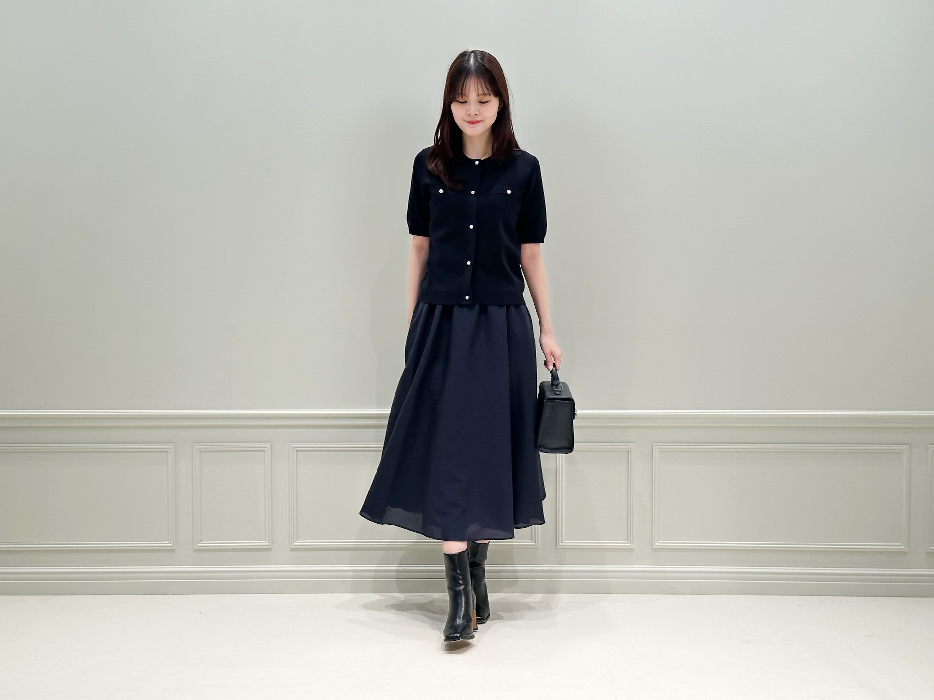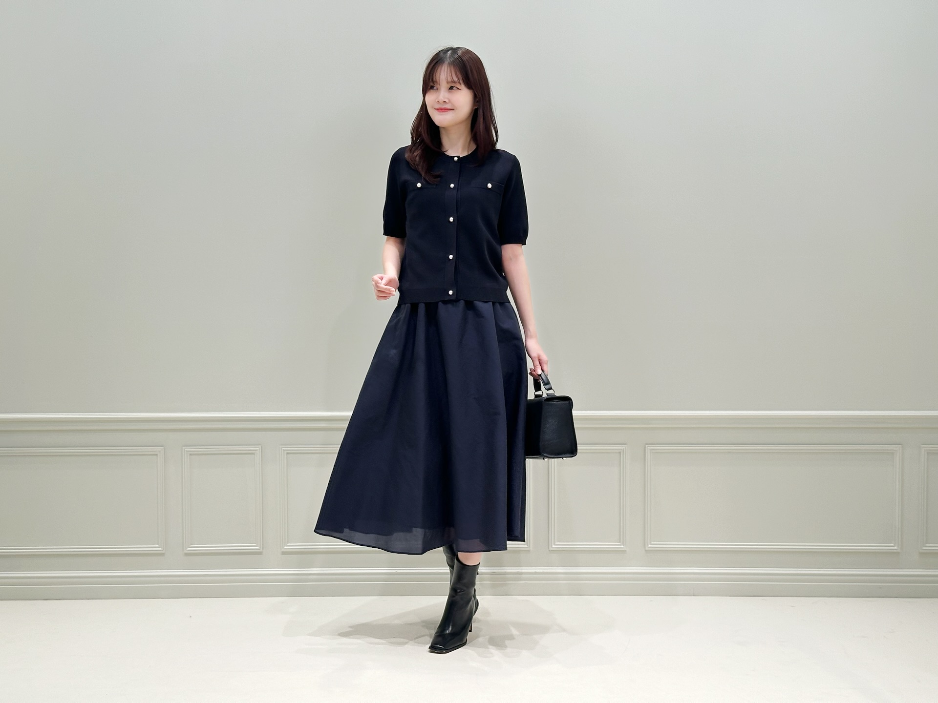 全体をネイビーでまとめながらも、パールボタンのアクセントや軽やかな素材感によって、重たく見えない春らしいスタイリングになっています。コンパクトなトップスと、ふんわりと広がるフレアスカートのシルエットバランスもポイント!