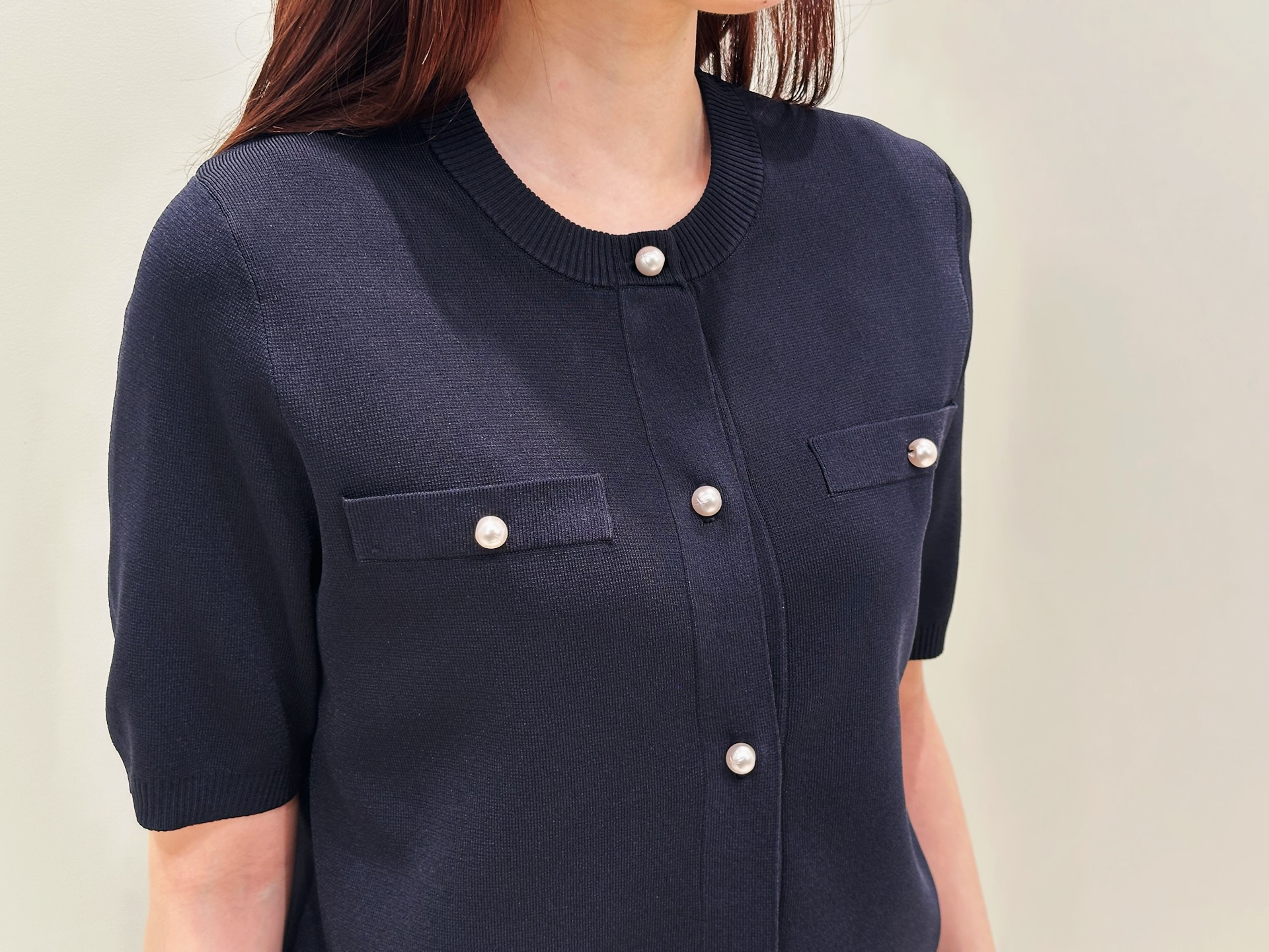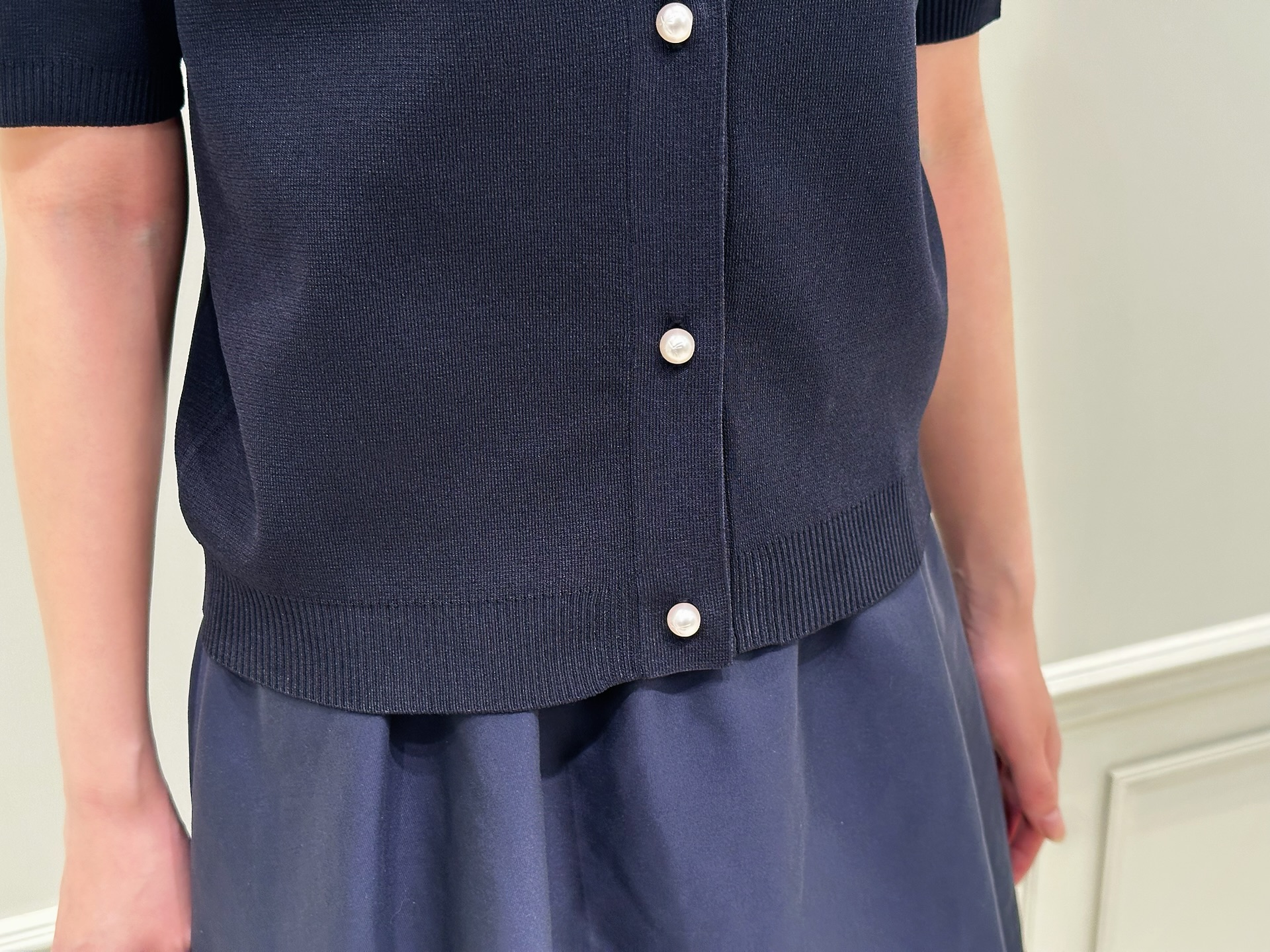 実際に着てみると、コンパクトなシルエットがとてもきれいで、ボタンを留めてトップスとして着たときのバランスがとても良いのが印象的でした。フロントにあしらわれたパールボタンが、シンプルな中にもさりげない華やぎを添えてくれるので、アクセサリーが少なくても上品な印象に仕上がります!