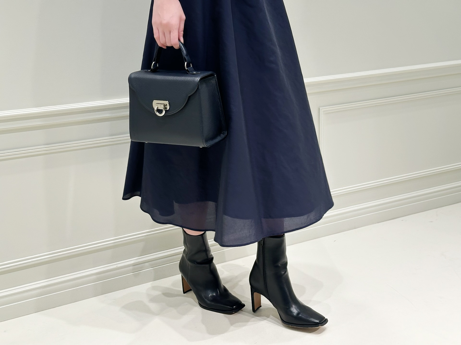 自然とウエスト位置が高く見えるので、スタイルアップ効果も期待できます。足元はブーツを合わせて程よく引き締め、バッグもネイビーを選ぶことで、全体に統一感を持たせました。