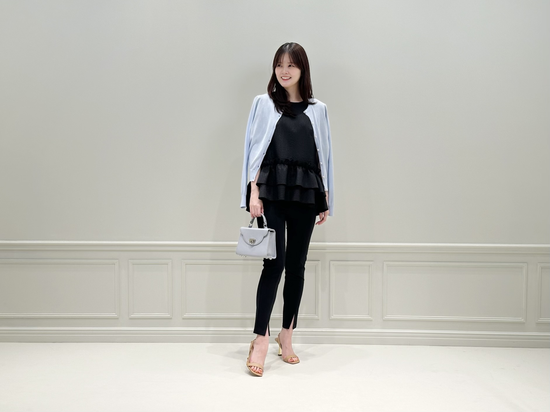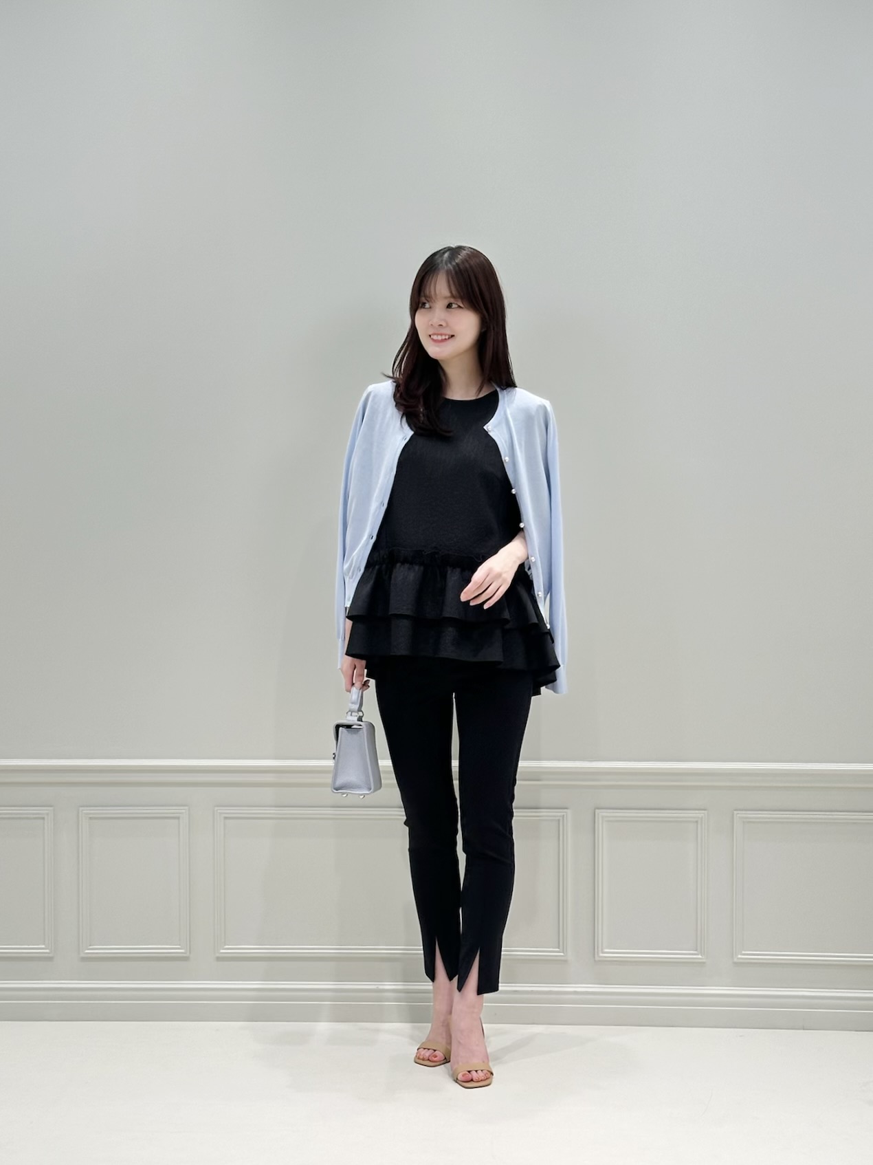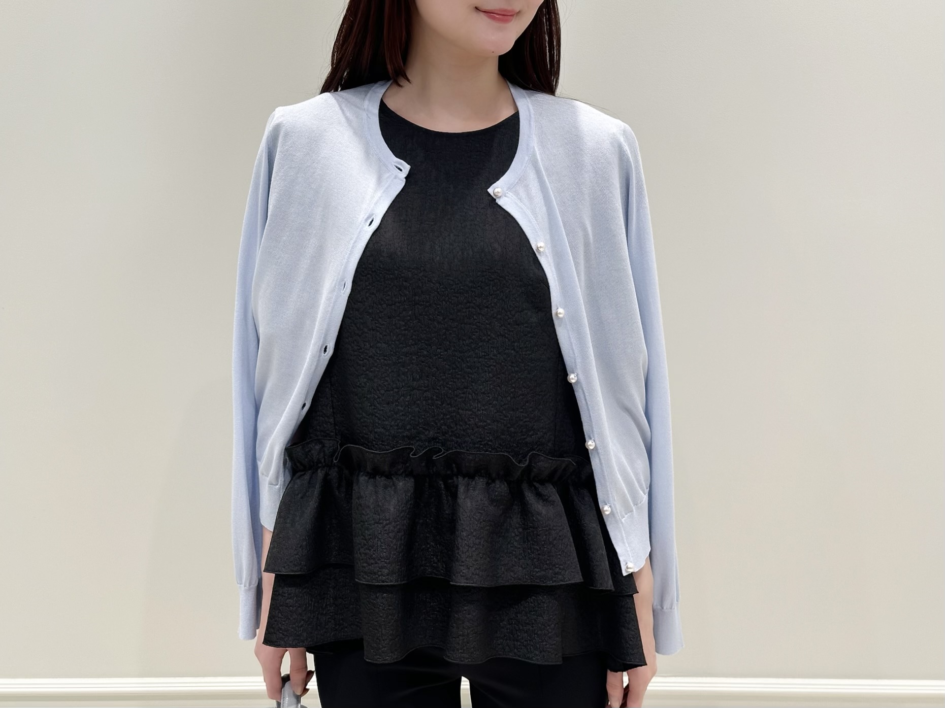 コーディネートのスタートは、ブラックのペプラムブラウス×レギンスパンツのモノトーンスタイルに、ベビーブルーのニットカーディガンを肩掛けした爽やかな着こなし。