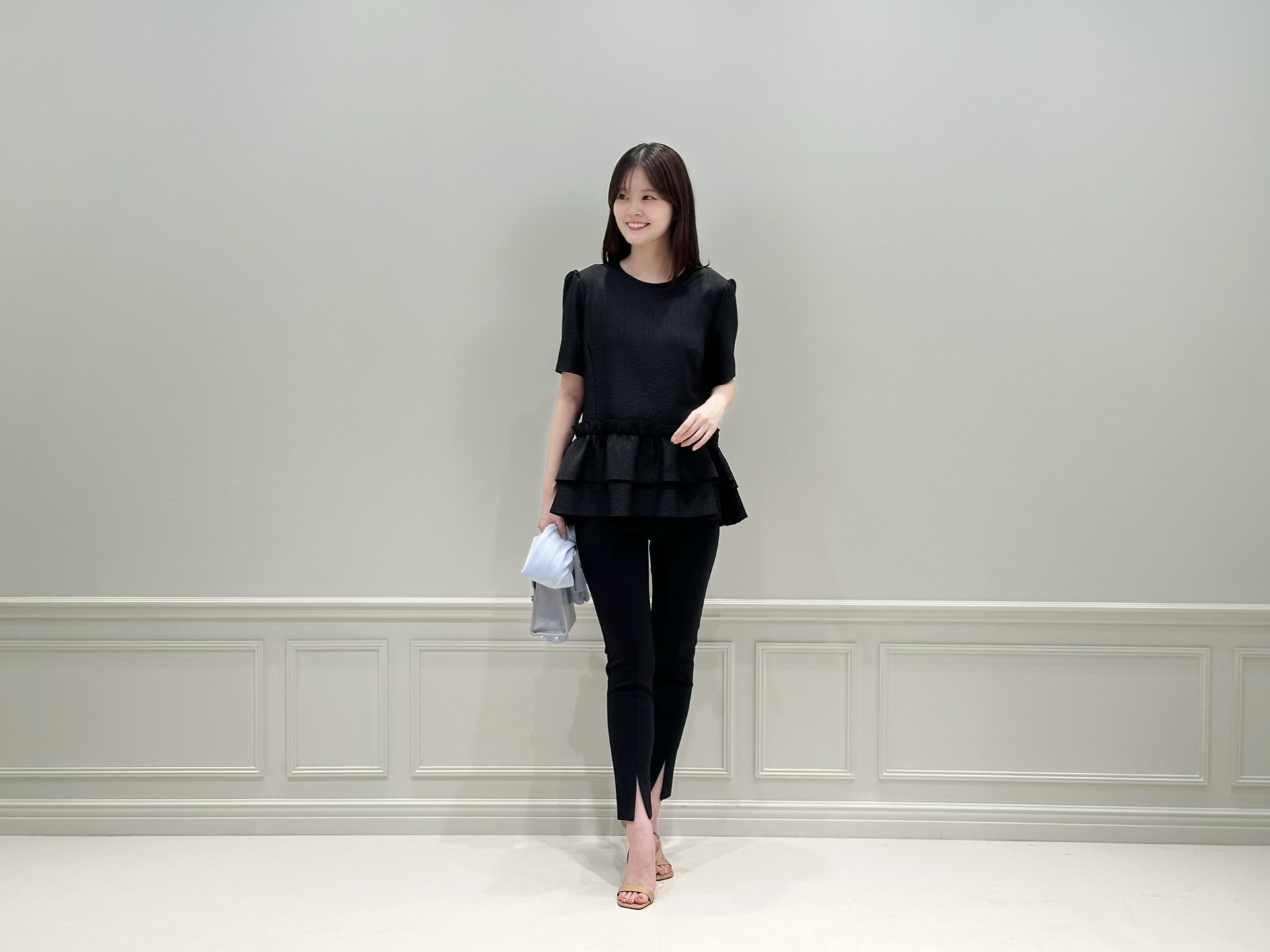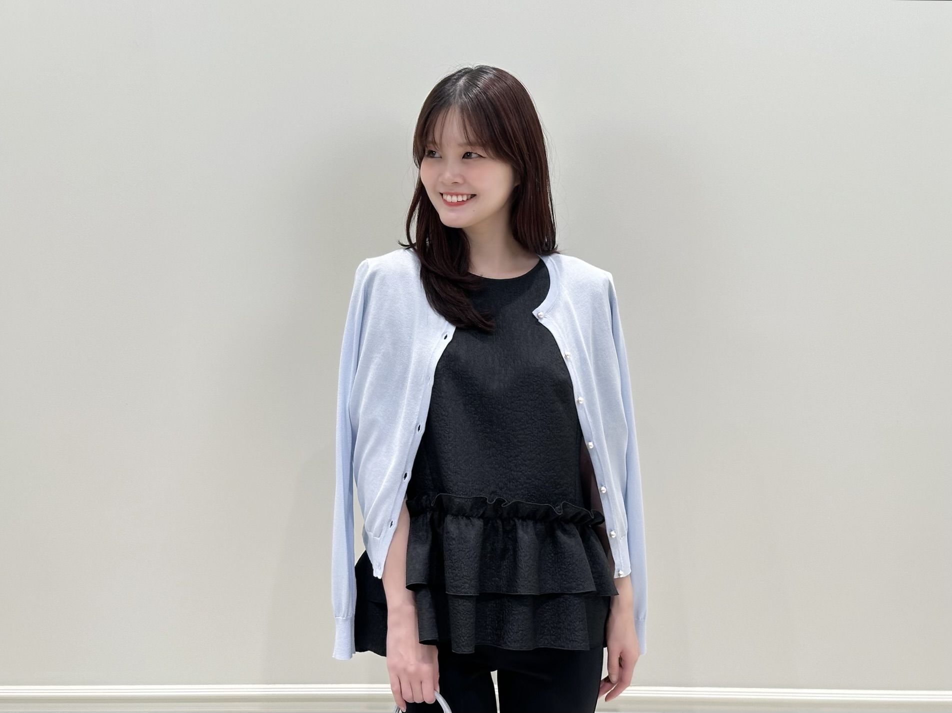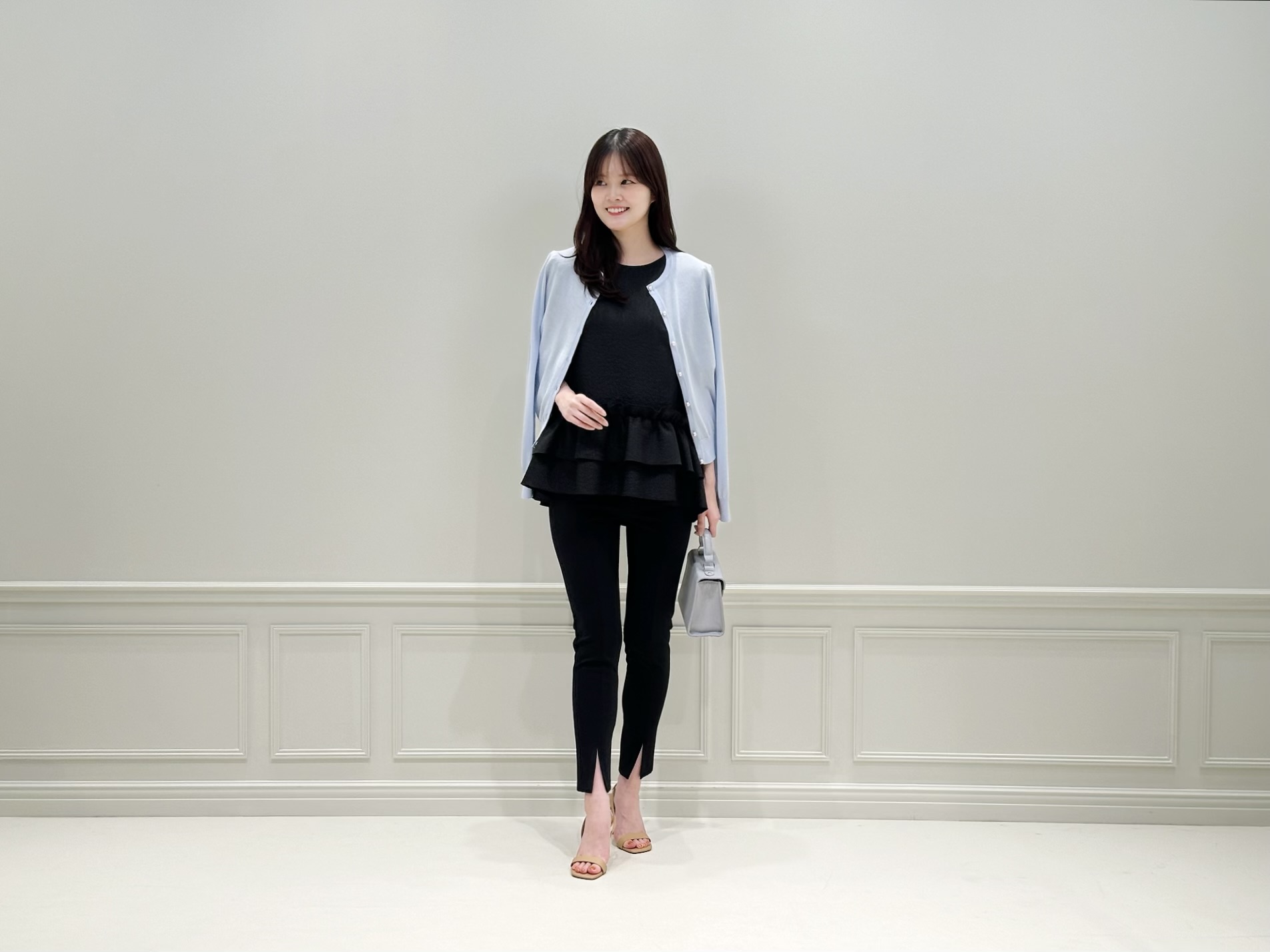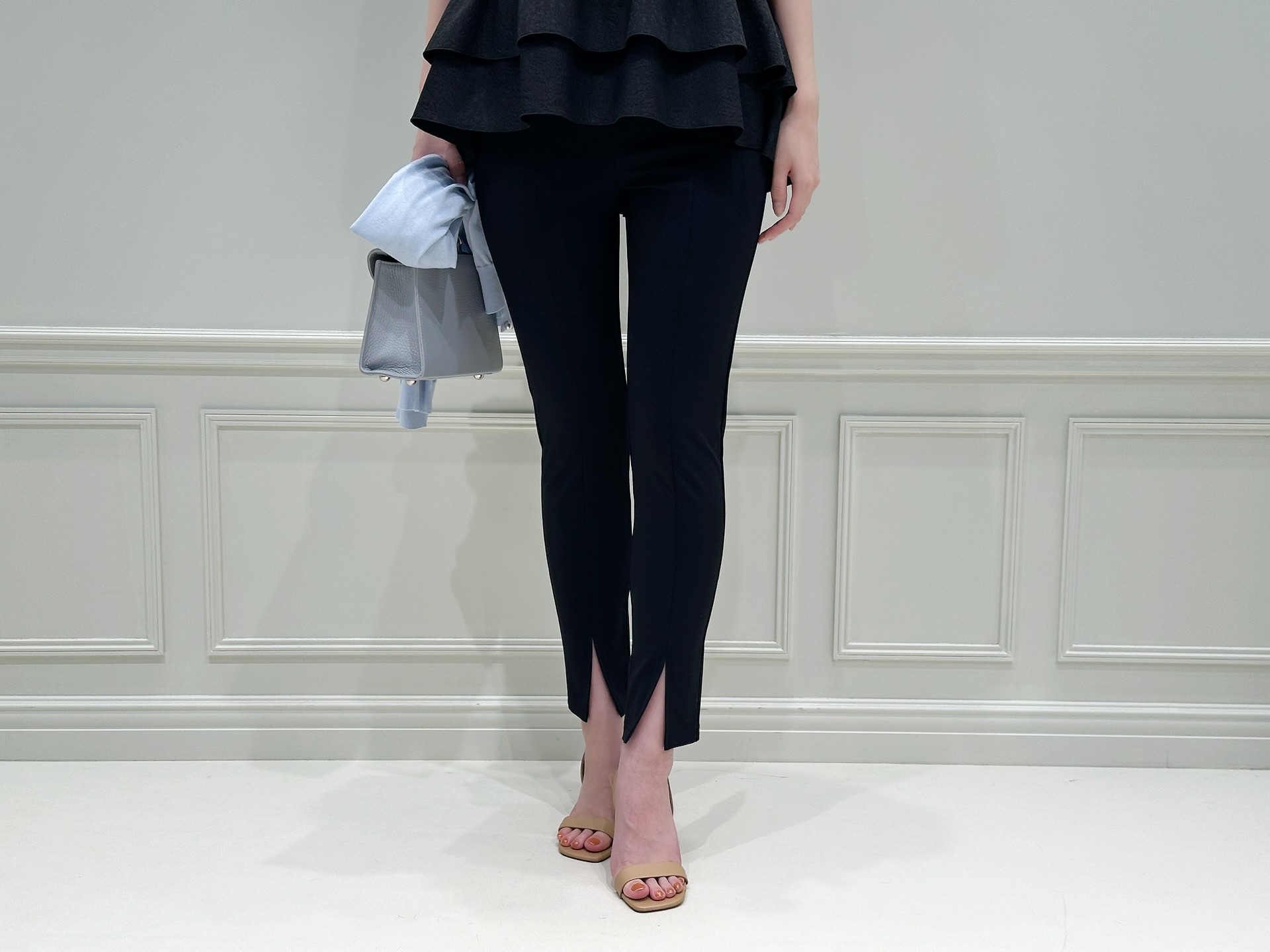 コーディネートのスタートは、ブラックのペプラムブラウス×レギンスパンツのモノトーンスタイルに、ベビーブルーのニットカーディガンを肩掛けした爽やかな着こなし。
