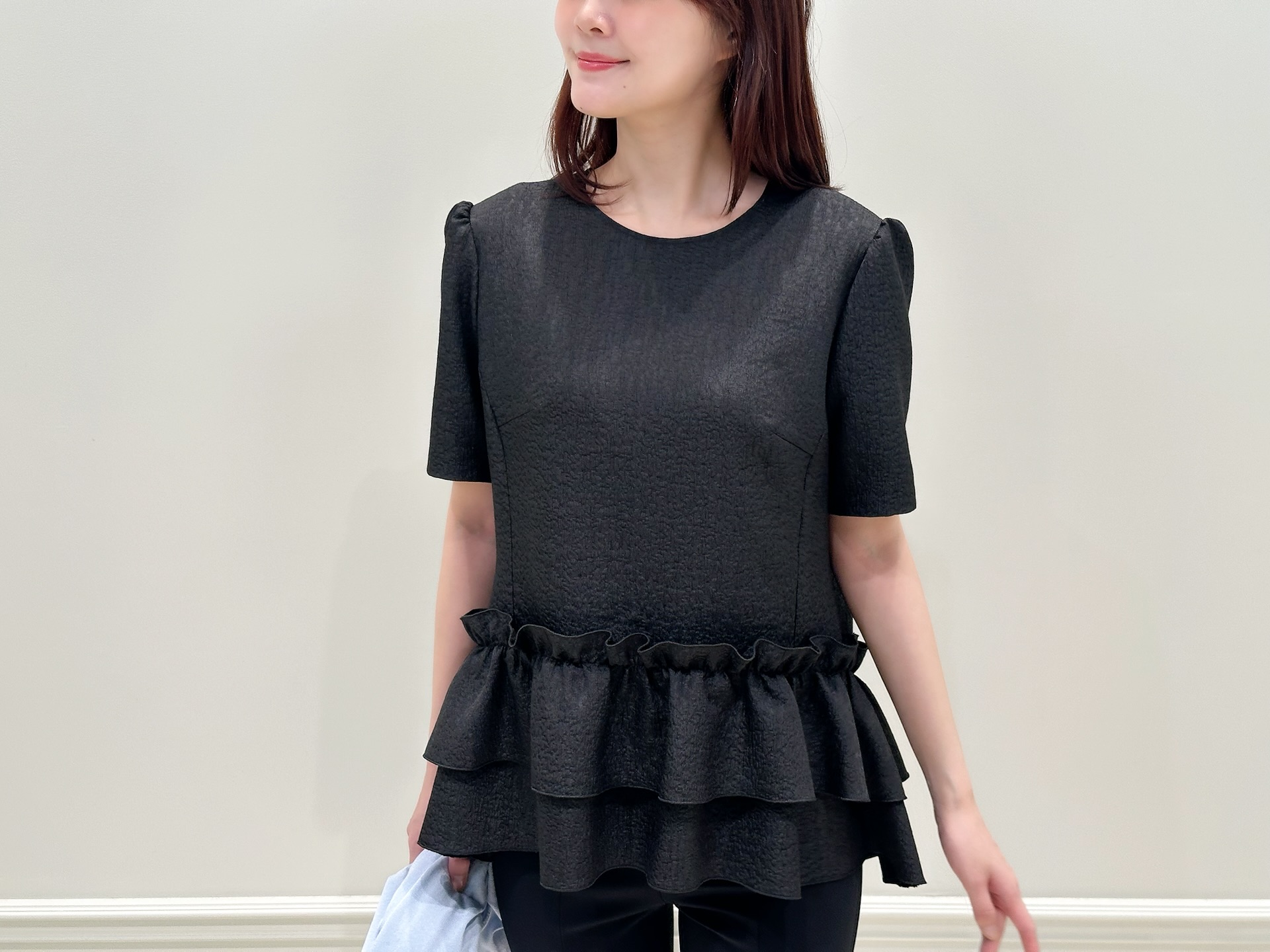 今回は、裾にボリュームを持たせたペプラムブラウスを主役に