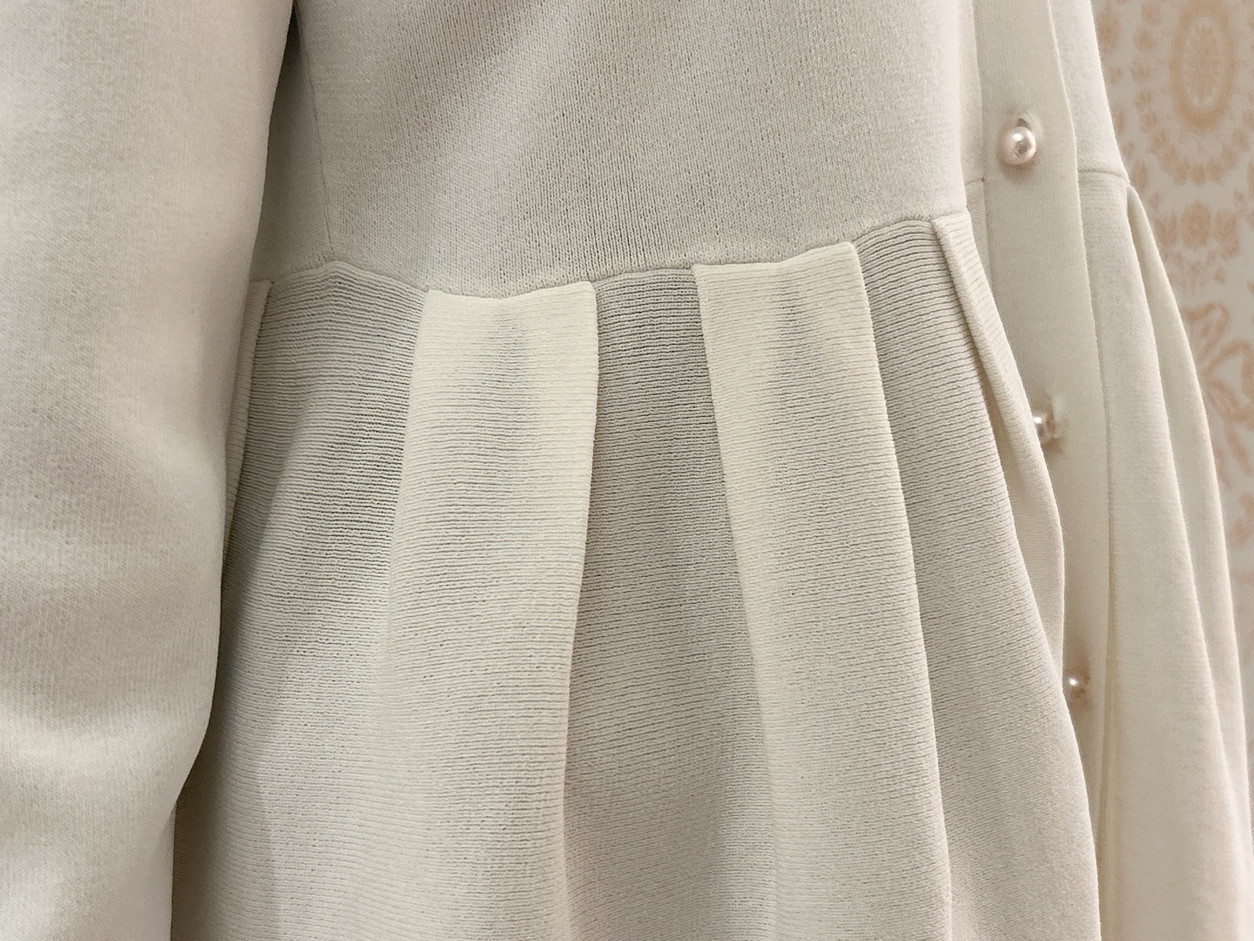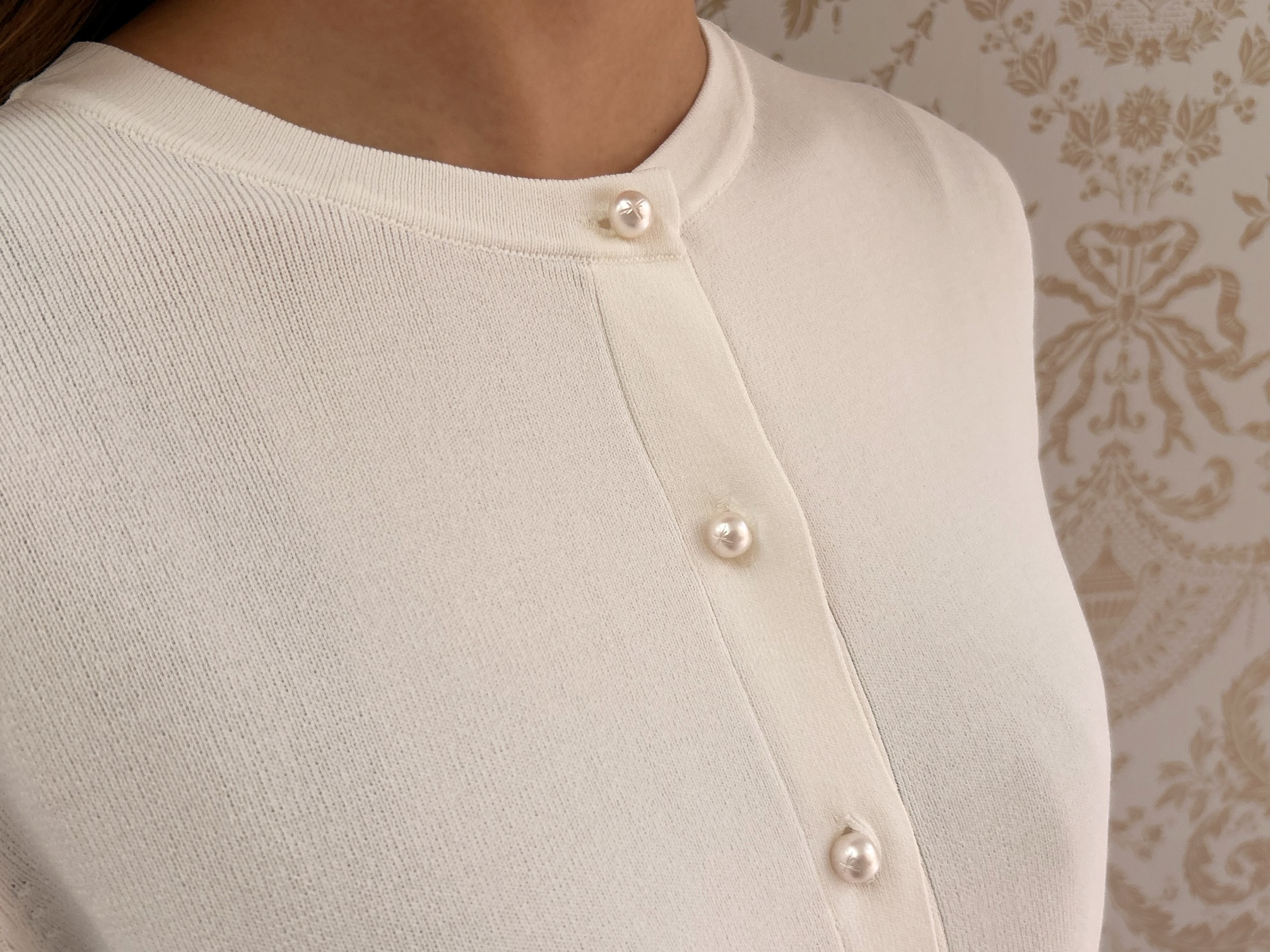 パールボタンの縦ラインが、全体をすっきりとした印象に導いてくれるのも魅力。