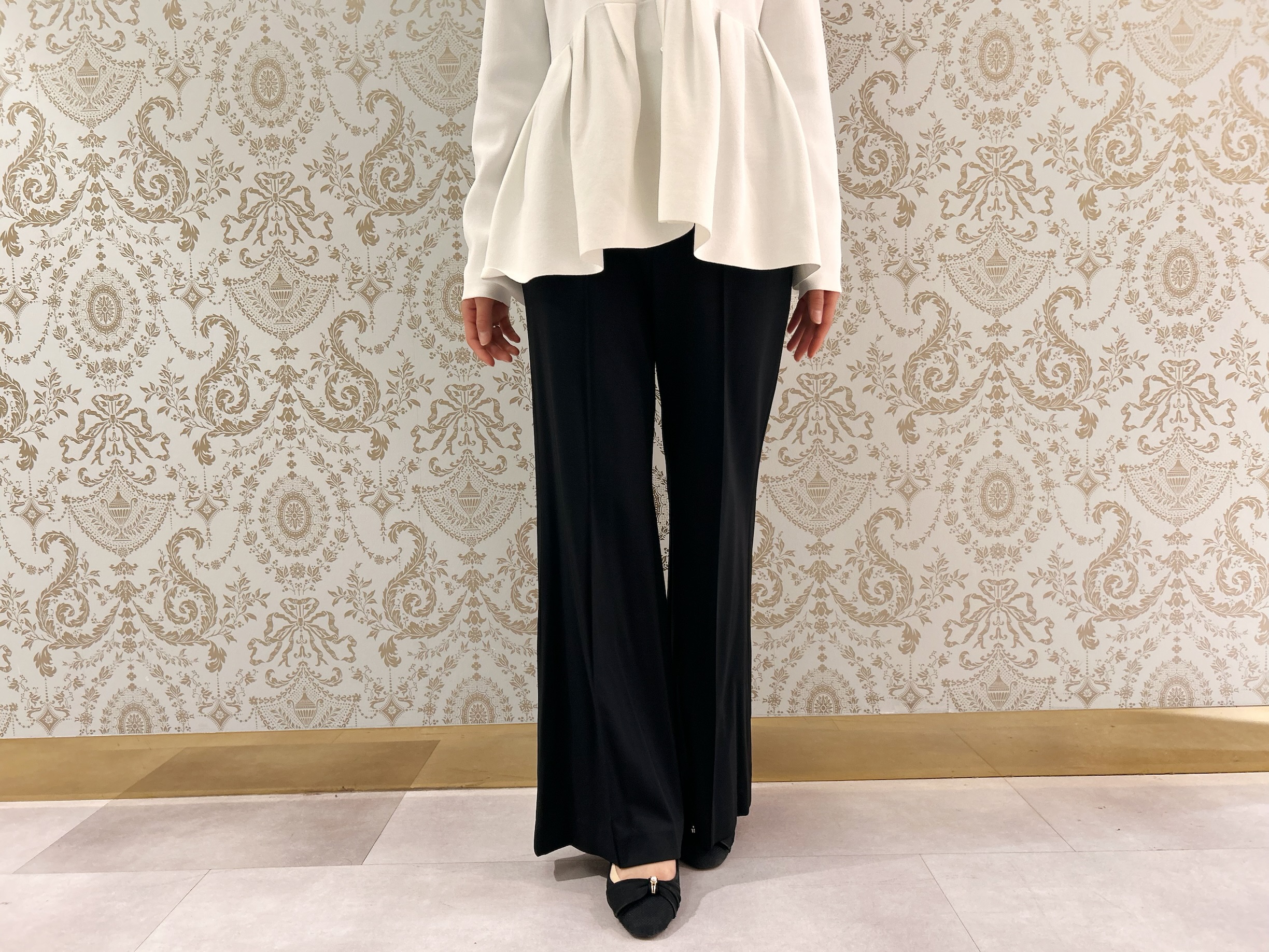 ボトムには、ピンタック入りのフレアレギンスパンツを合わせて。