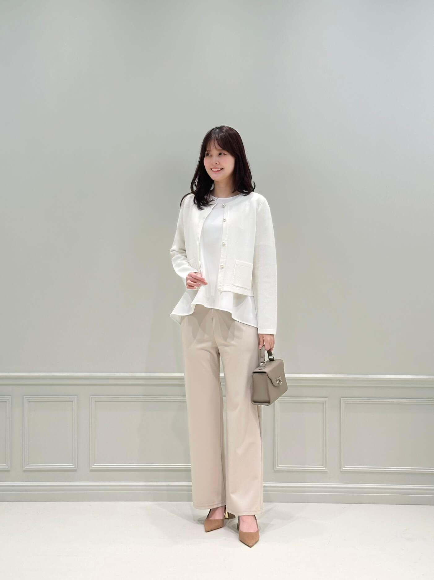 全体をアイボリーからベージュの柔らかなトーンでまとめることで、優しげで上品な雰囲気に。ニットジャケットを羽織ればきちんと感のある装いに、脱げば軽やかで女性らしいスタイルへと印象が変わり、気温やシーンに合わせて楽しめるコーディネートに仕上がります!