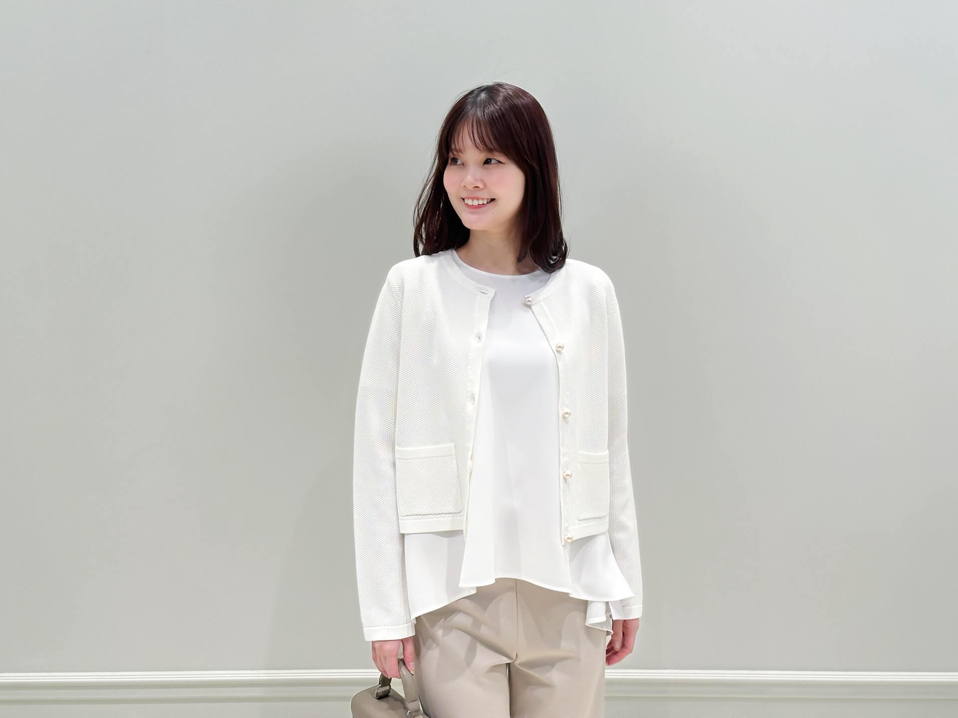 インナーには、ダブルクロスタックスリーブフレアブラウスを合わせて、柔らかなニュアンスをプラス。ニットジャケットとのバランスが絶妙で、コンパクトな丈感のカーディガンから、ブラウスのふんわりと広がる裾がのぞくシルエットがとても可愛らしく、女性らしさを自然に引き立ててくれます。