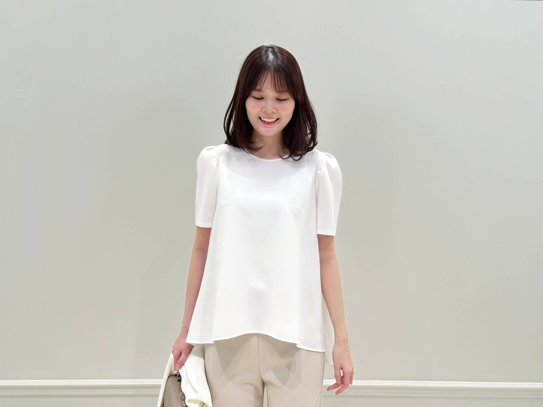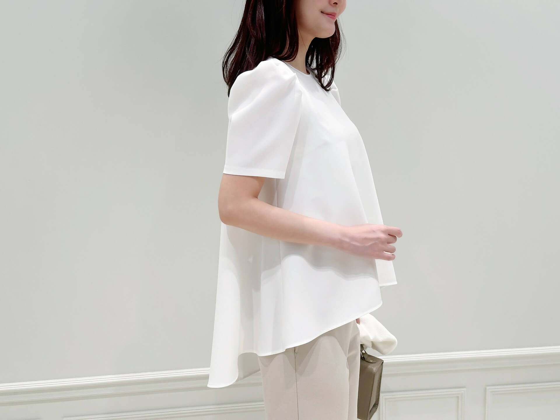後ろが少し長めに設計されたデザインが自然な動きを生み、ふわりと広がるシルエットがパンツスタイルを柔らかく見せてくれます。半袖でもきちんと感があり、季節が進めば一枚でさらりと着られるのも魅力です!
