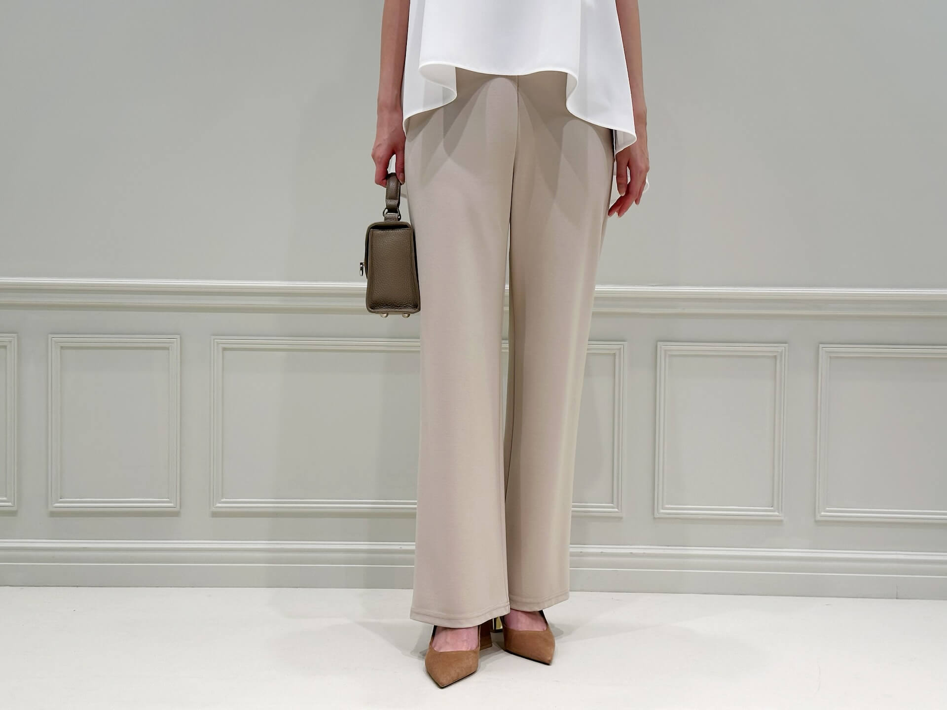 ボトムには、ストレッチポンチストレートレギンスパンツを合わせて、全体をすっきりとまとめました。伸びやかな穿き心地と美しいストレートラインが特徴の一本で、ほどよいハリと上品な光沢感が脚をまっすぐに見せてくれます。