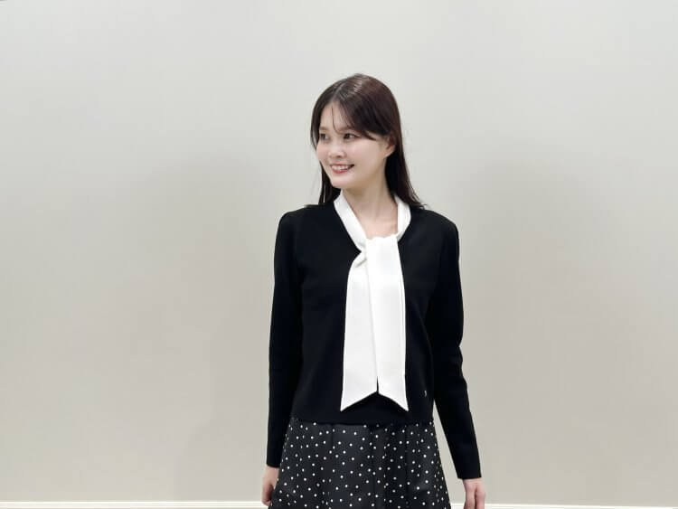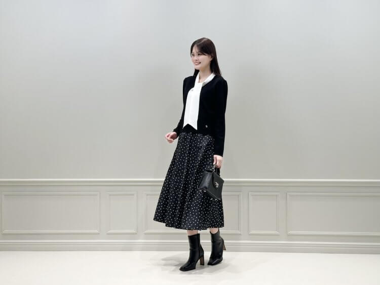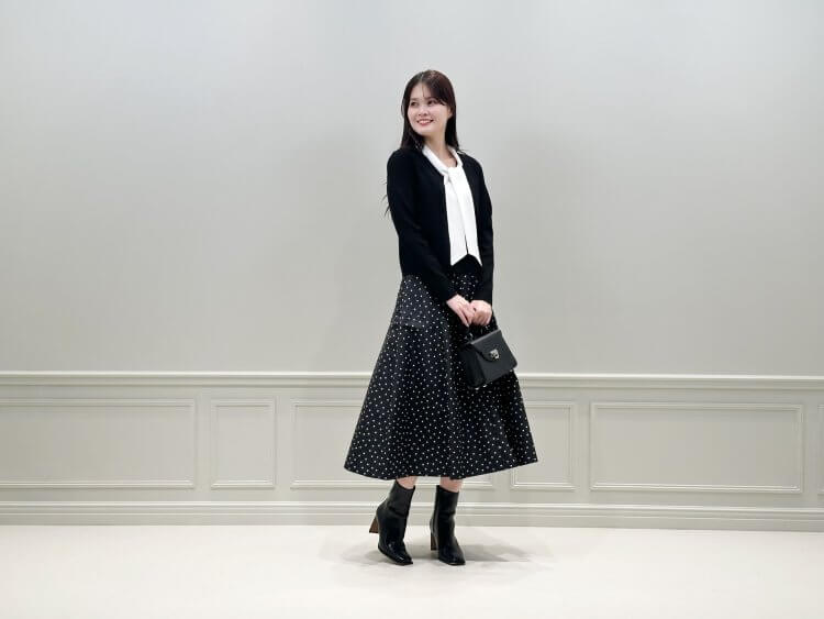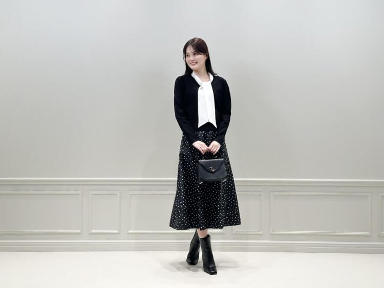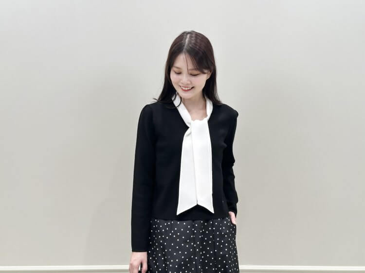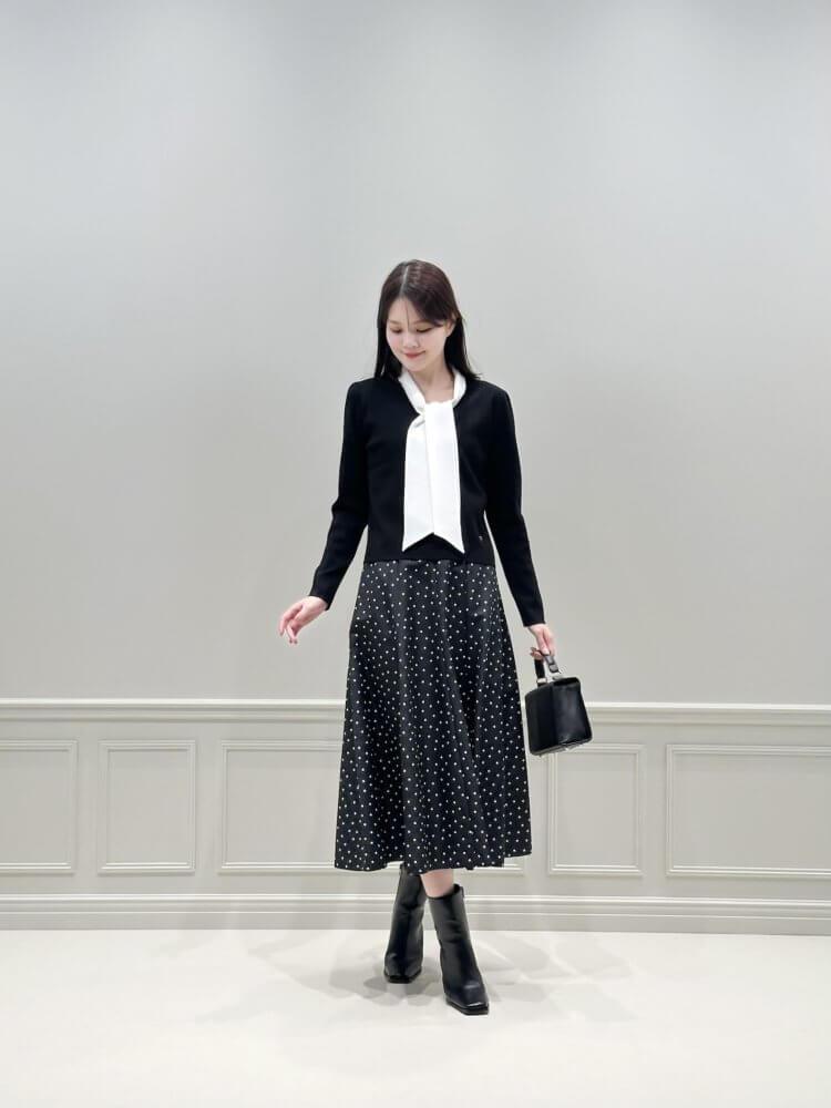 ブラック×ホワイトの配色で落ち着き感を出しながらも、ボウタイとドット柄が華やかに映えて、特別感のあるコーディネートに仕上がります。お出かけやお食事など、少し気分を上げたい日にぴったりのコーディネートです♡