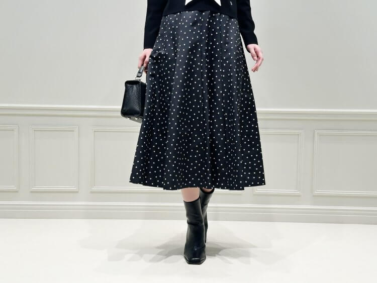 上品な光沢と程よいハリのあるグログラン素材を使用した、フレアシルエットのスカート。小さめのドットプリントが甘すぎず、大人の女性に似合う可憐な印象を演出します。