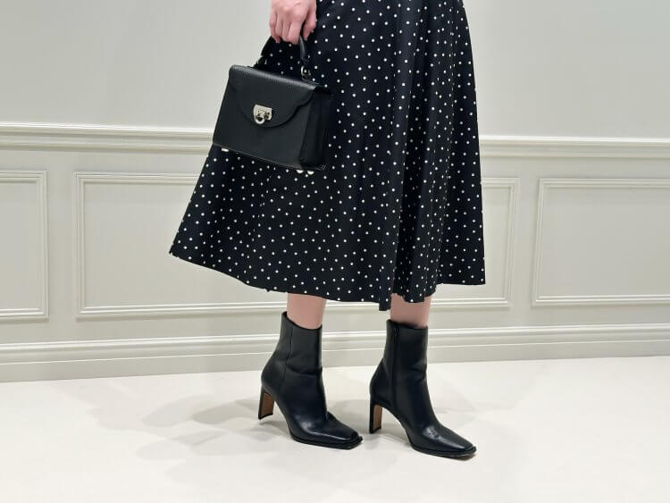 足元はブラックのショートブーツで引き締め、きちんと感とスタイルアップを両立しました。