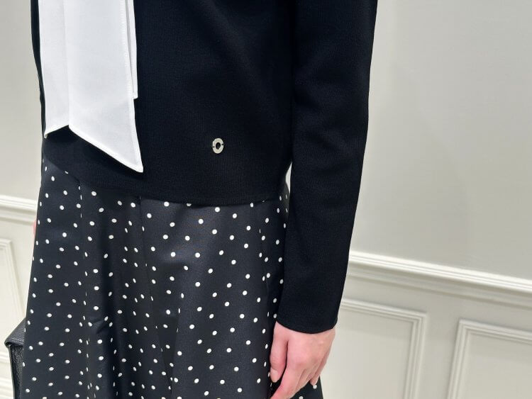 甘さとすっきり感の絶妙バランス♡ボウタイニット×ドットスカートで叶える華やぎコーデ