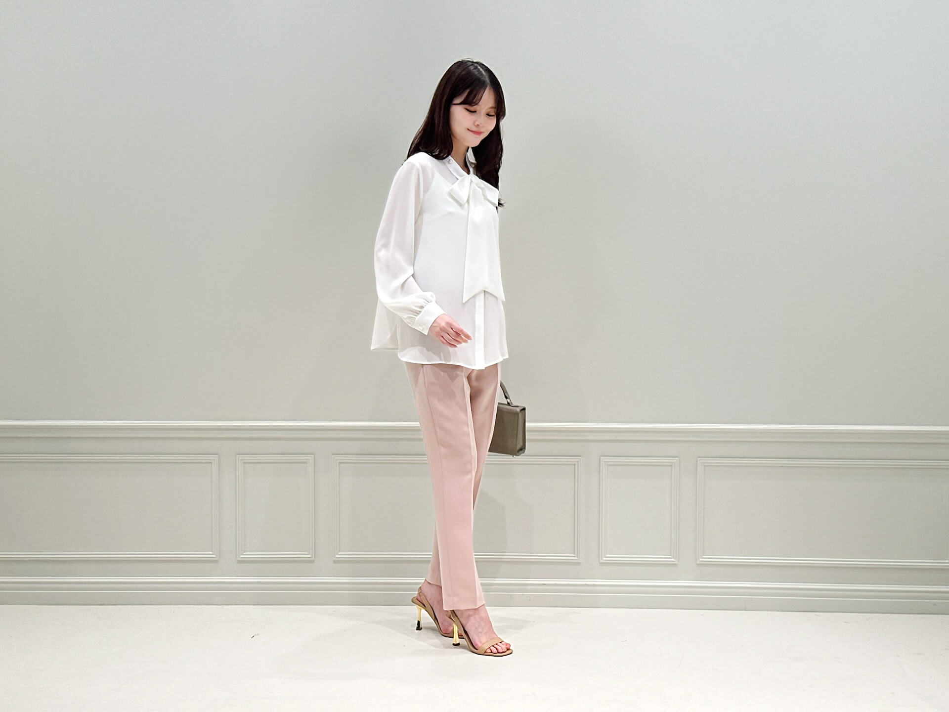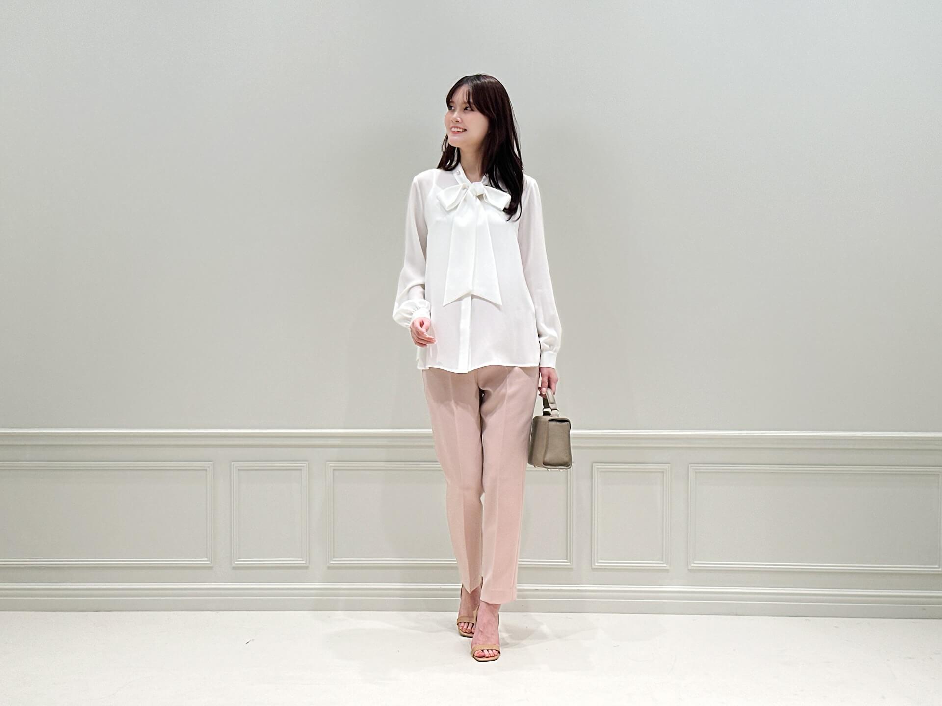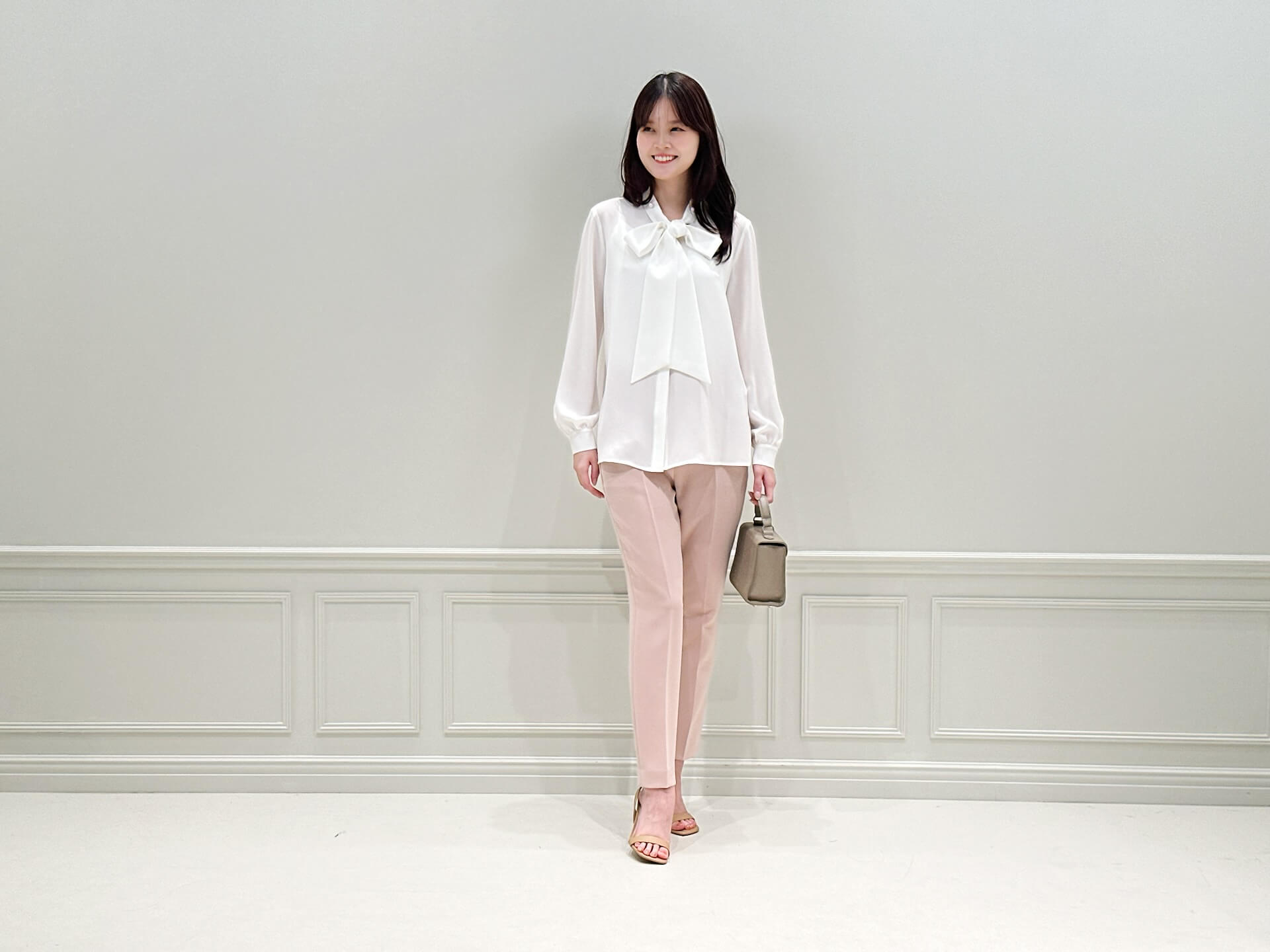 リボンディテールが印象的なブラウスを主役に、やわらかなピンクベージュのパンツを合わせた、上品さと可愛らしさを兼ね備えたスタイリング。ホワイト×ニュアンスカラーの組み合わせが、軽やかで優しい印象を演出してくれるコーディネートに仕上げました。
