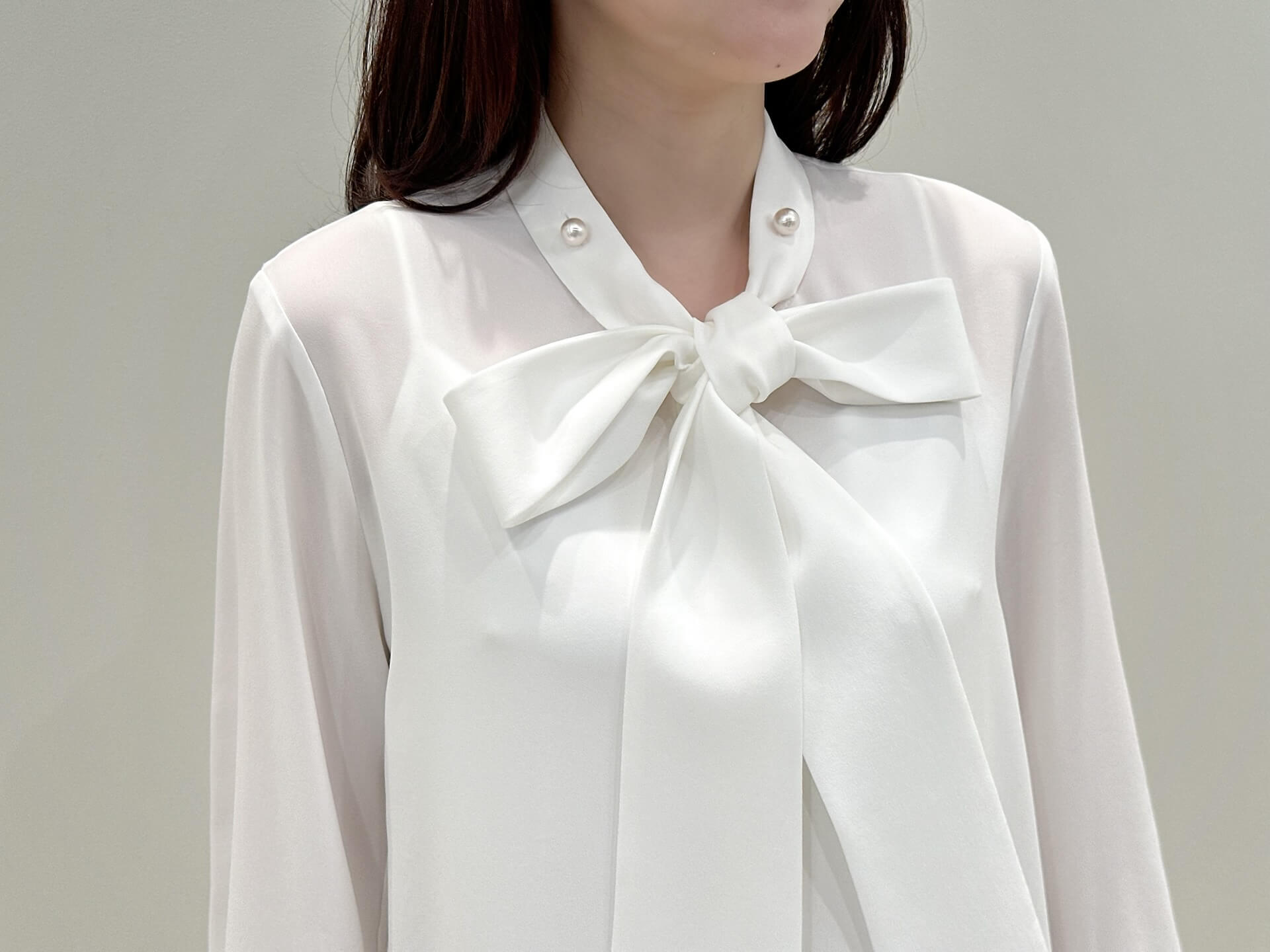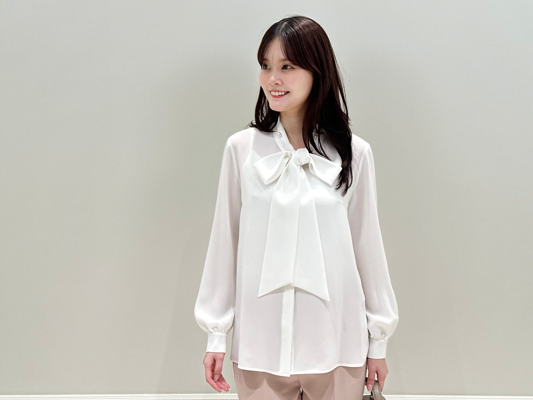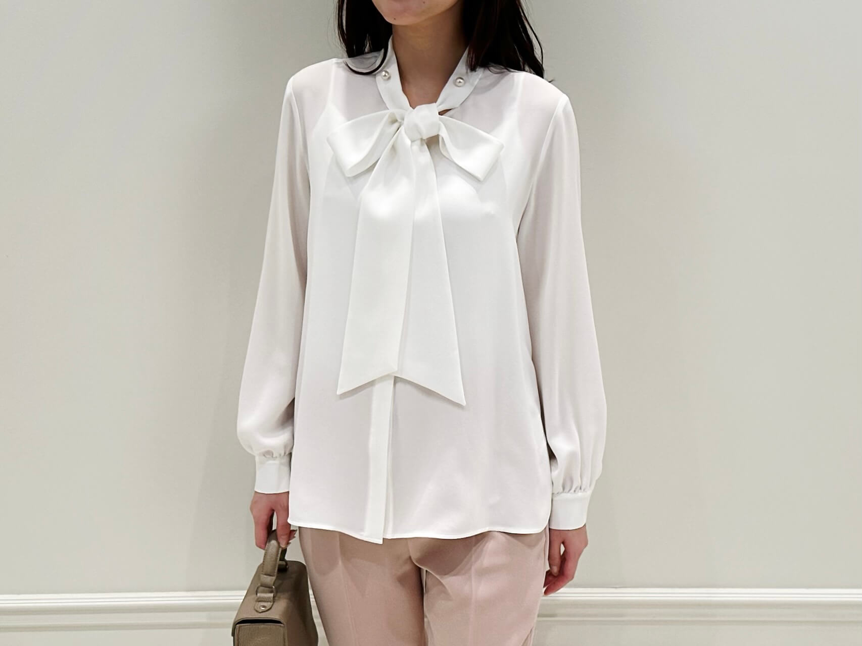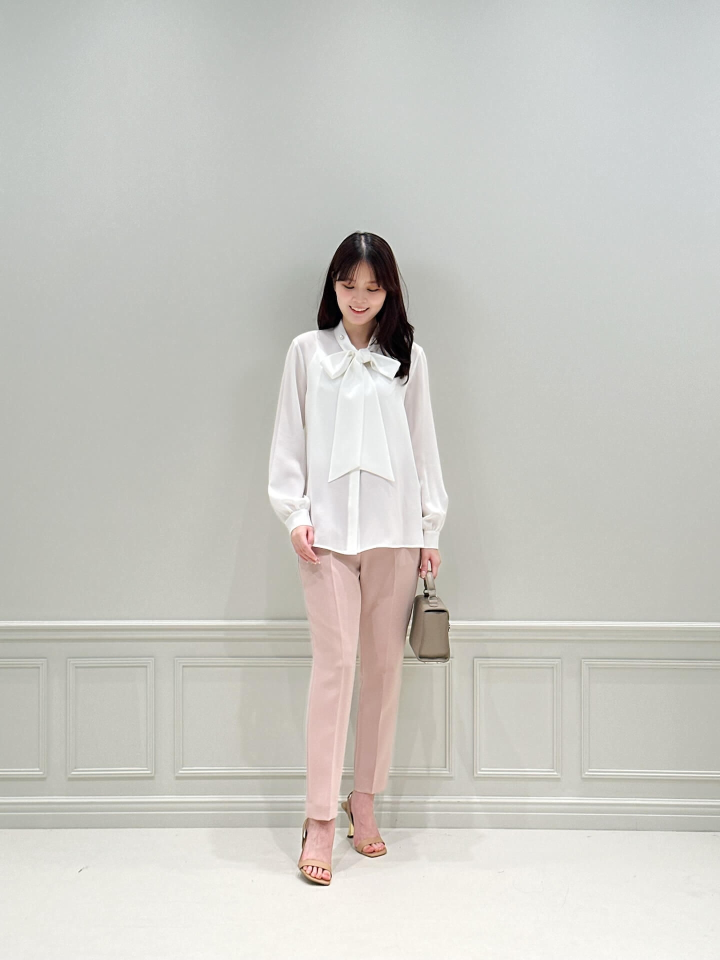 リボンディテールが印象的なブラウスを主役に、やわらかなピンクベージュのパンツを合わせた、上品さと可愛らしさを兼ね備えたスタイリング。ホワイト×ニュアンスカラーの組み合わせが、軽やかで優しい印象を演出してくれるコーディネートに仕上げました。