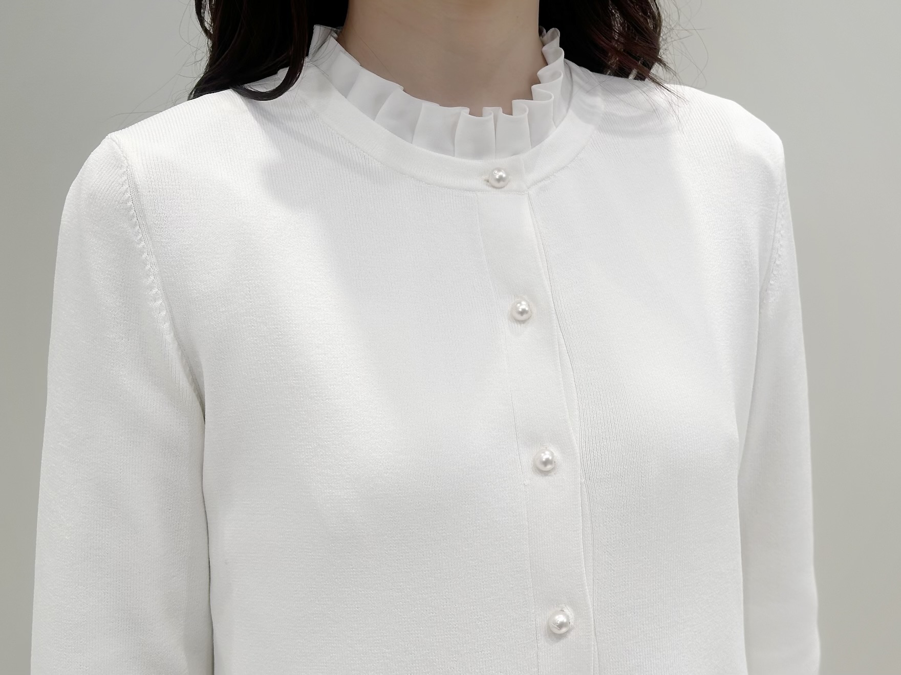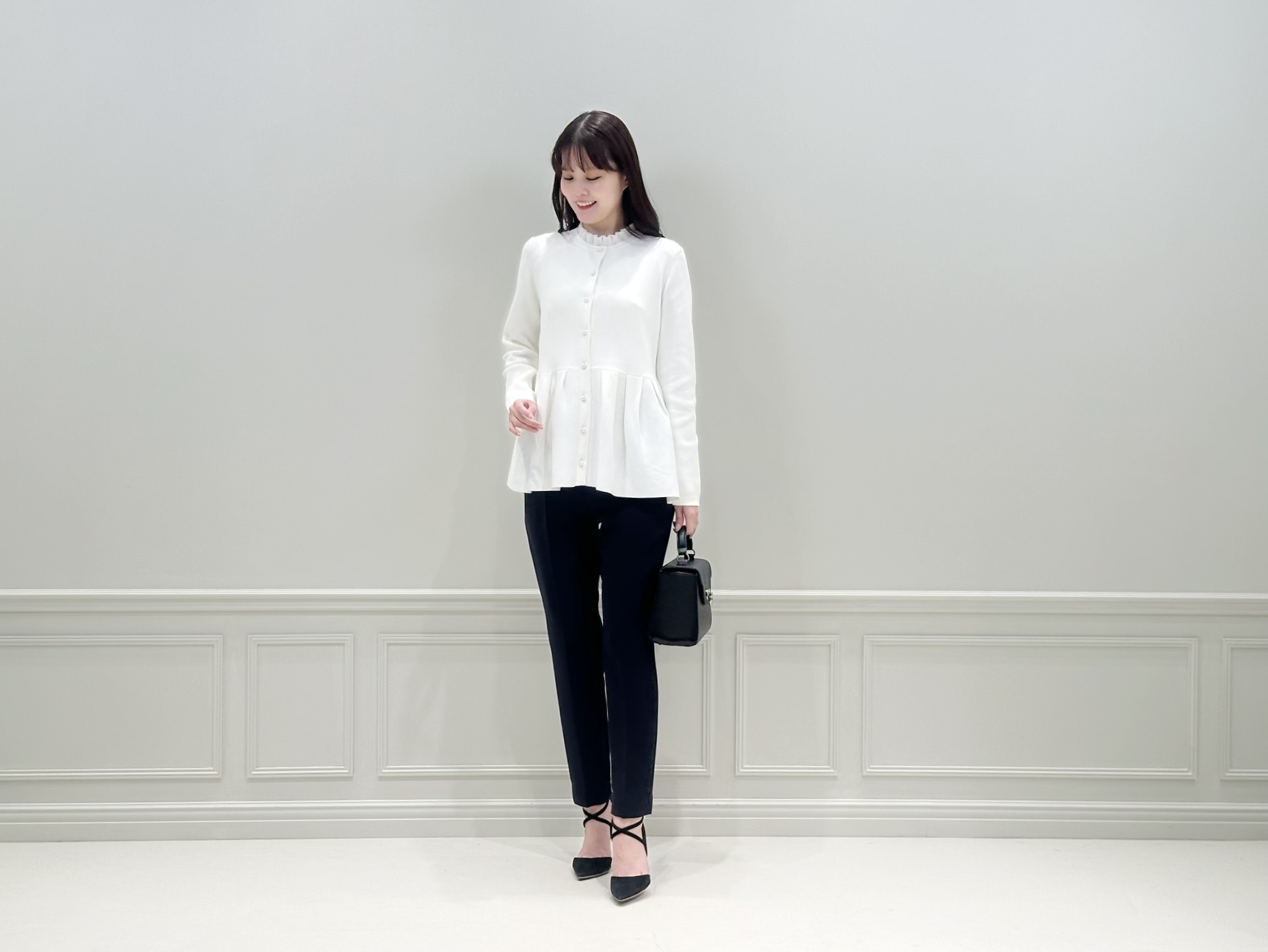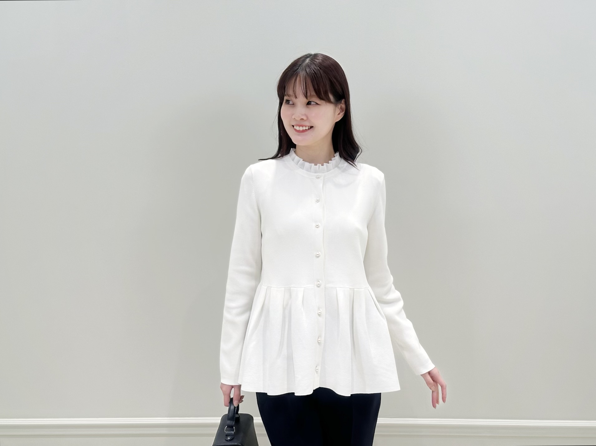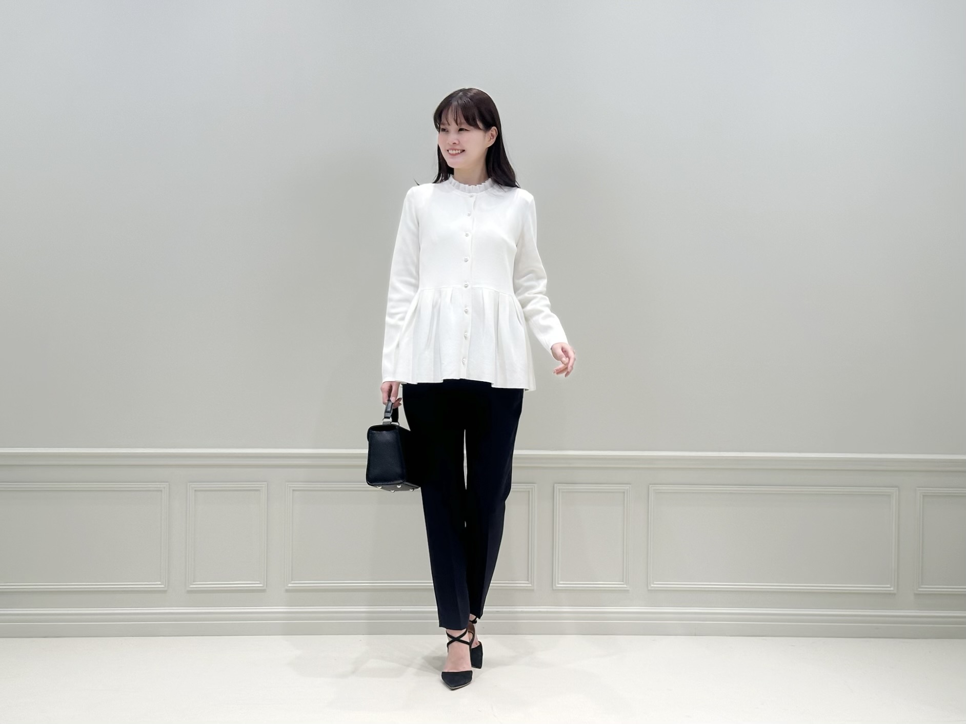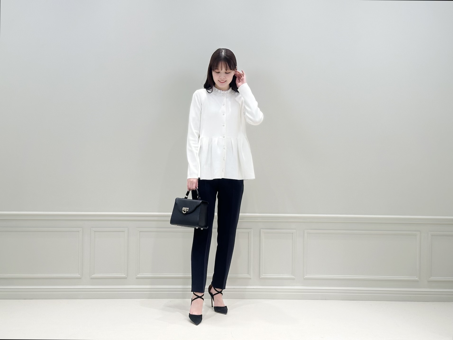 パールボタンが印象的なホワイトのニットに、同じくホワイトのフリルネックブラウスを重ねたレイヤードスタイル。ボトムスとバッグはネイビーでまとめることで、全体をすっきりと洗練された印象に仕上げました。淡色同士のレイヤードも、ネイビーを効かせることで甘くなりすぎず、上品にまとまります。