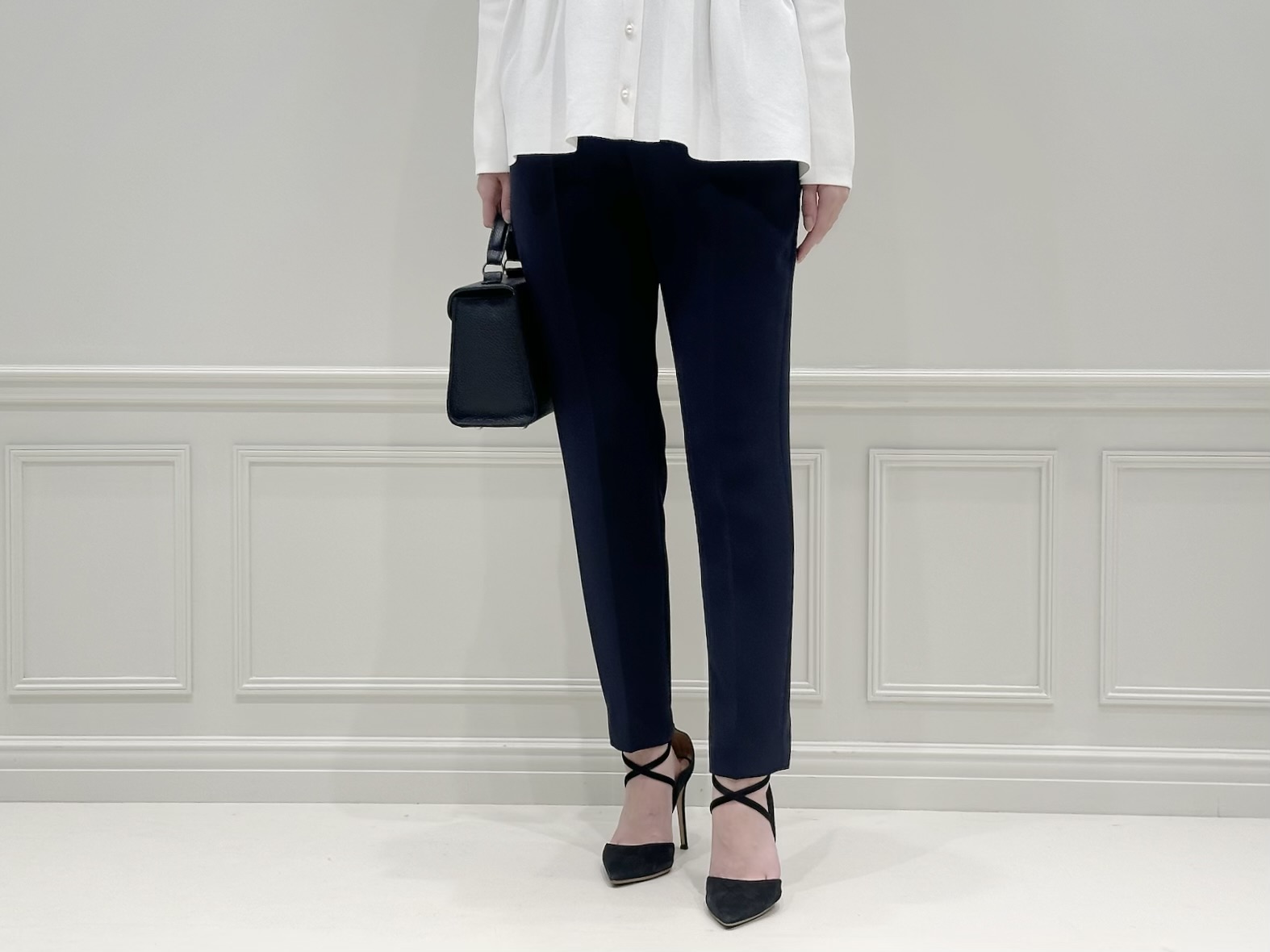 今回ボトムスには、あえてブラックではなくネイビーのテーパードパンツを合わせました。ホワイトのニットとブラウスを主役にしたコーディネートだからこそ、ネイビーを選ぶことで全体がやわらかく、上品な印象にまとまります。