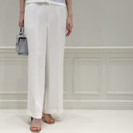 ダブルクロス素材ならではの程よい落ち感とドライな質感が、甘さのあるトップスをすっきりと受け止め、全体を大人っぽくバランス良く仕上げてくれます!