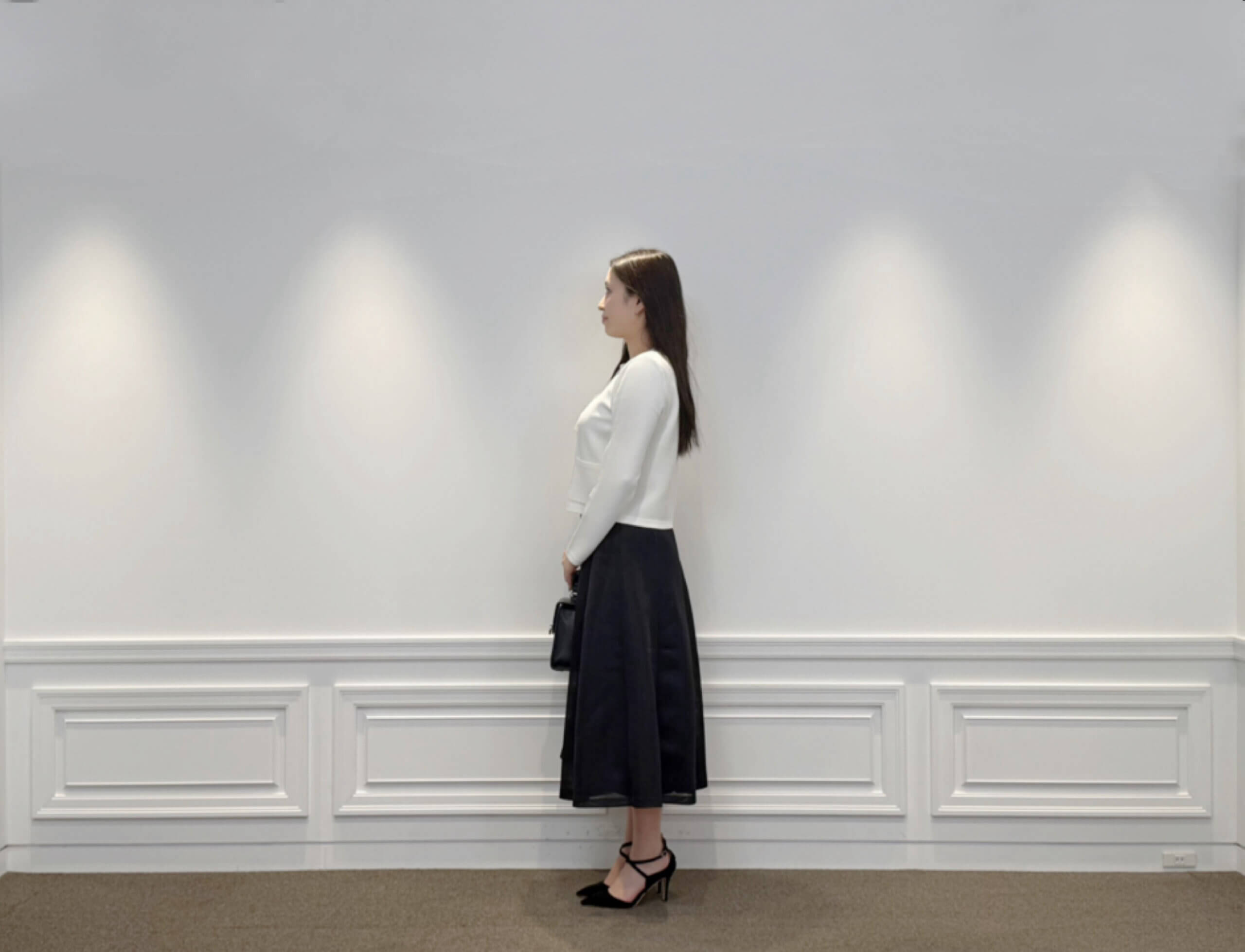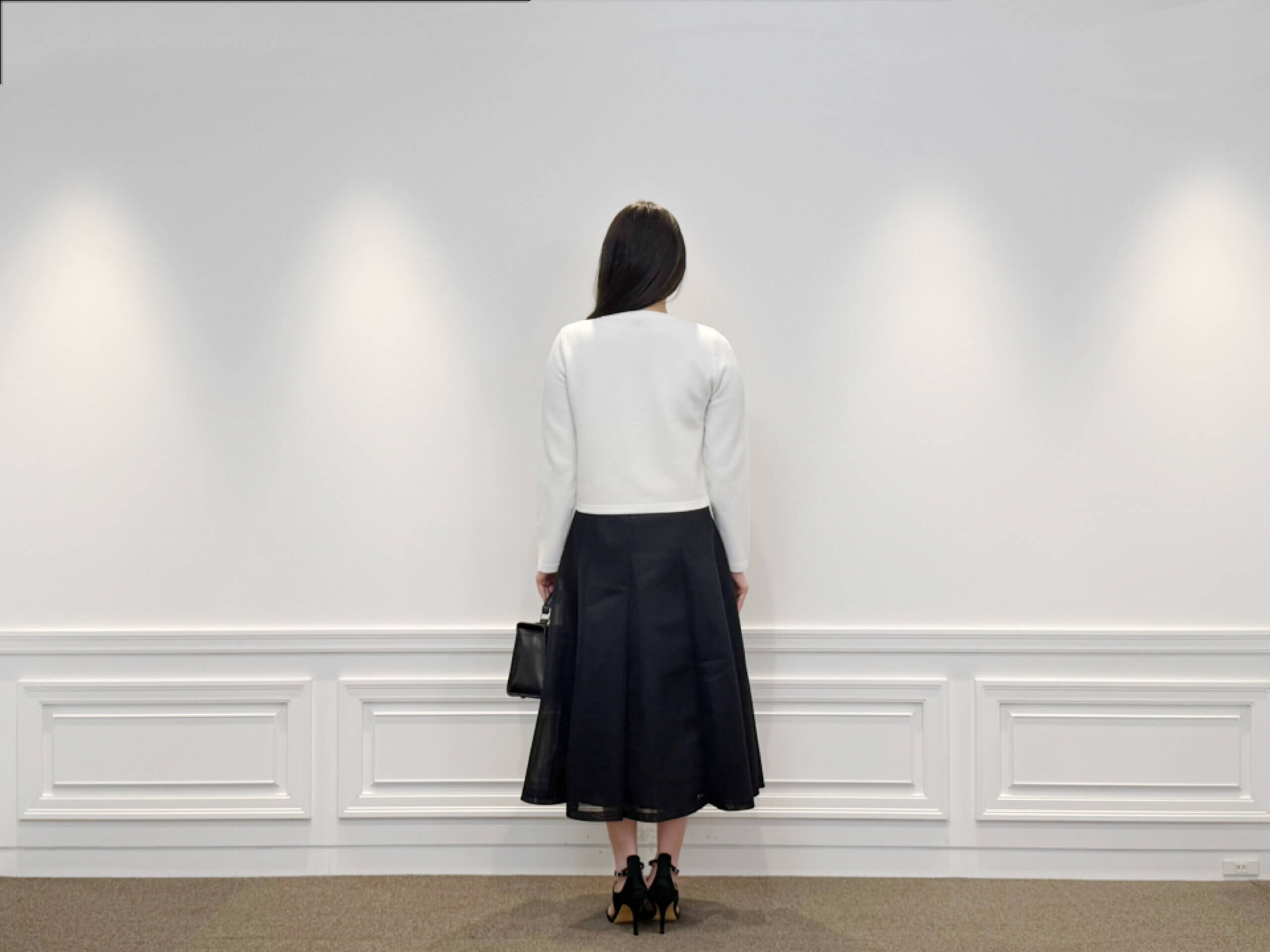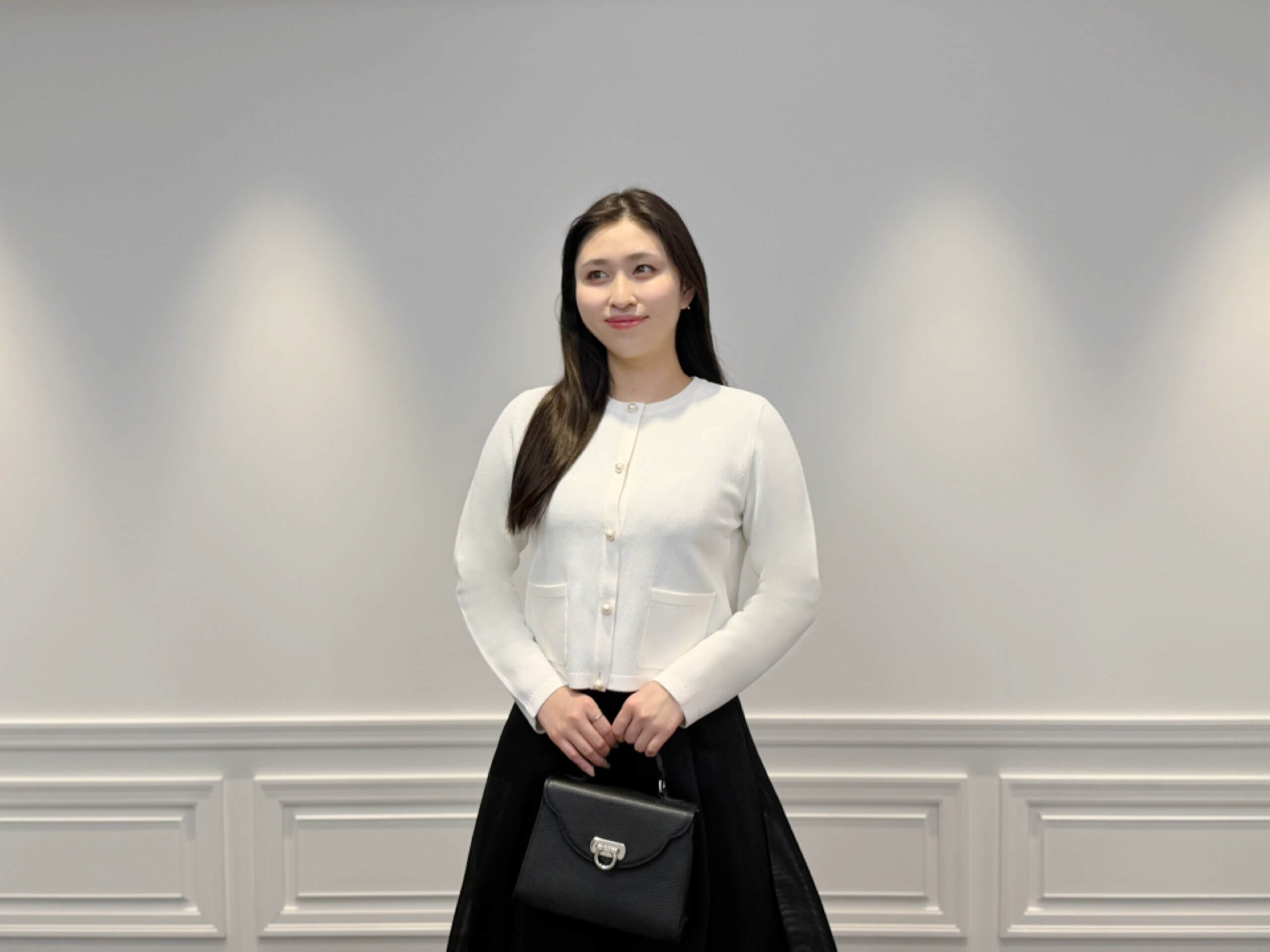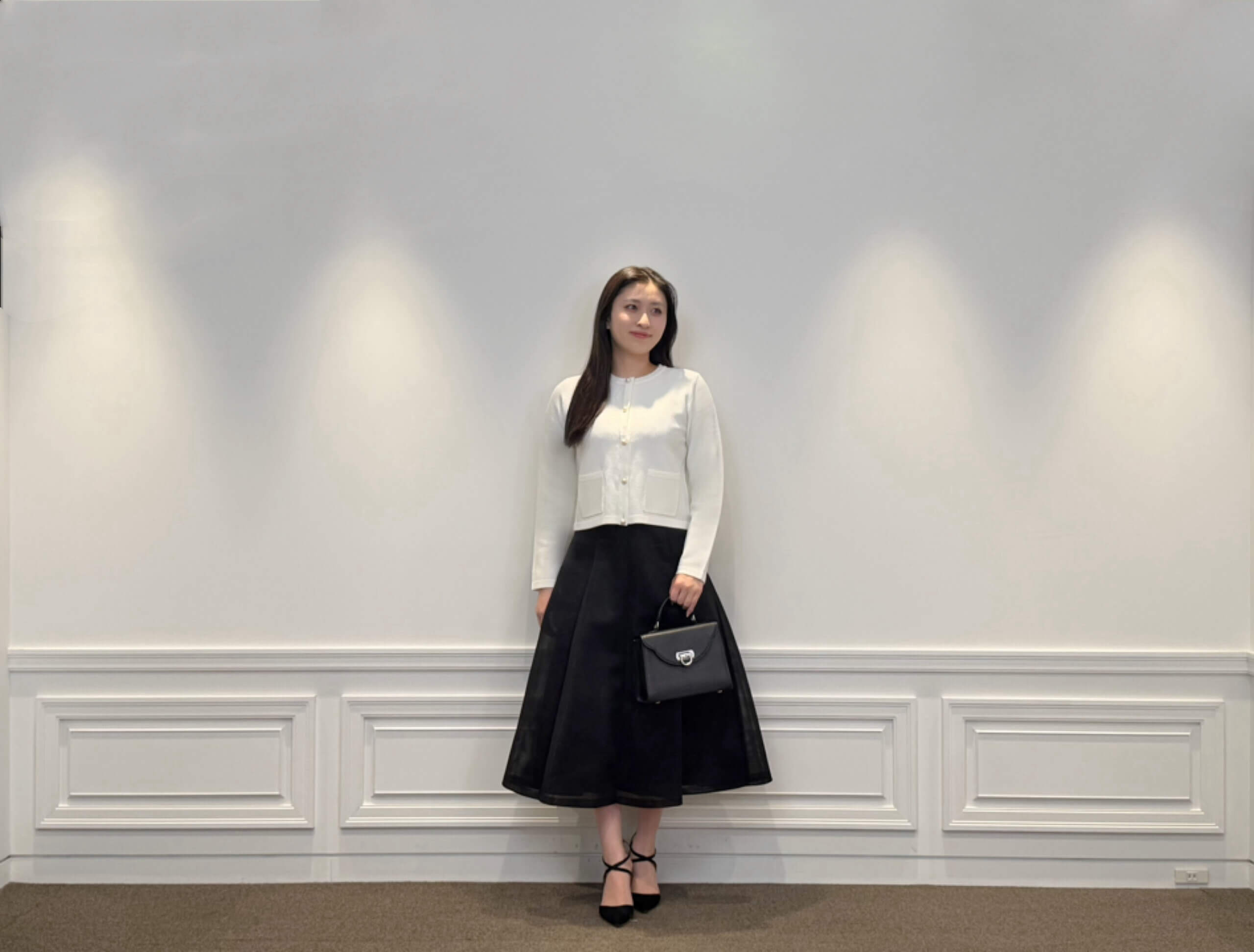 パールボタンが目を惹くニットカーディガンに、ふんわり広がるブラックのフレアスカートを合わせたシンプルなスタイリング。白×黒の王道配色ですが、素材感のおかげで重くなりすぎず、軽やかな印象で着られるのが魅力です。