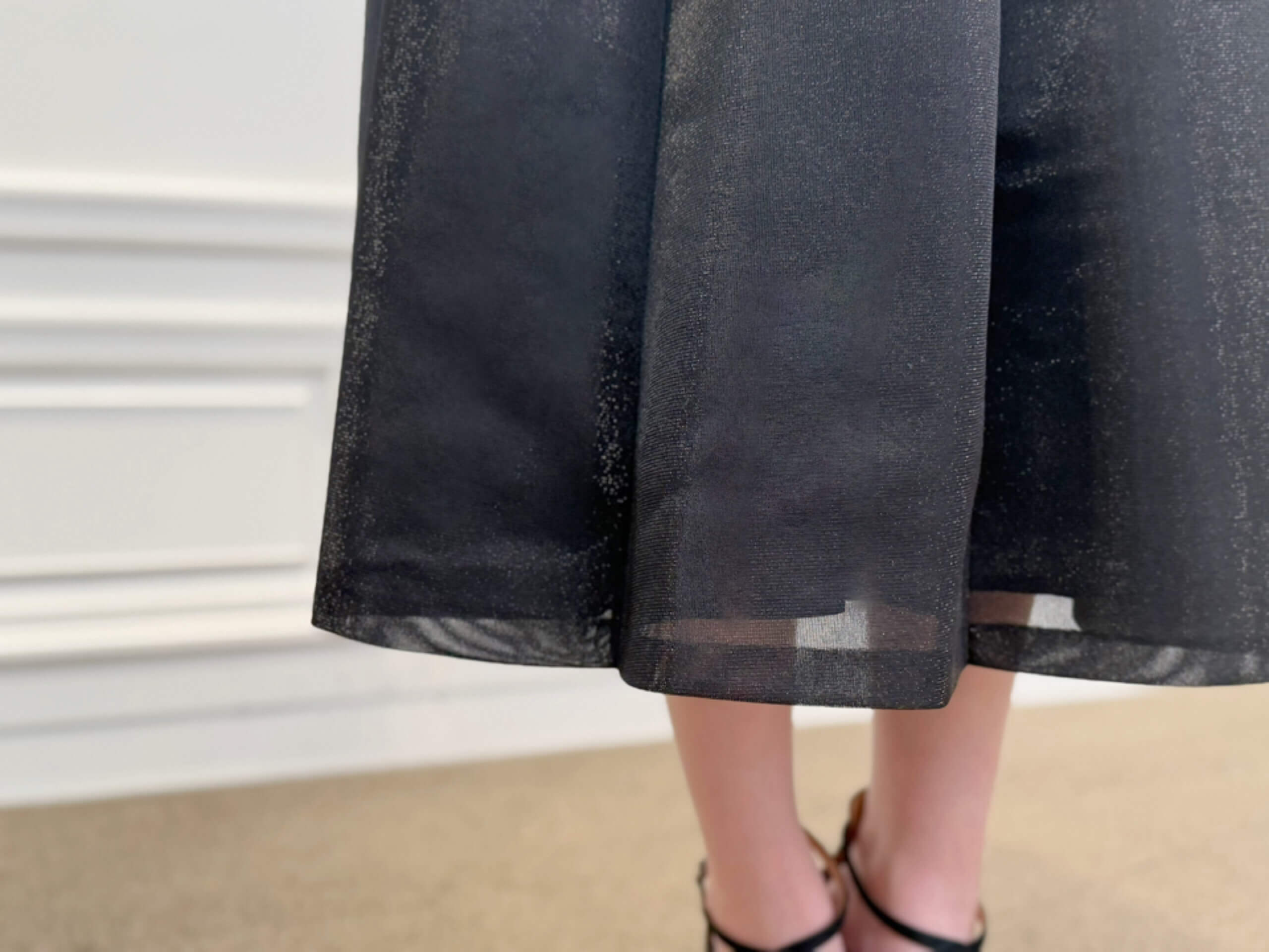 動くたびにふわっと広がる感じがとても綺麗で、ブラックでも重たく見えないところがこれからの季節にぴったりだなと感じました。
