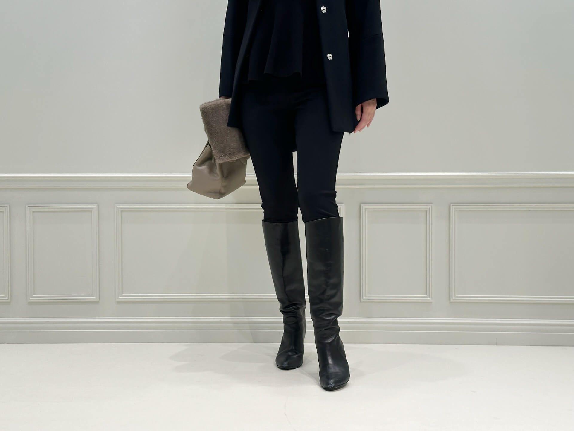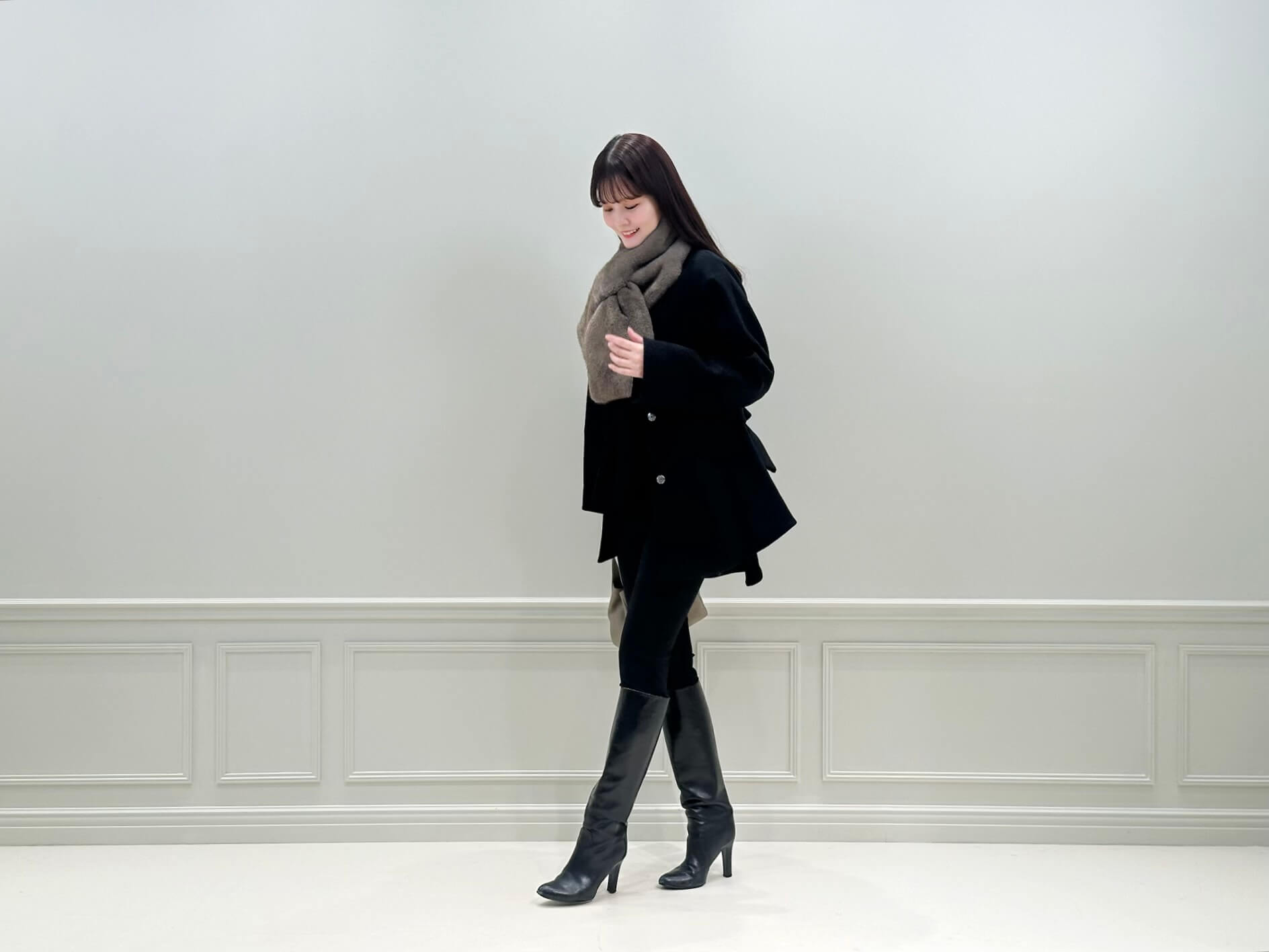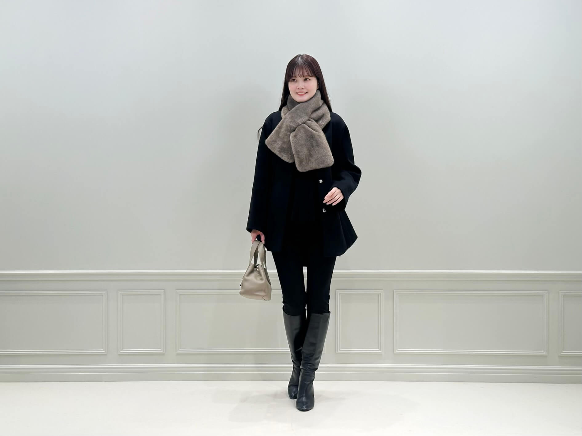 ペプラムシルエットのニットを合わせ、レギンス×ロングブーツで全体をコンパクトにまとめることで、ミドル丈コートでも重たく見えないバランスを意識しました。さらに、モカカラーのファーストールをプラスして、奥行きのある冬スタイルに!