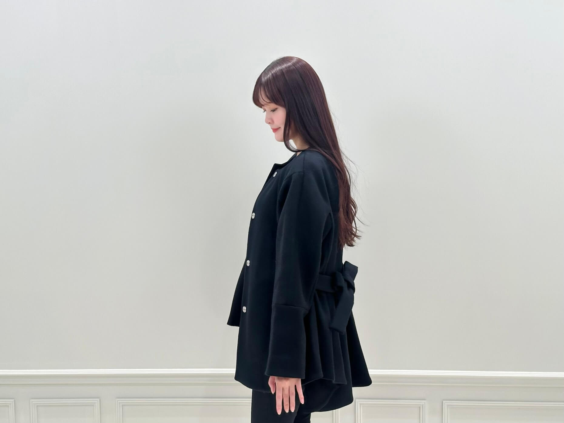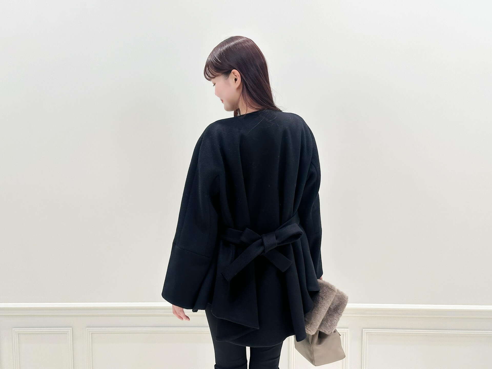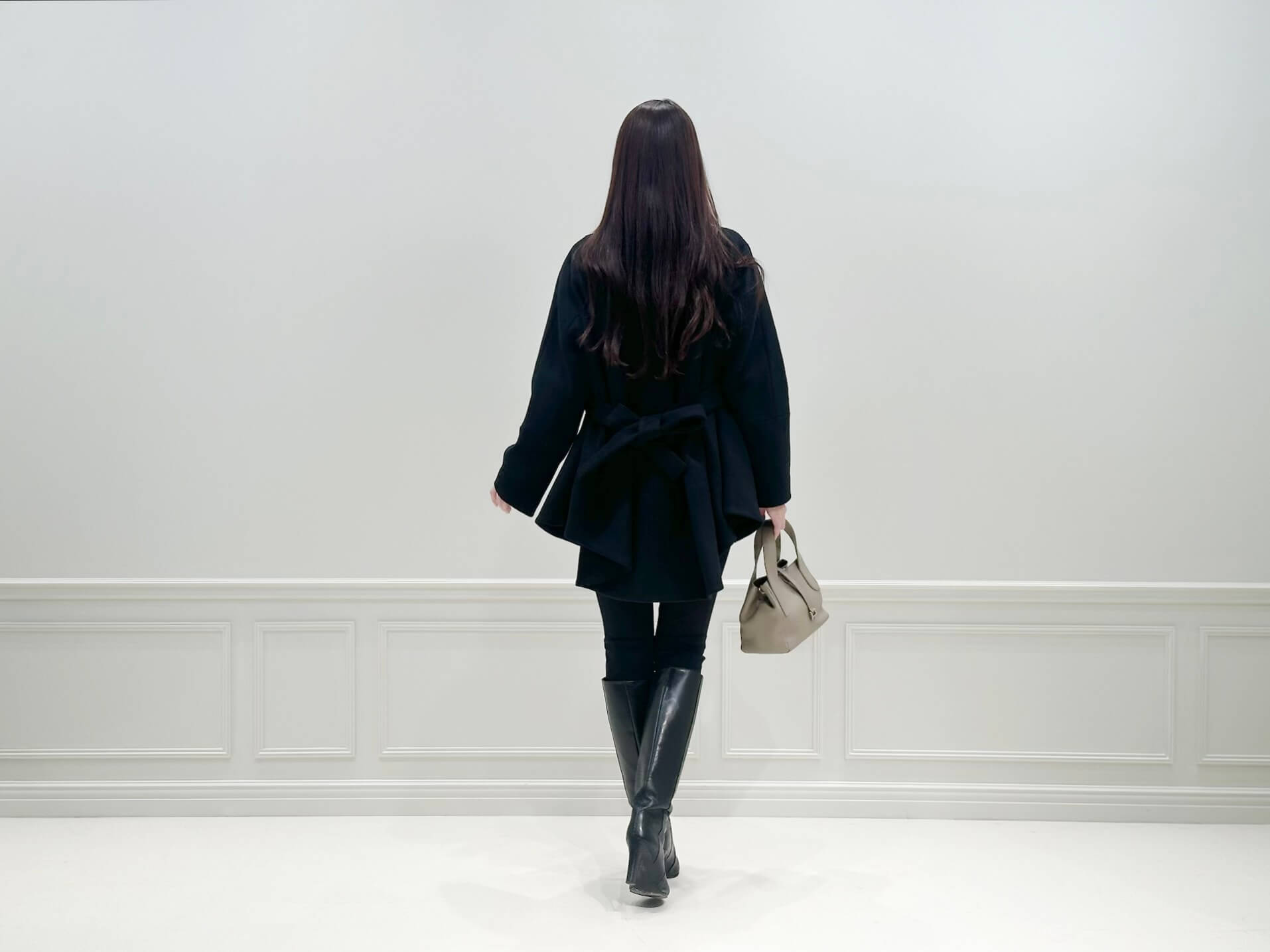 リボンベルトは後ろで結び、フロントはすっきりとしたIラインを意識。コートの上質な素材感が引き立ち、さっと羽織るだけで大人の余裕を感じさせる佇まいに。