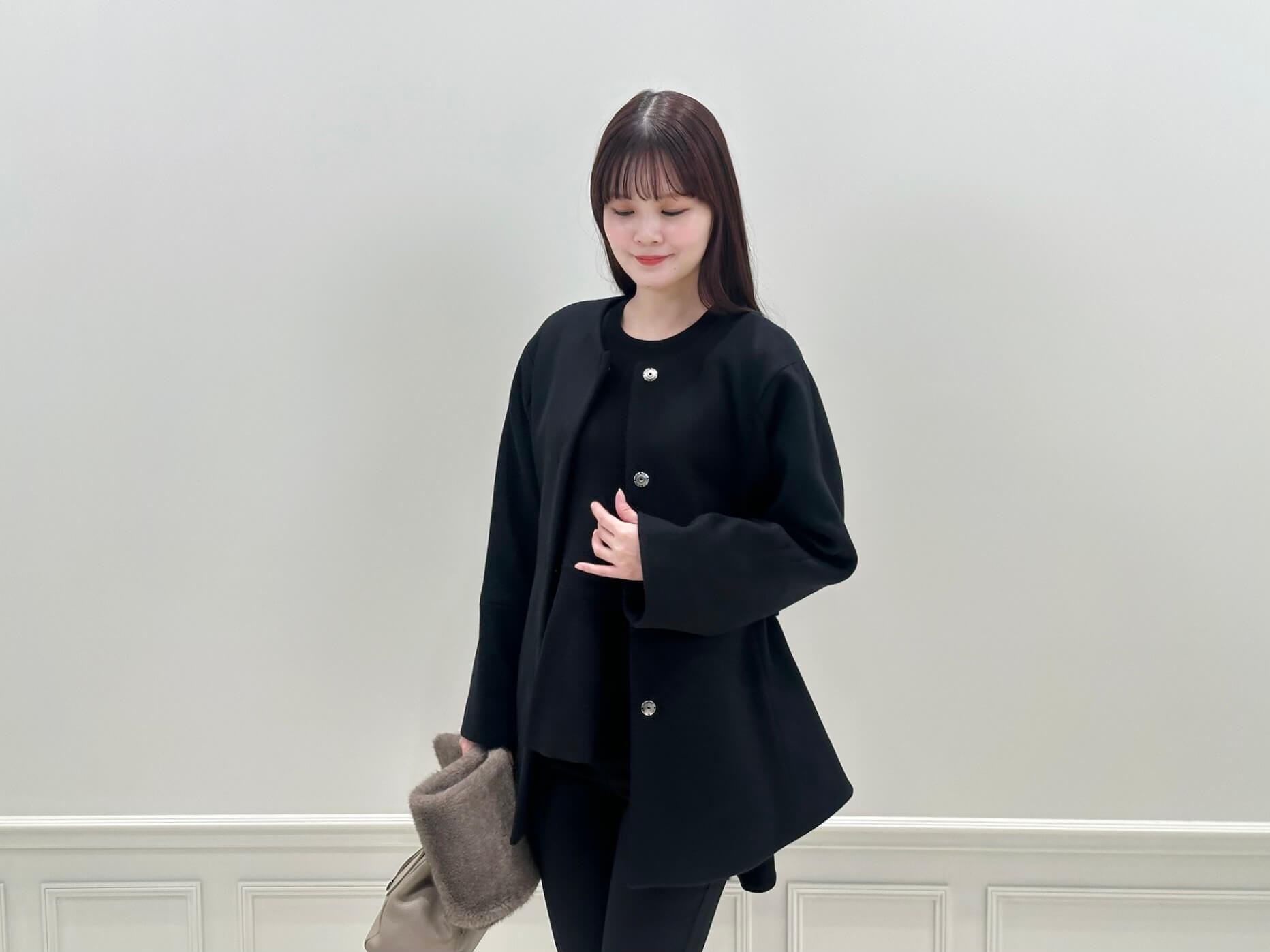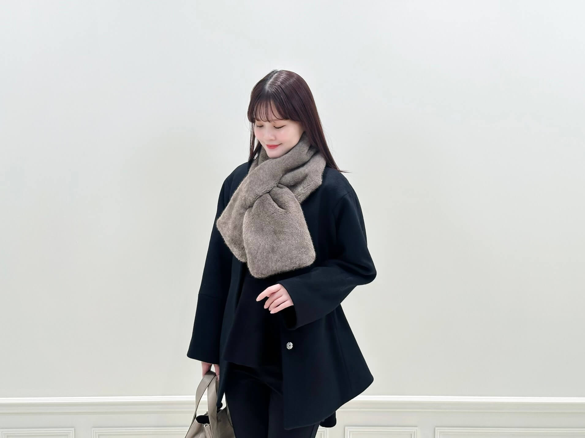 コートのブラックに柔らかなニュアンスを添え、顔まわりを華やかに演出してくれます。前開けスタイルでも防寒性を高めつつ、アクセサリー感覚で季節感を楽しめるアイテムです!