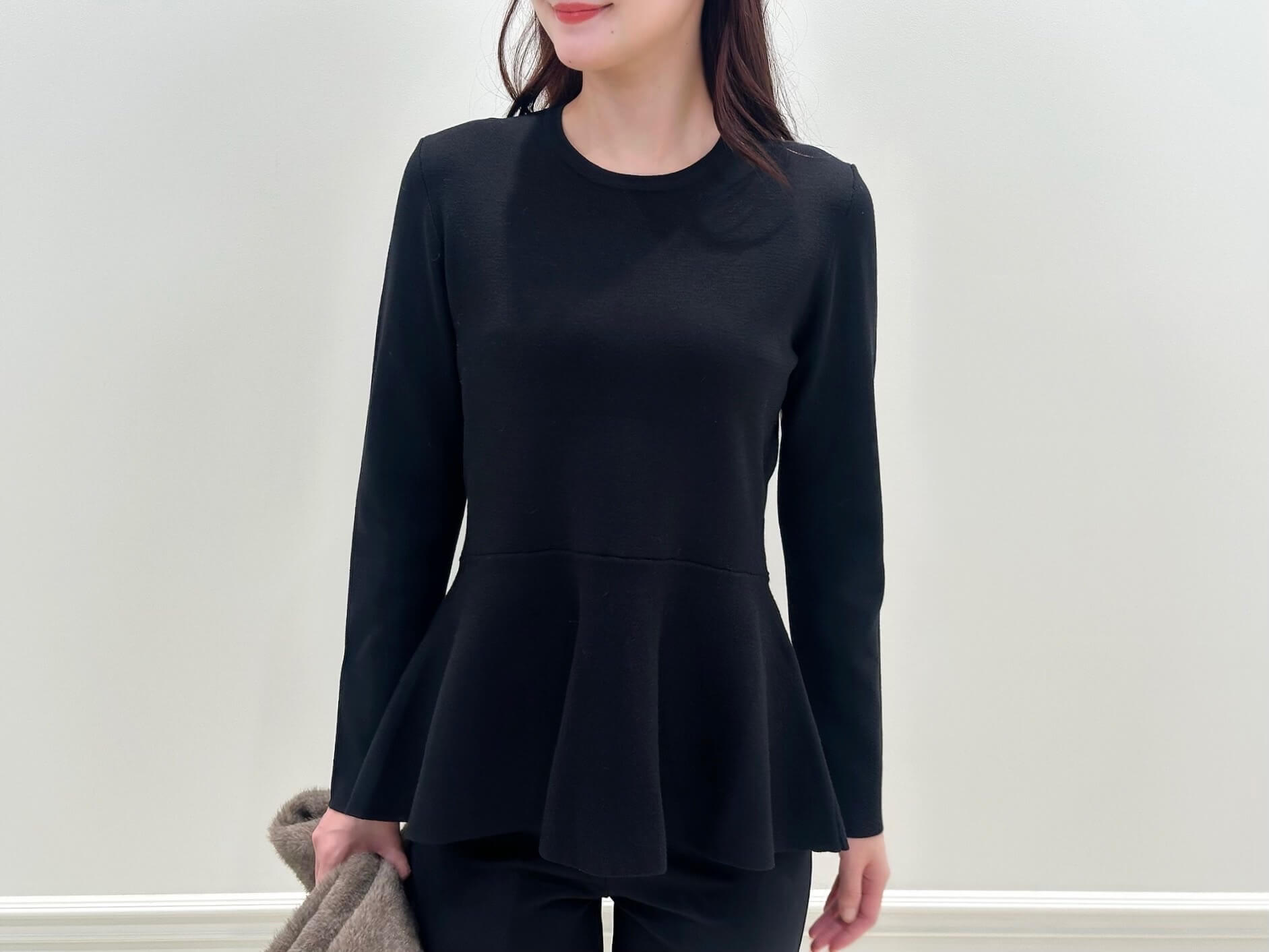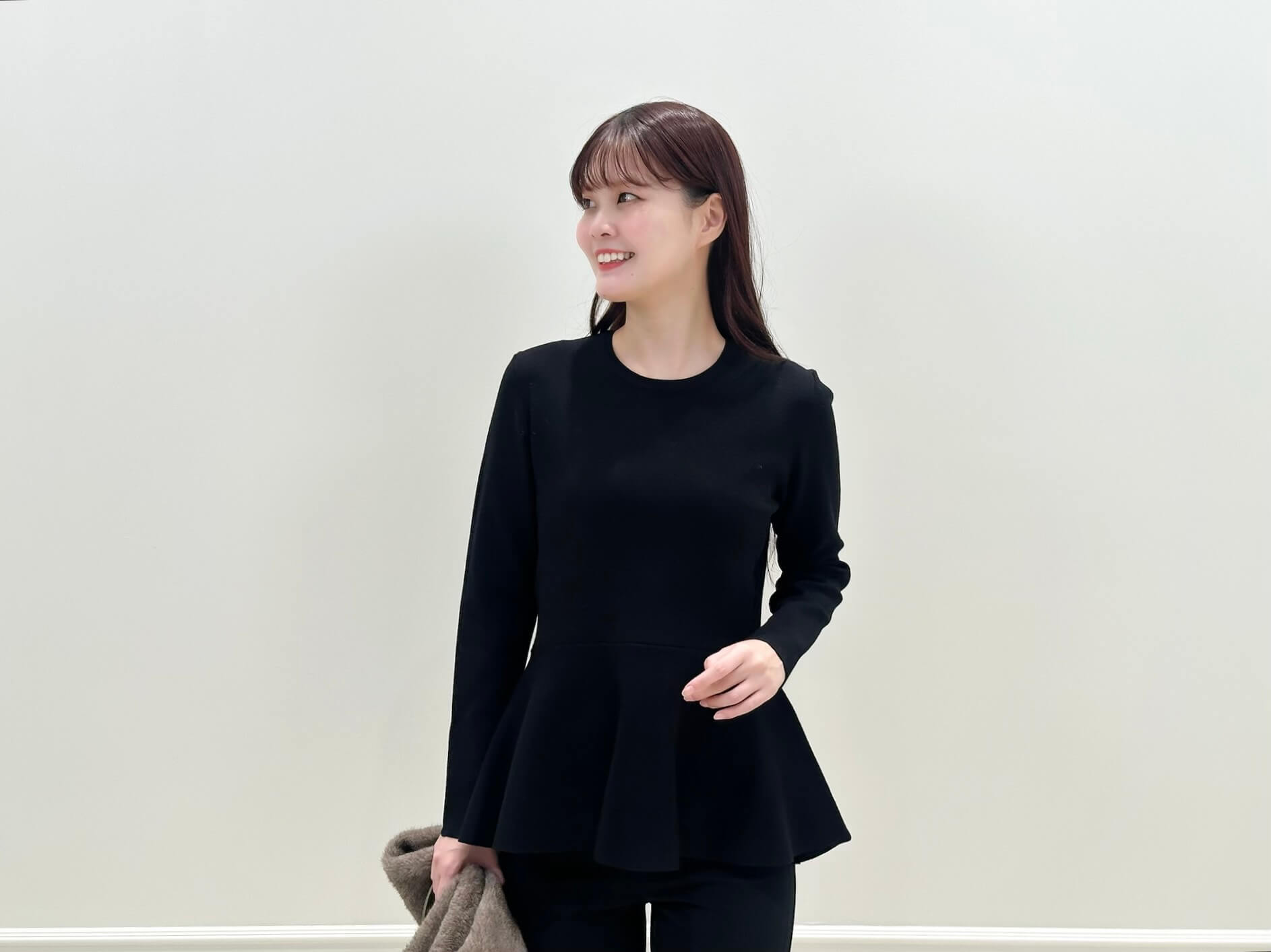 ニットはフラットで上品な編地と、立体的なペプラムシルエットが特徴で、レギンスのような細身ボトムとも好相性。腰まわりをさりげなくカバーしつつ、女性らしいラインを作ってくれるので、アウターを脱いだときもきちんと感をキープできます。