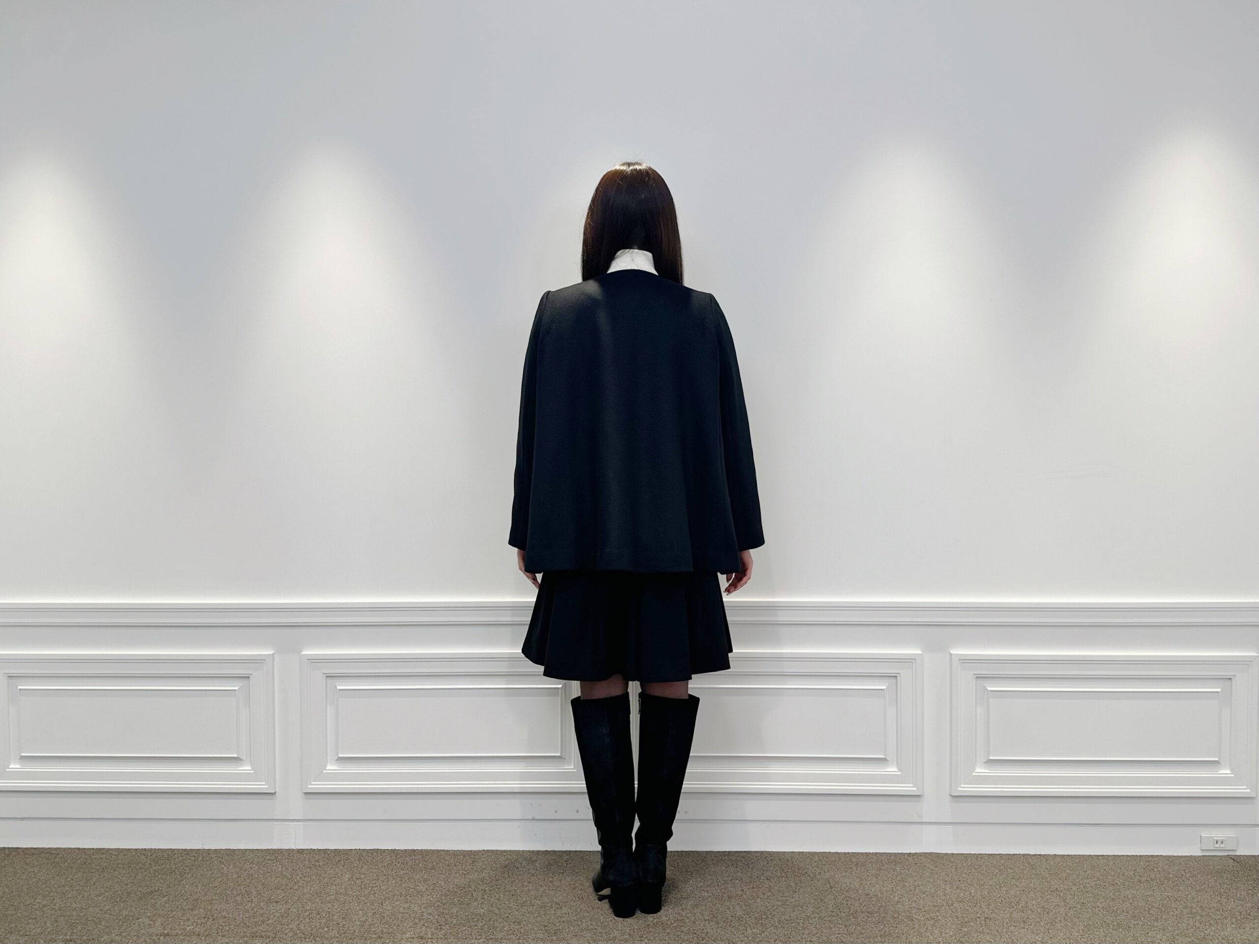 上質なSuper170’sウールを贅沢に使用したミドル丈のノーカラーコートは、羽織るだけで洗練された佇まいが完成する一着。なめらかで高級感のある素材が、通勤やきちんと感の欲しいシーンにも自然とマッチします。