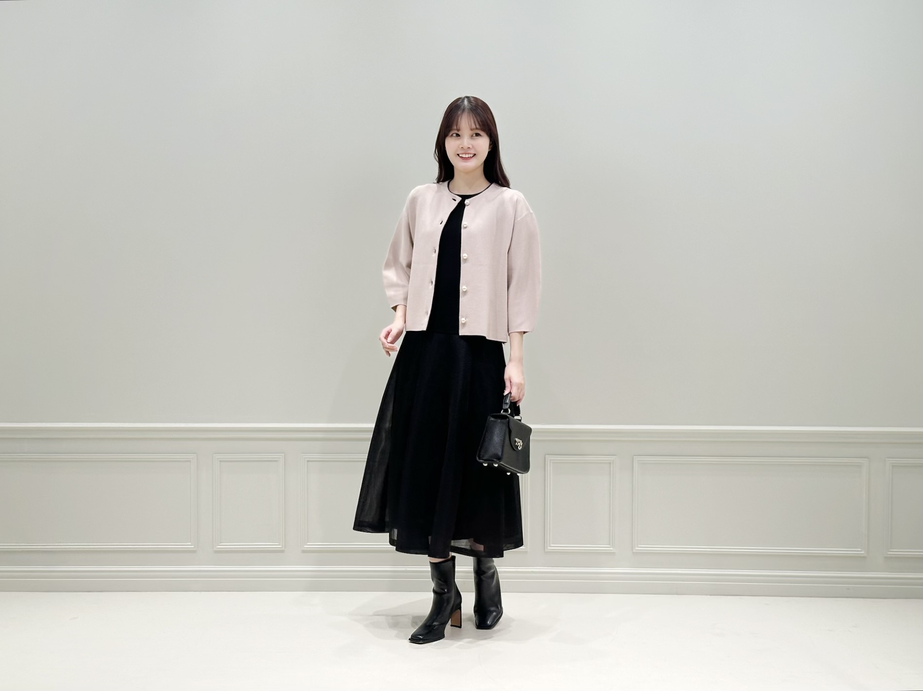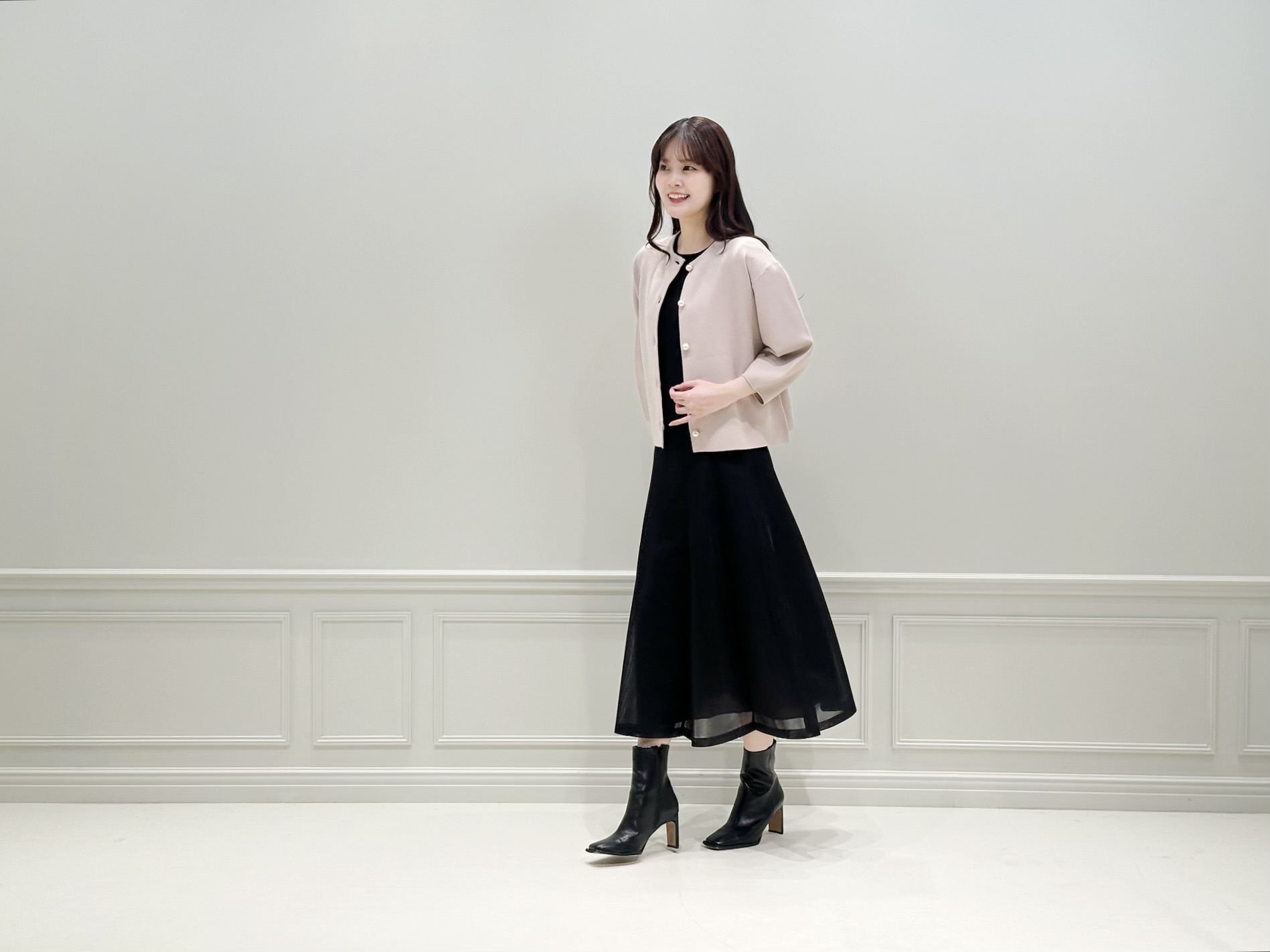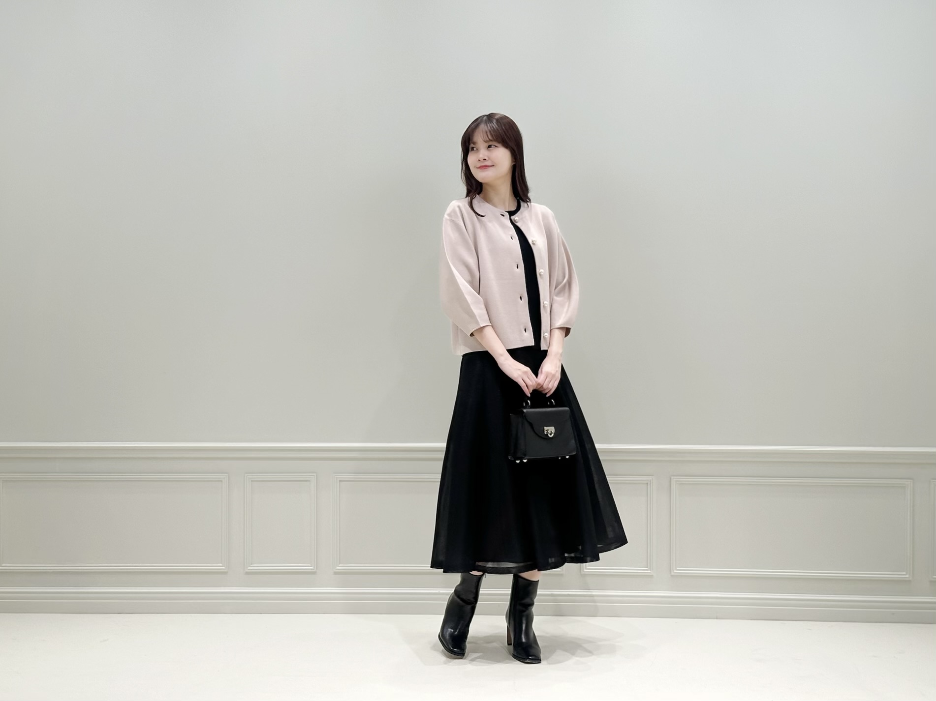 色数を抑えることで、ニットジャケットの存在感が際立ち、全体に統一感のあるエレガントな印象に仕上げました。きれいめなお食事シーンや、少しきちんとしたい女子会、休日のお出かけにもおすすめのコーディネートです。