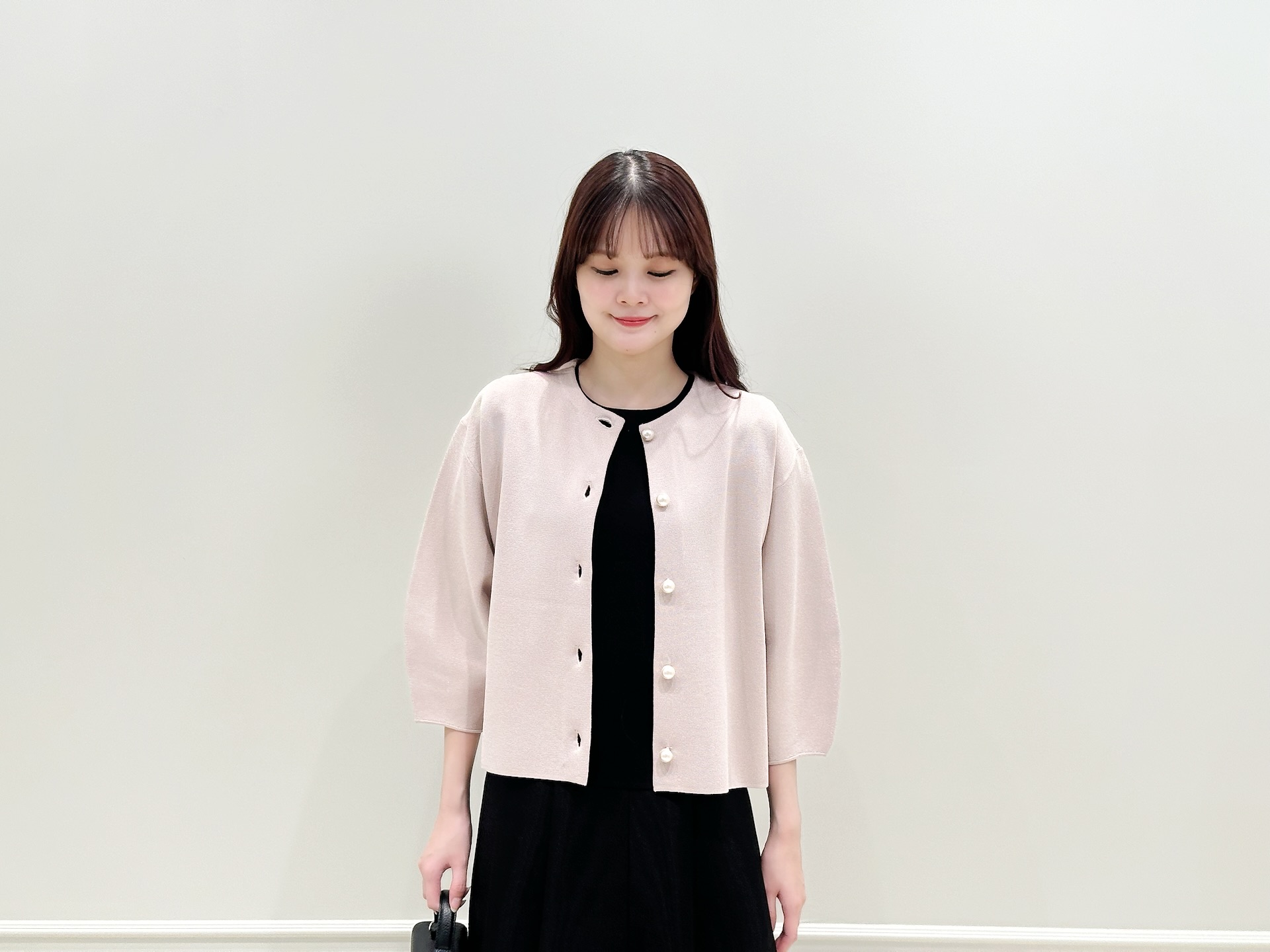 立体感のあるコクーンスリーブと、大きめのパールボタンが、羽織るだけで自然と華やぎをプラスしてくれます。きちんと見えするのに、ニットならではの柔らかさがあり、堅すぎない雰囲気を演出できるのも嬉しいポイント!