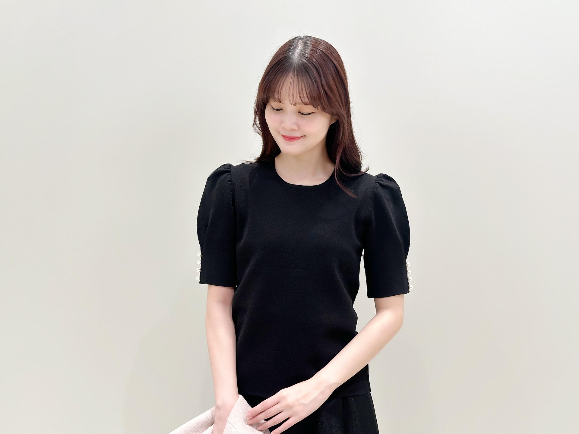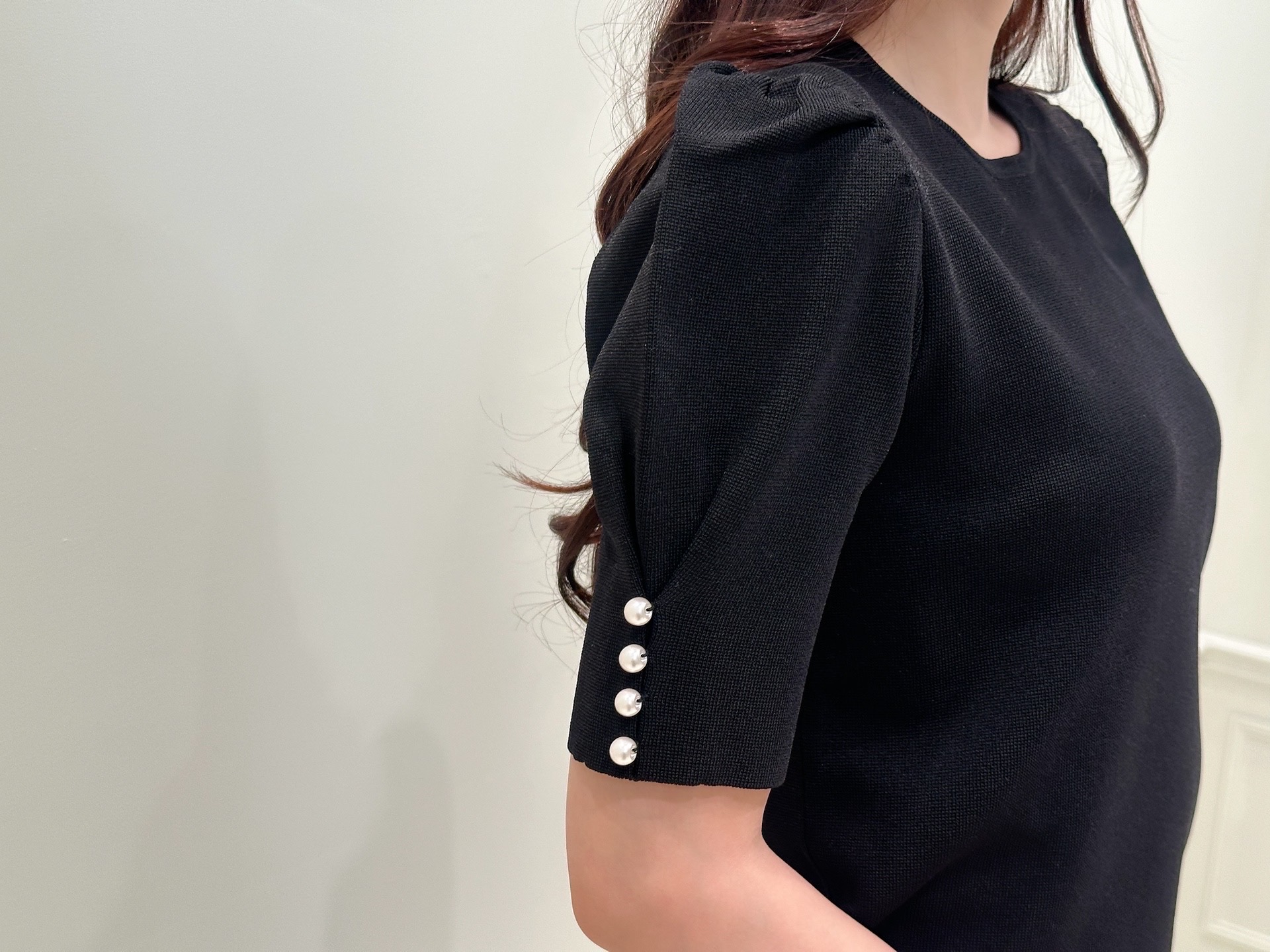 パフスリーブと袖口のパールボタンが、シンプルな中にもさりげない可愛さをプラス。ジャケットのインナーとしても映え、脱いだときもきれいに決まるデザインなので、シーンを選ばず活躍してくれます!同系色でまとめることで、全体にまとまりが生まれ、上品さがより引き立つスタイリングに。