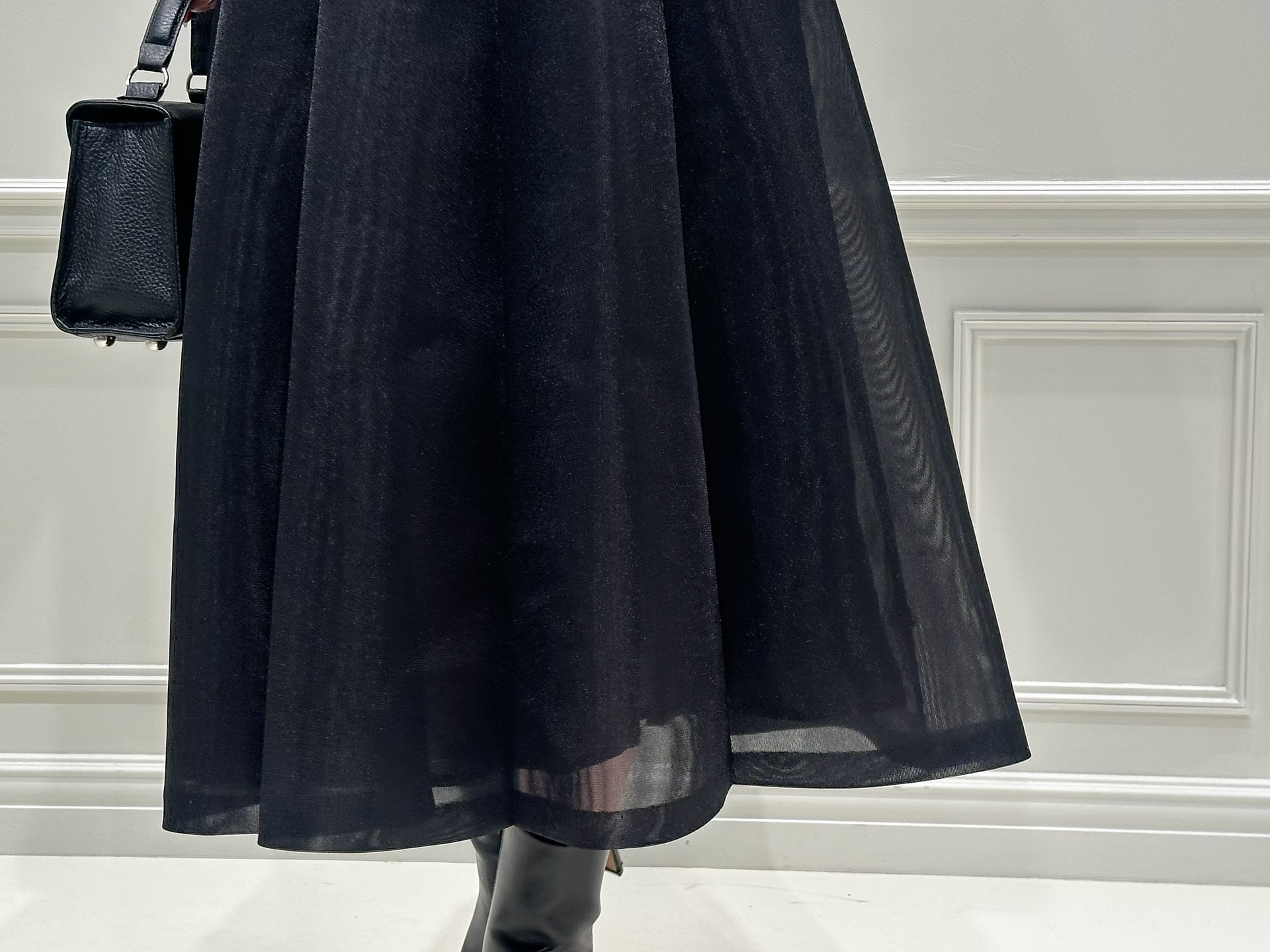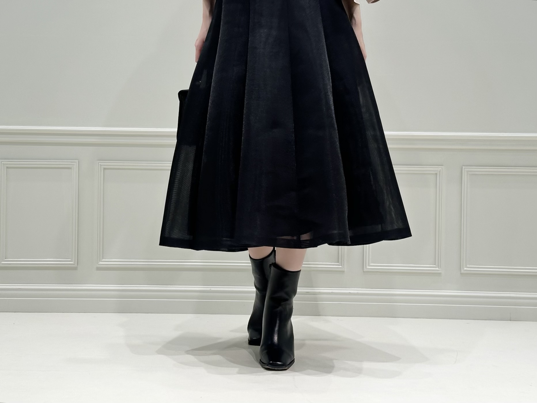 シアー切替のフレアスカートは、ハリ感と透け感のバランスが絶妙。ブラックでも重たく見えず、動くたびに軽やかな表情を楽しめるのが魅力です!