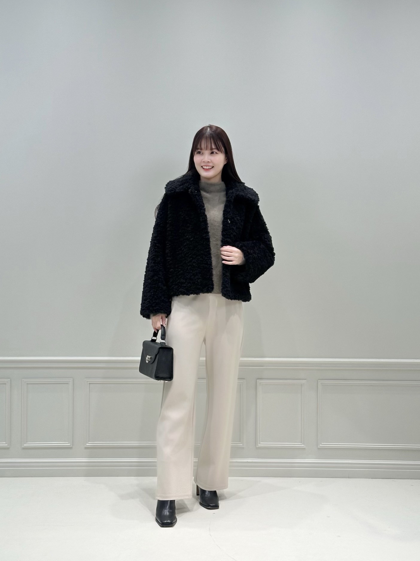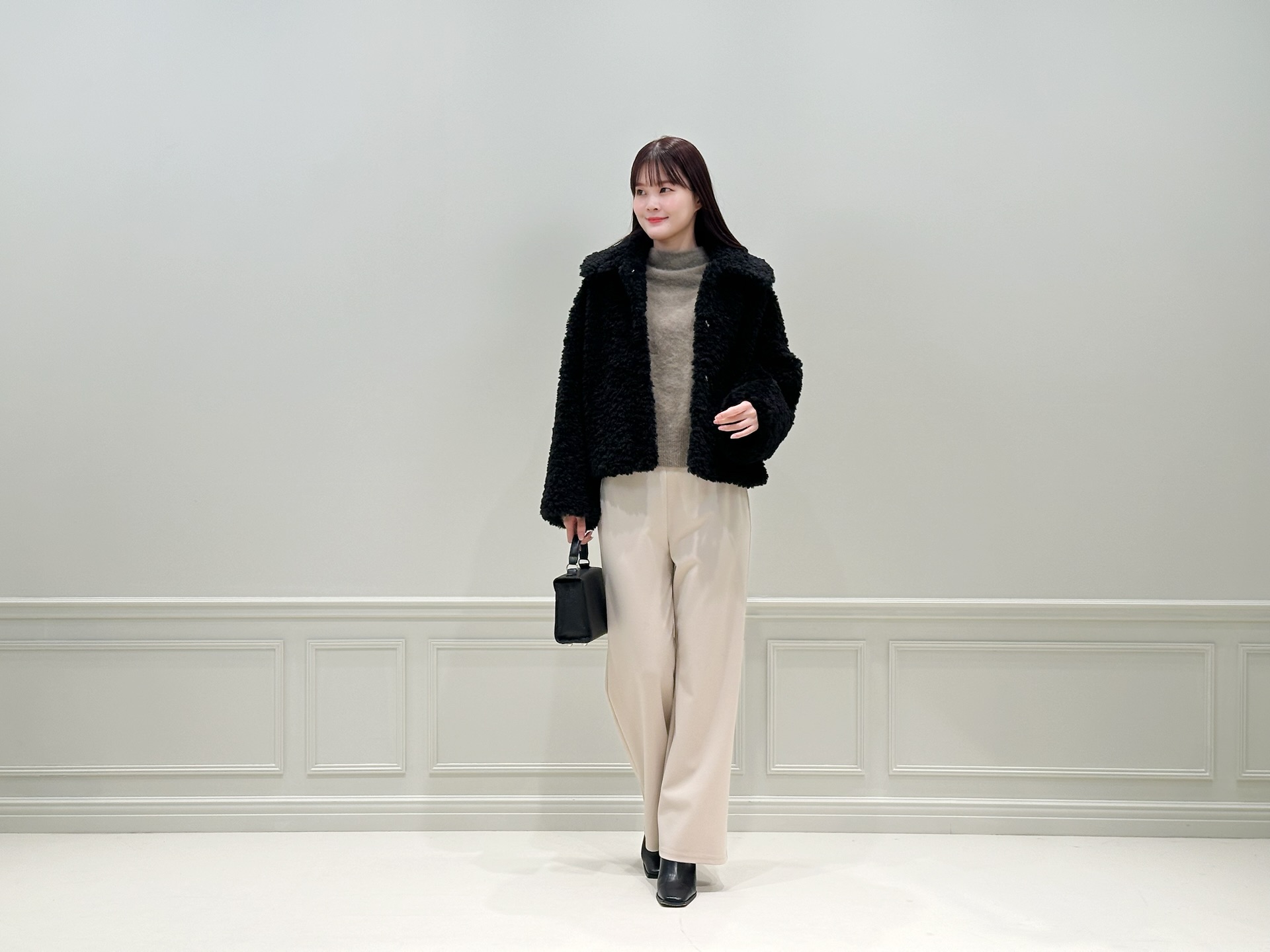 アウターは、ふんわりとしたボア素材が目を惹くショートコート。