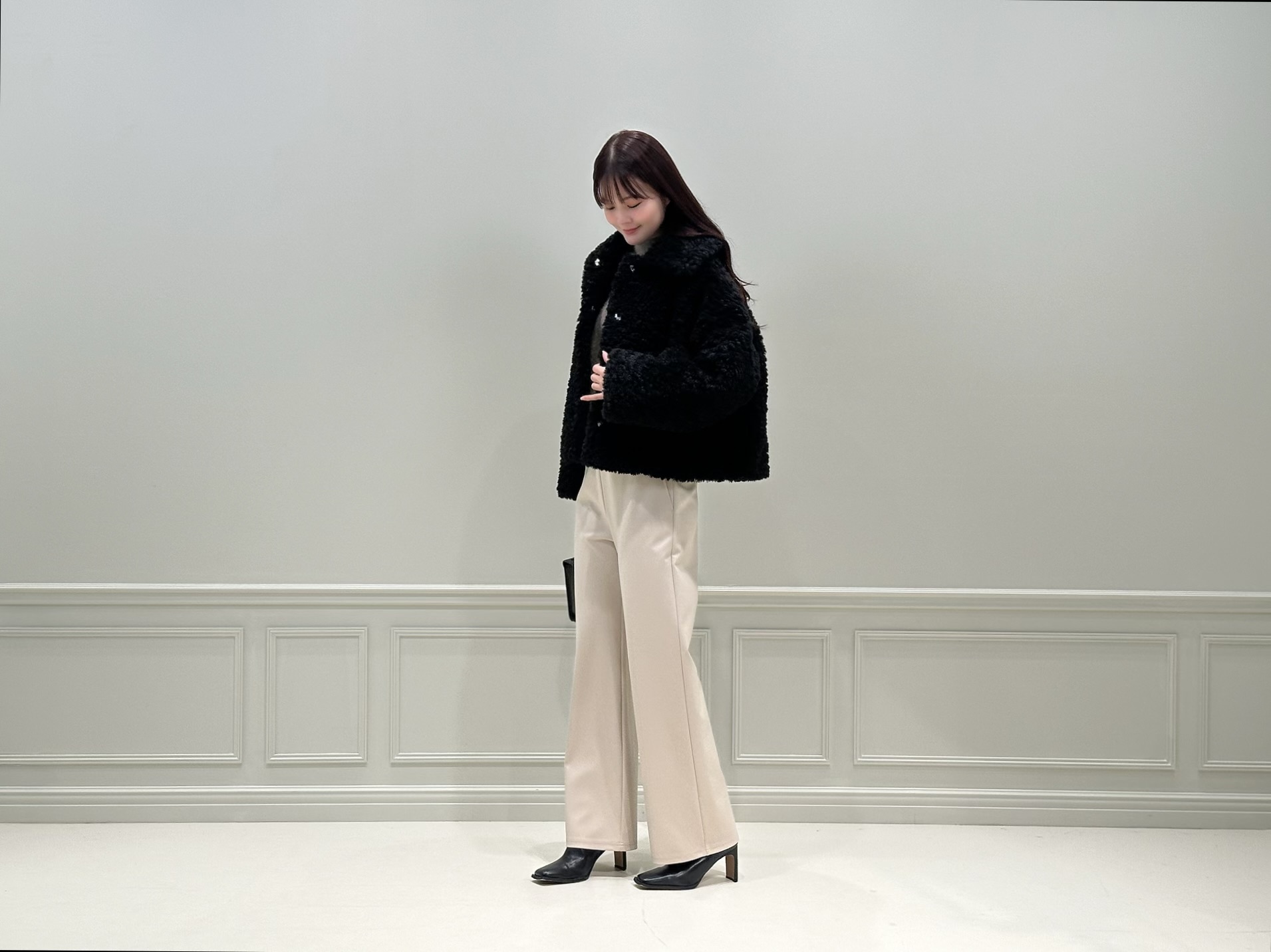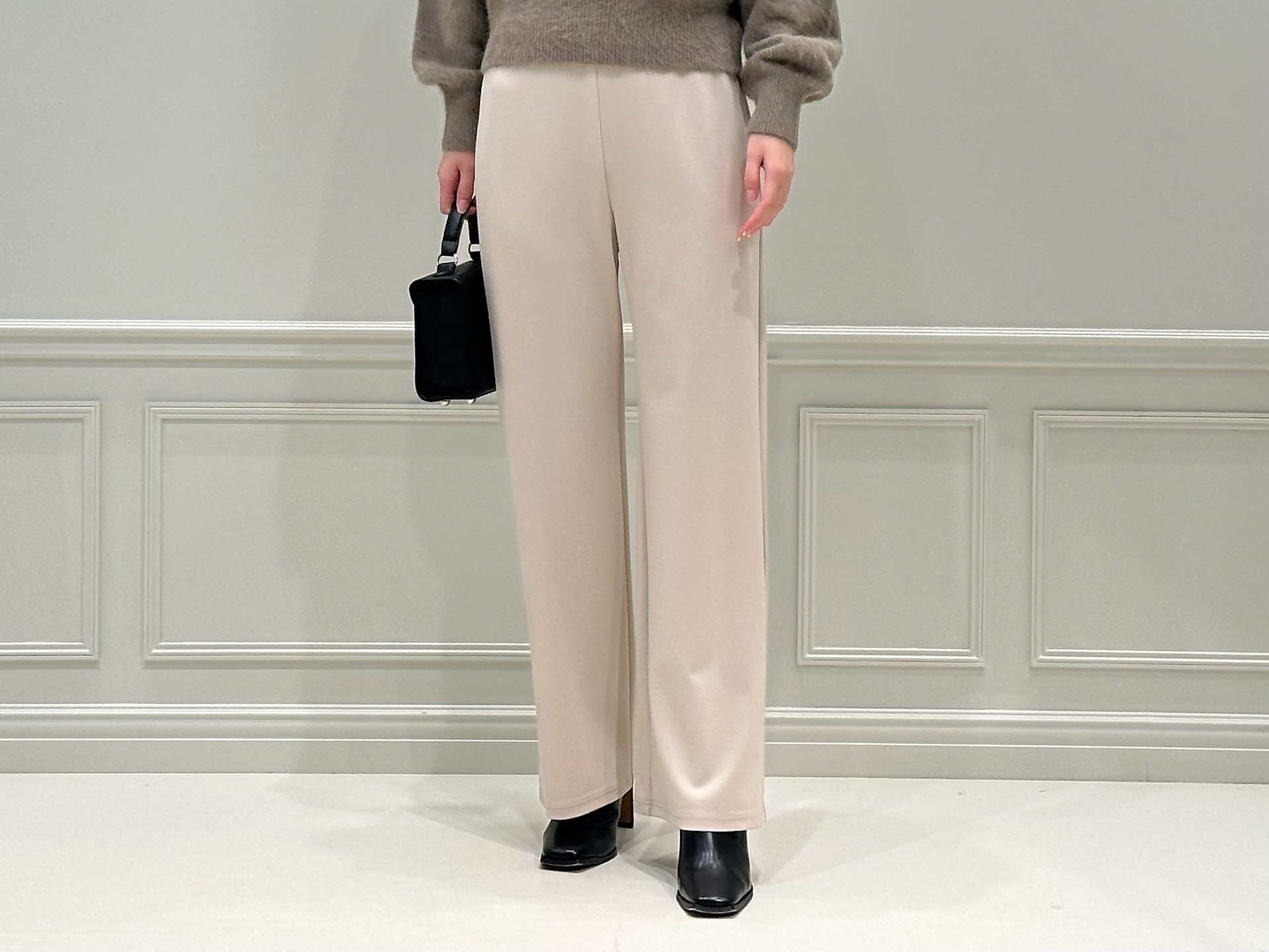 新色として登場したストレッチポンチストレートレギンスパンツの〈ベージュ〉を中心に、トップスはやわらかなモカ、そしてアウターとブーツはブラックで上下を挟むように配置しました!