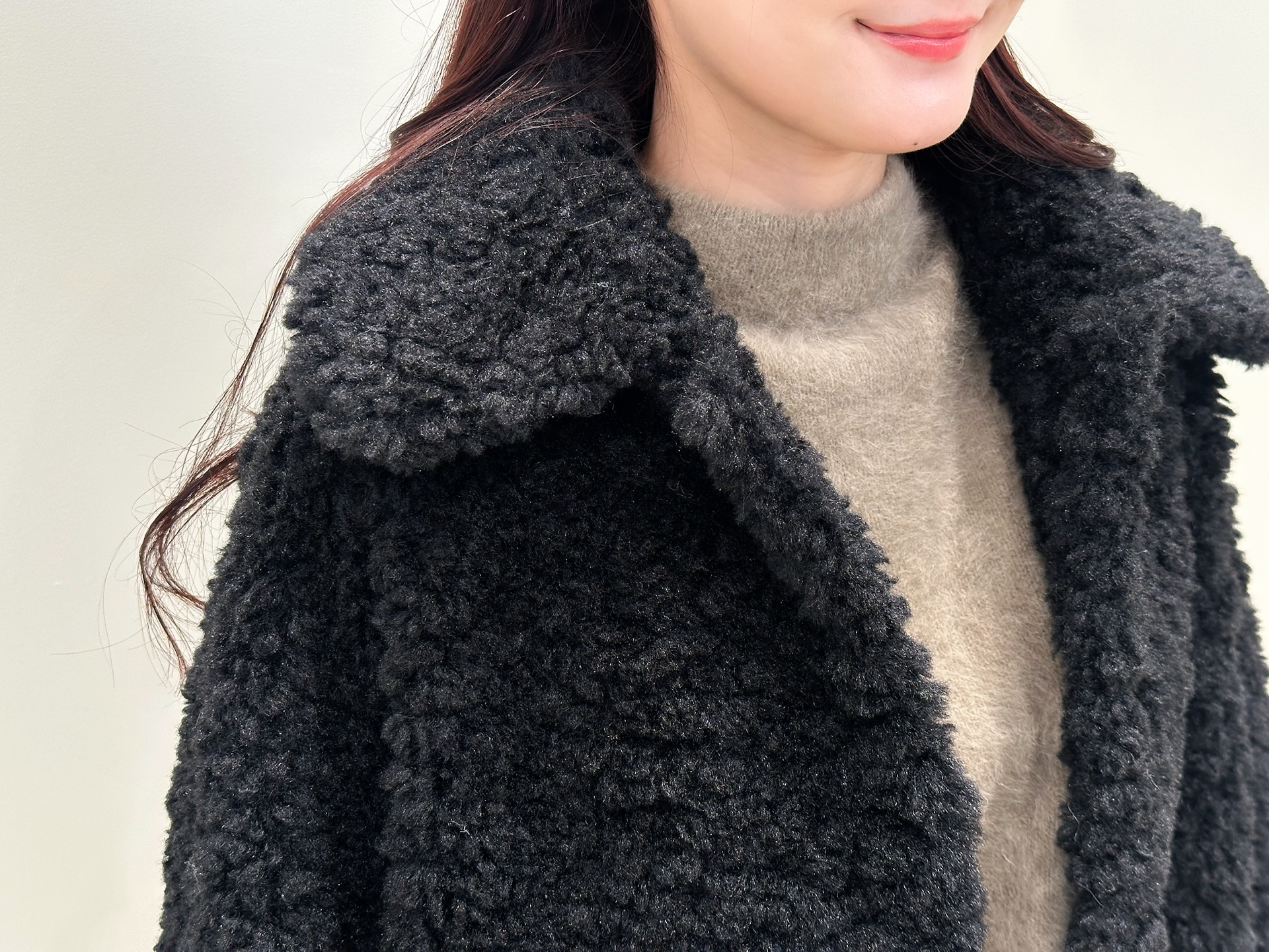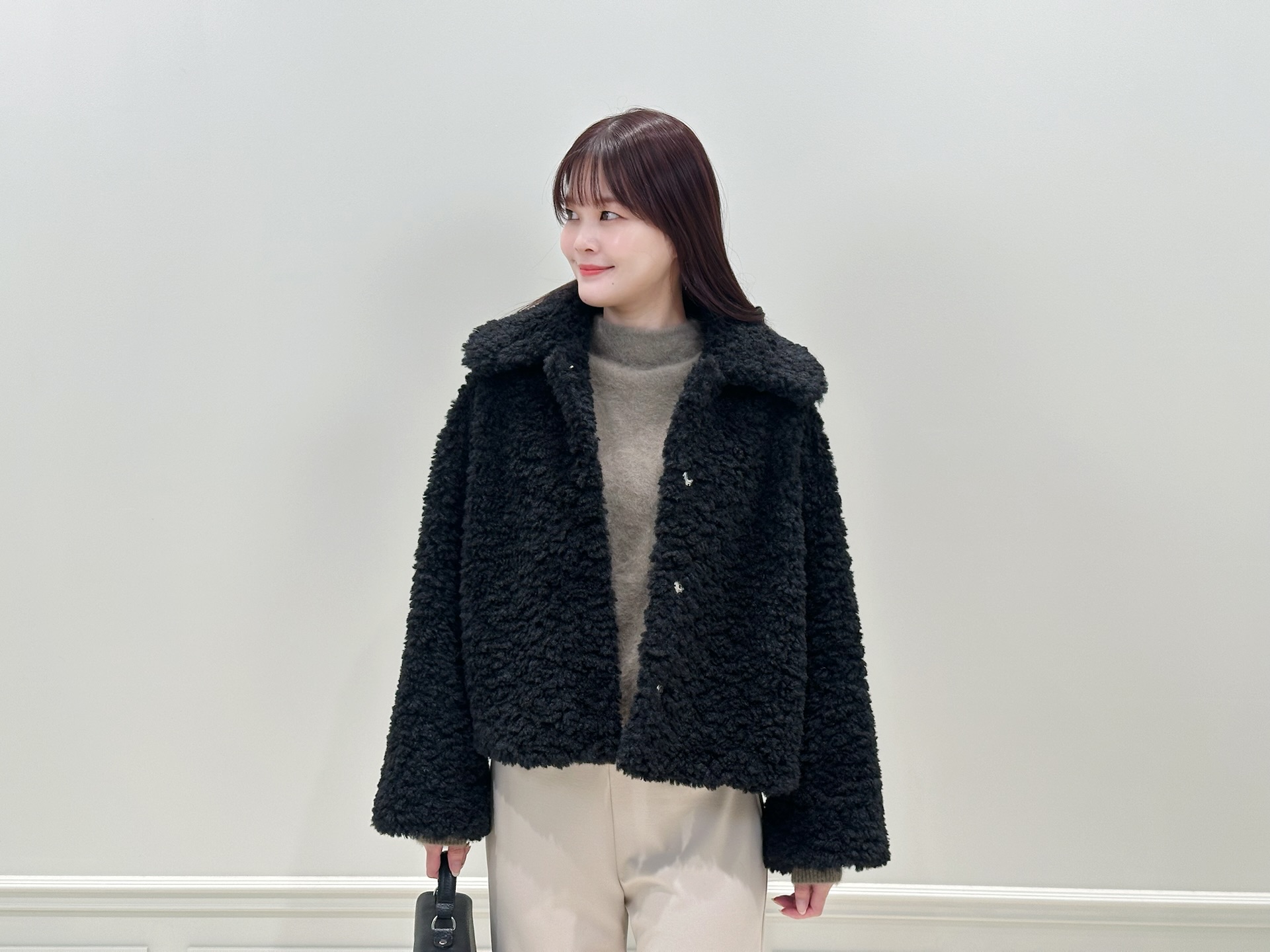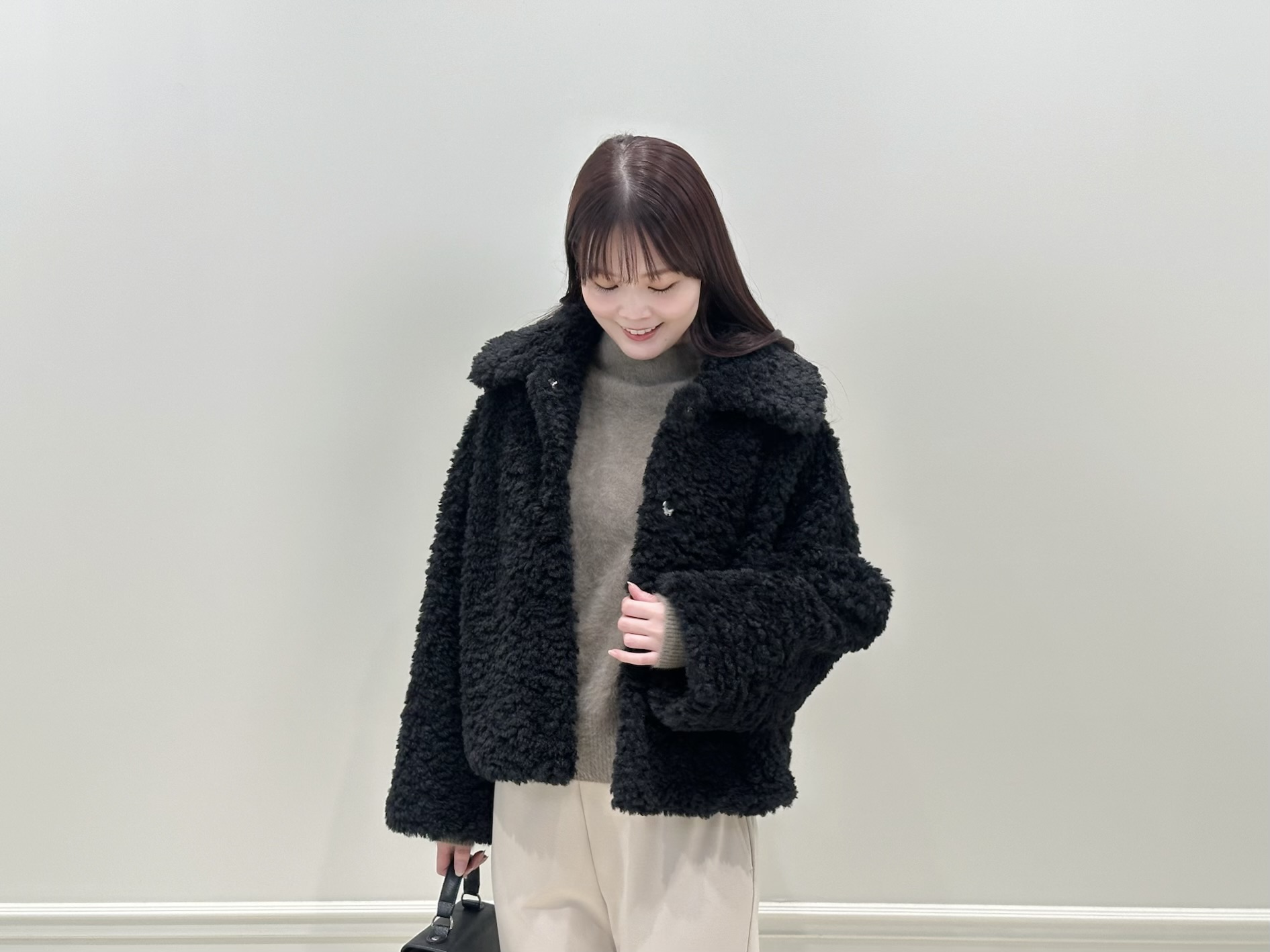 もこもことした表情がシーズンムードを高めてくれつつ、ショート丈なので重たく見えず、すっきりとしたバランスが叶います。大きめの襟が顔まわりを華やかに見せてくれるのもポイントで、さっと羽織るだけで自然とスタイリングが決まる一着!