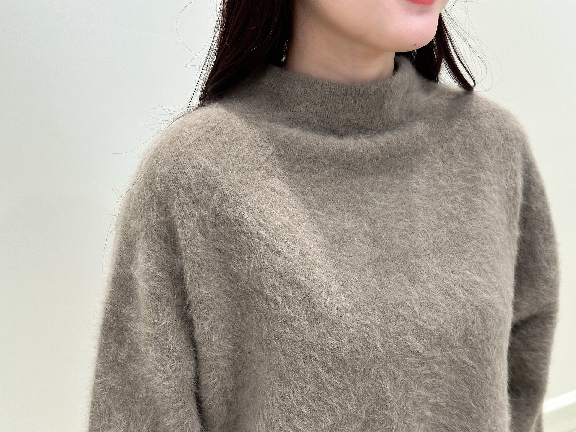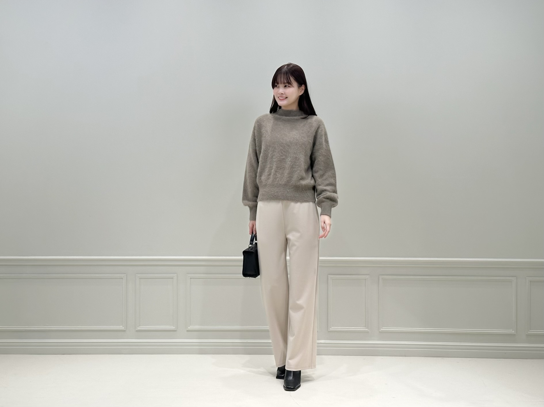 アウターを脱いだときに現れるのは、モカカラーのハイネックパフスリーブニットと、ベージュのストレートレギンスパンツ。ニットは、カシミヤブレンドならではのふんわりとした質感が魅力で、肌に触れた瞬間から心地よさを感じられる一枚。