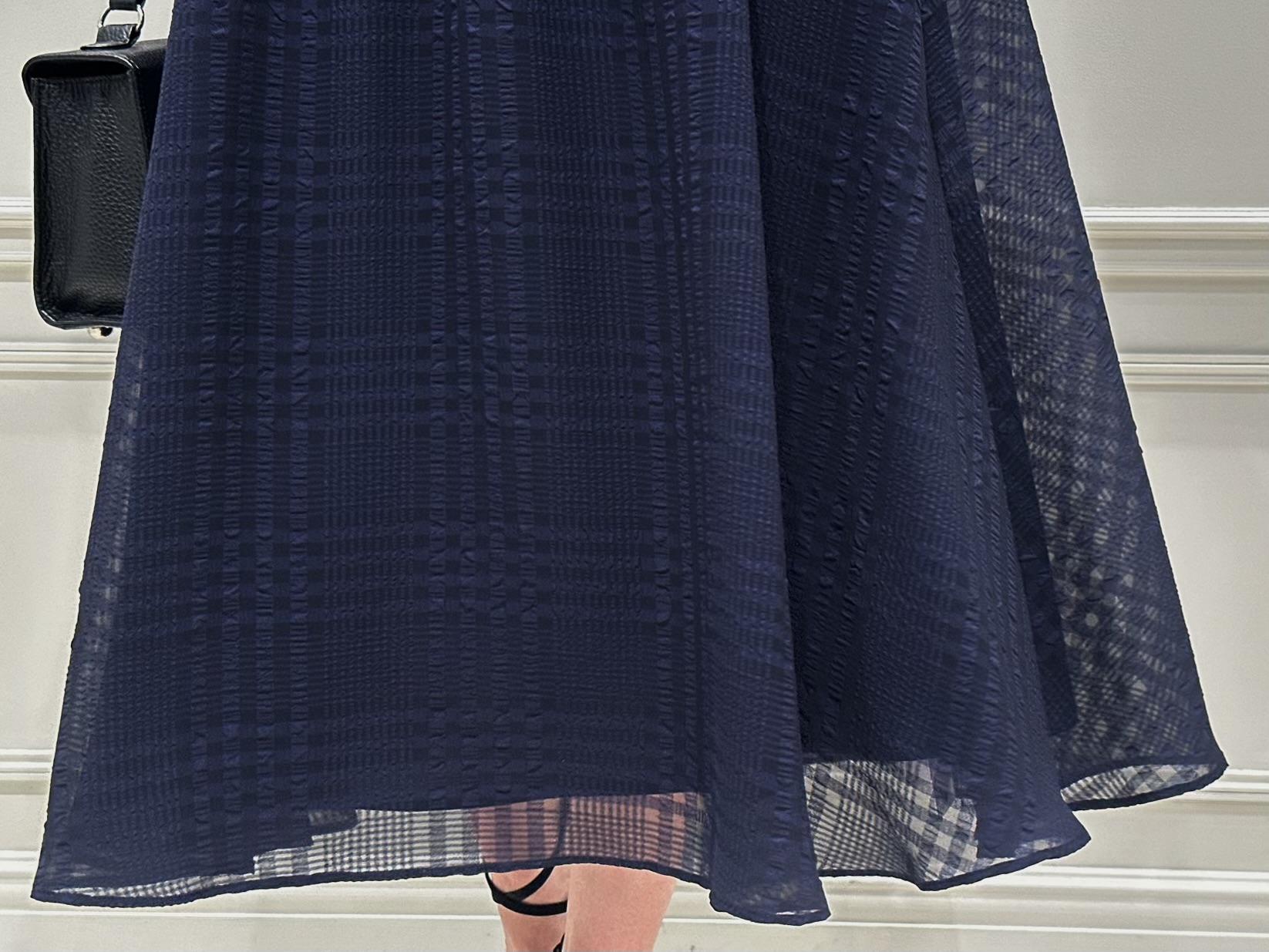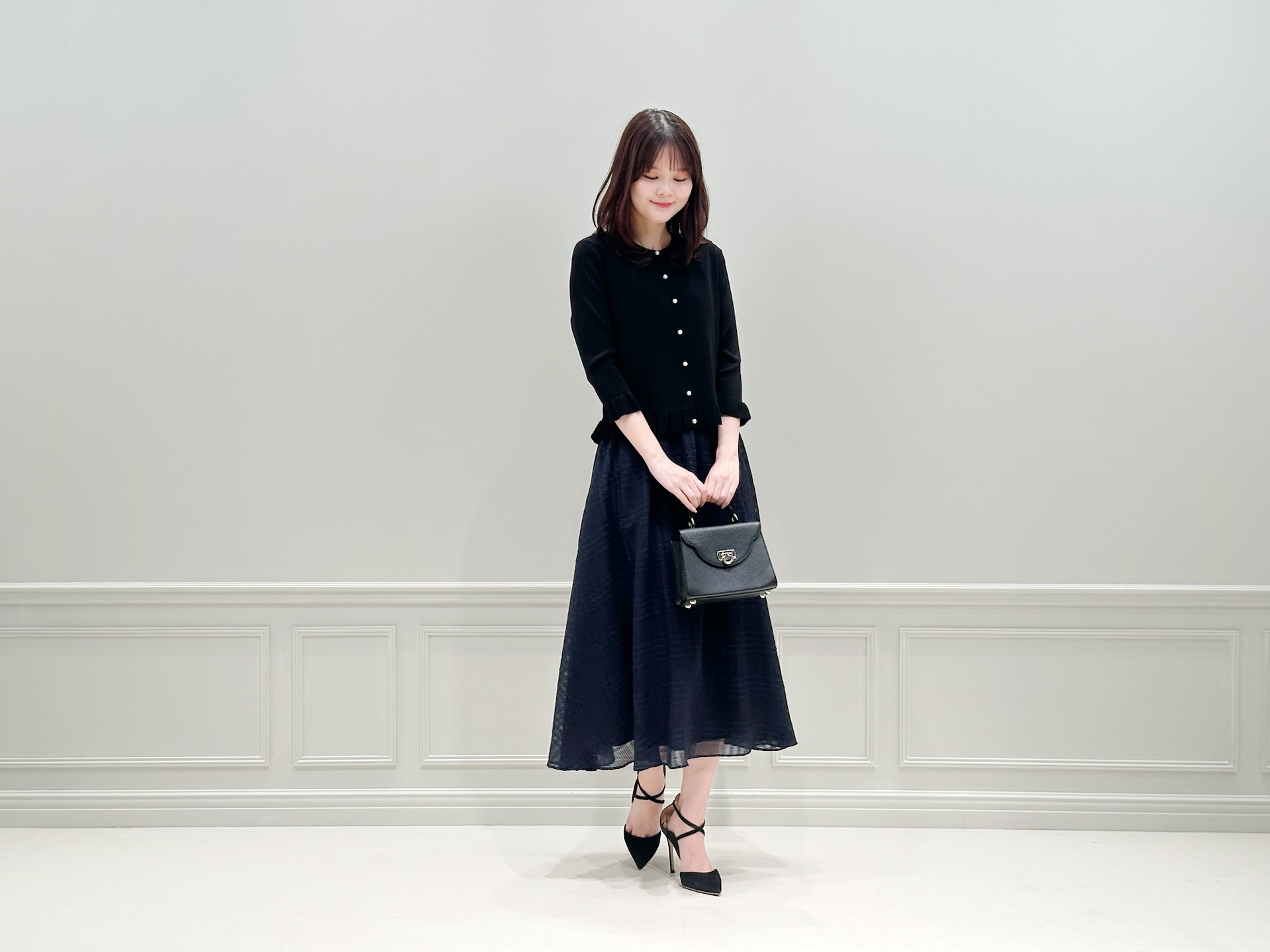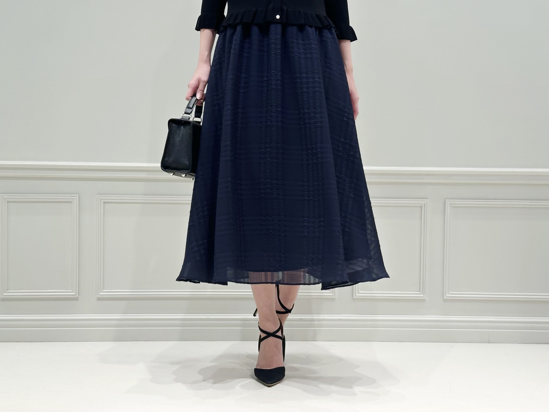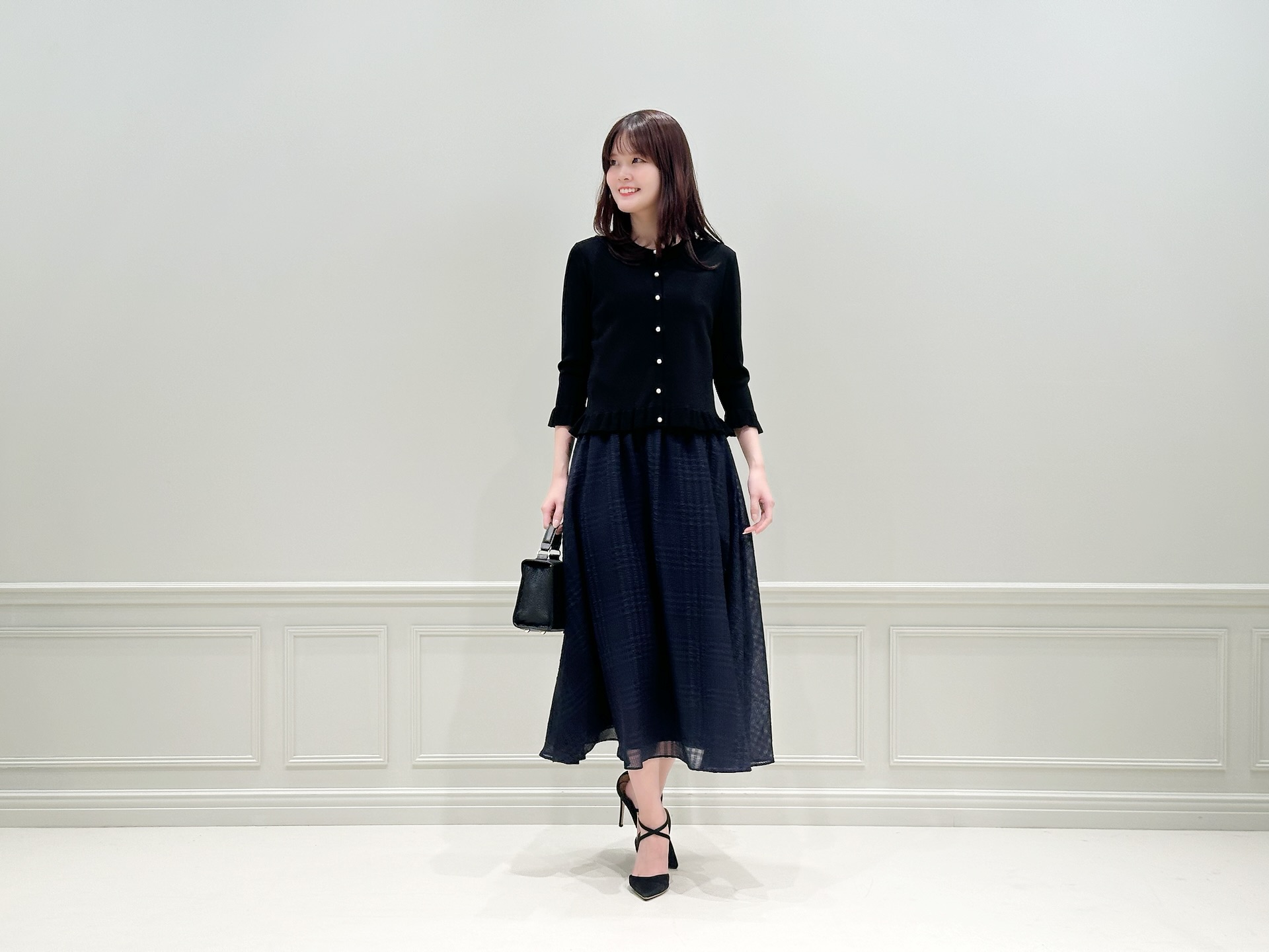 トップスにはブラック、スカートはネイビーを合わせた落ち着いた配色。バッグやヒールもブラックで統一することで全体にまとまりを持たせつつ、素材感やディテールで奥行きを出したスタイリングです。