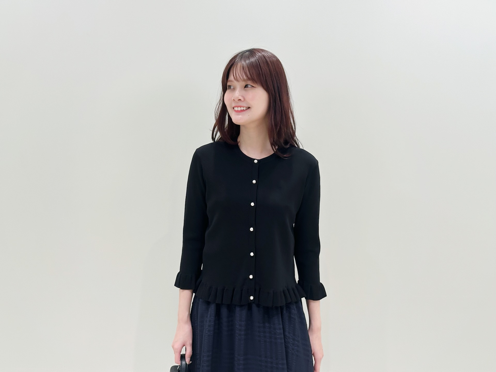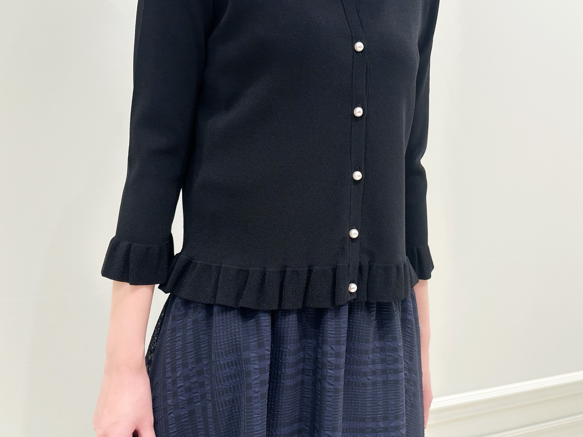 ブラック×ネイビーのシックな配色ながら、フリルやパール、透け感のある素材が柔らかさをプラスし、甘すぎず大人の可愛らしさを楽しめるのがこのスタイリングの魅力。通勤にはもちろん、ちょっとしたお出かけやお食事のシーンにもぴったりで、品の良さを保ちながらさりげなく華やかな印象を演出してくれます♪