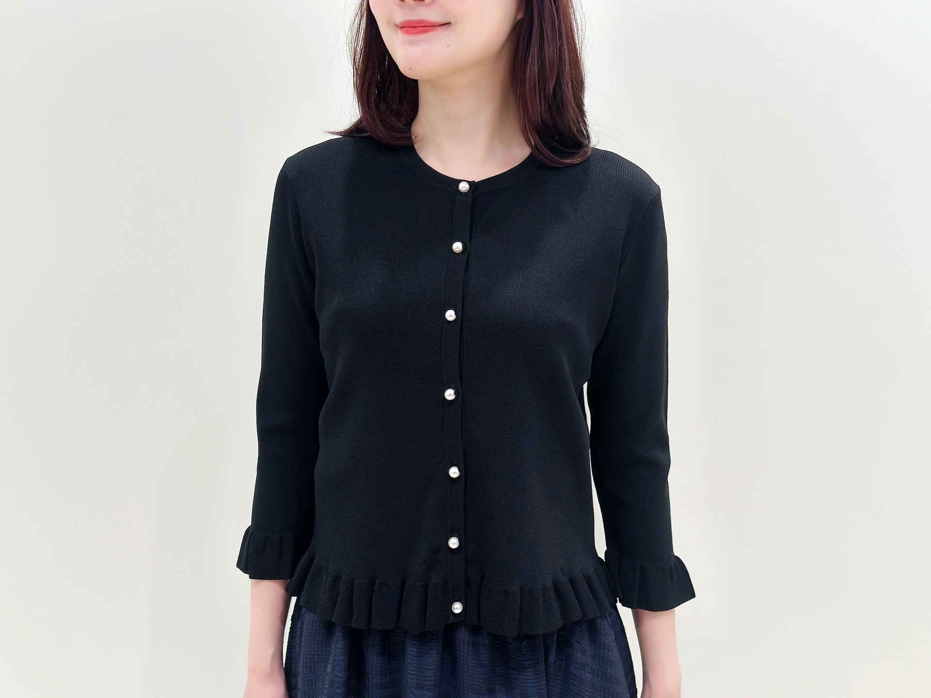 上品な光沢をもつパールボタンがアクセントとなり、前を閉めてトップスとして着ることで、きちんと感と可愛らしさを両立!モノトーンのカラー展開で着回し力が高く、ご家庭で手洗い可能なのも嬉しいポイントです。袖丈がやや短めのデザインなので、ブラックでも軽やかな印象に見せてくれるのが魅力です!