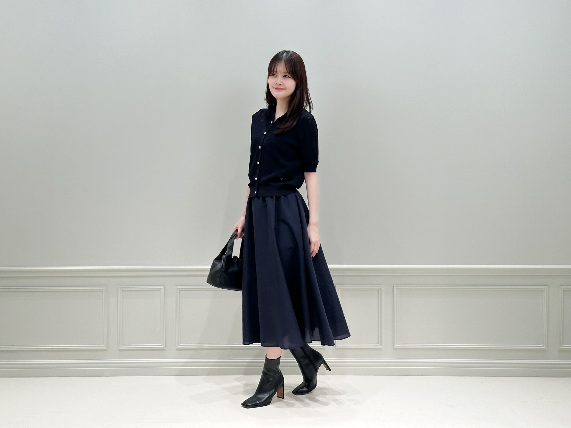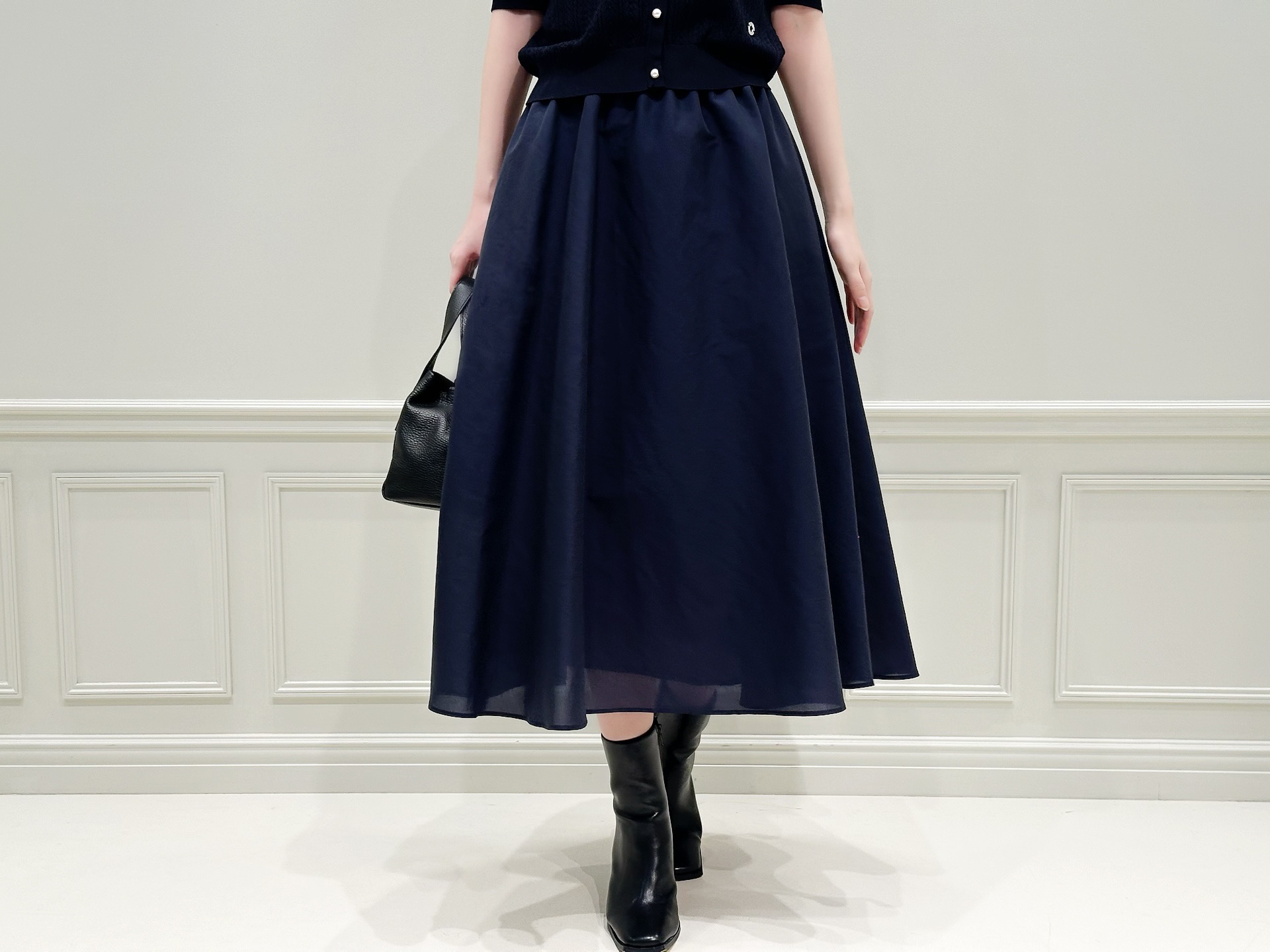 バッグとブーツはブラックを選び、コーディネート全体を程よく引き締める役割に。ネイビー×ブラックのシックな配色が、大人の上品さを感じさせるスタイリングです!