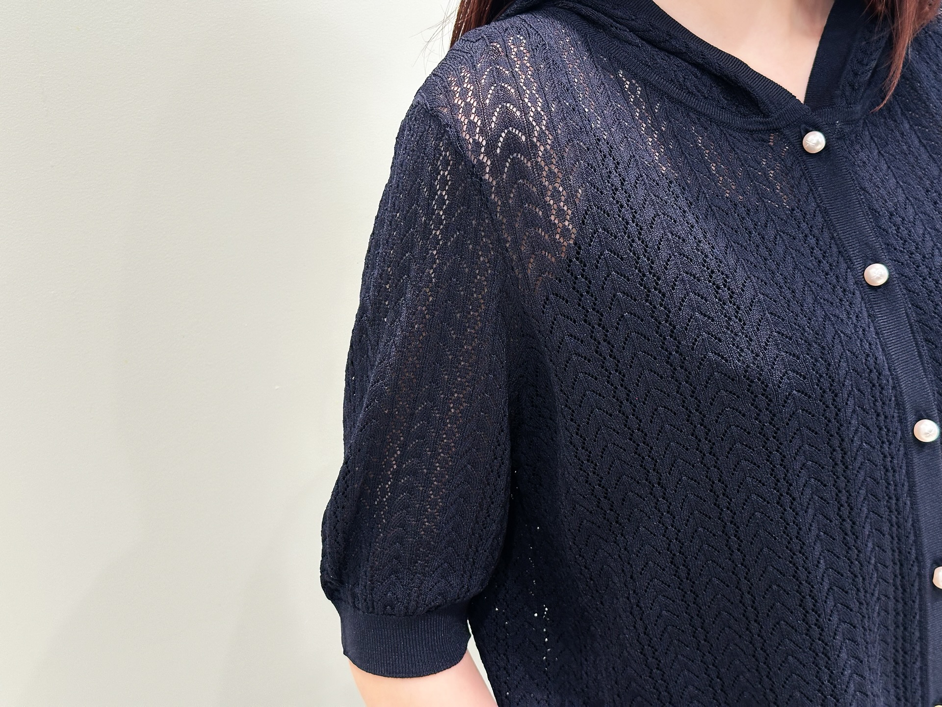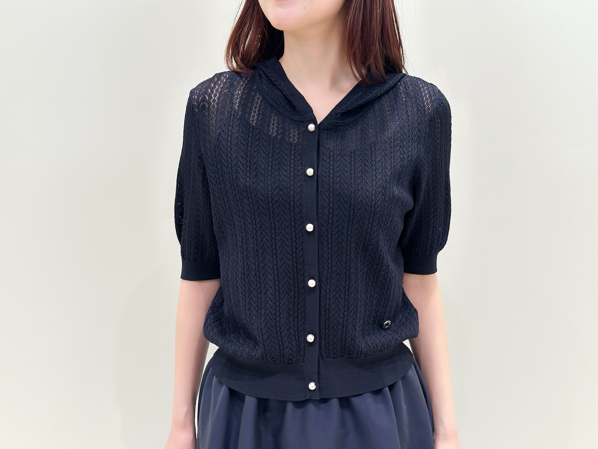 実際に着てみると、透かし編みの軽やかな素材感がとても心地よく、春から初夏にかけてぴったりのアイテム。ほんのりとした透け感があることで重たい印象にならず、大人でも取り入れやすい上品な抜け感を演出してくれます!