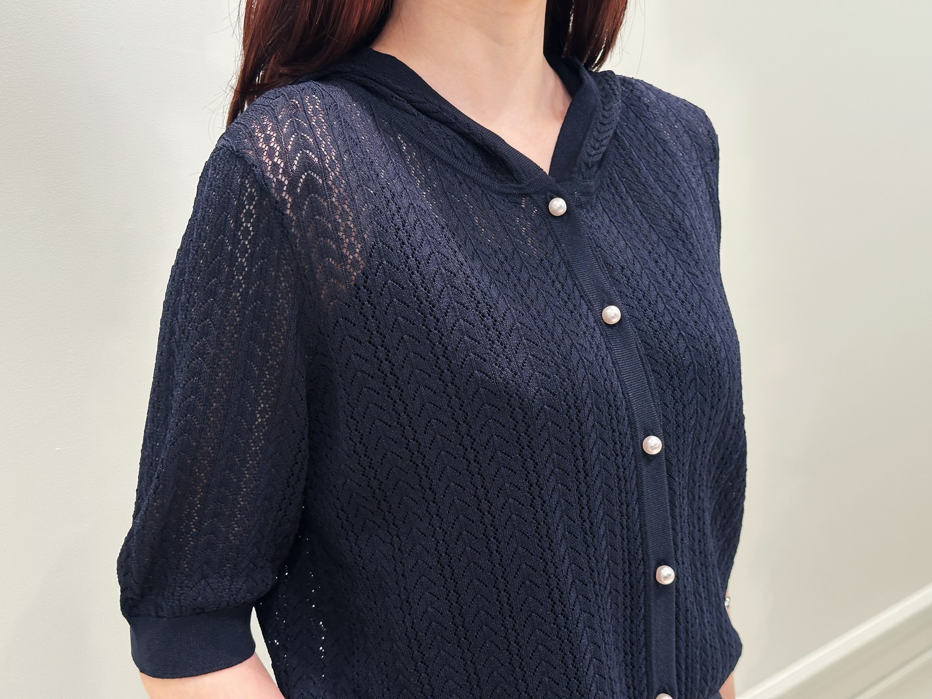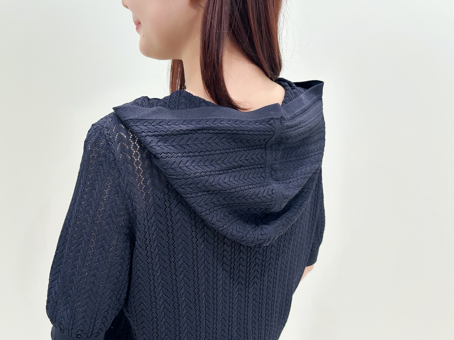 繊細な透かし編みの表情がとても美しく、カジュアルなパーカーでありながらもエレガントな雰囲気を感じる一着です。