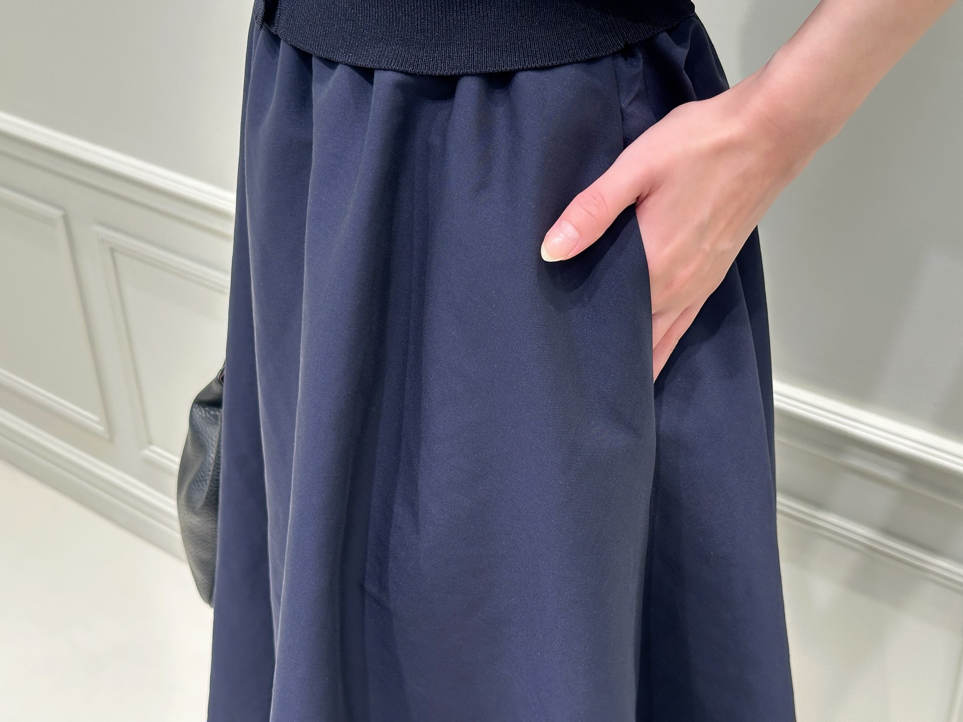 トップスとスカートを同色系で揃えることで、全体がすっきりとまとまり、自然と洗練された印象に。ネイビーは落ち着いたカラーでありながらも、素材の違いによって奥行きのあるスタイリングが楽しめるのも魅力です!