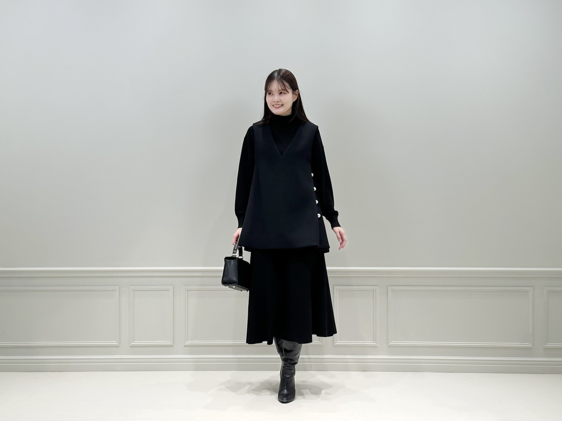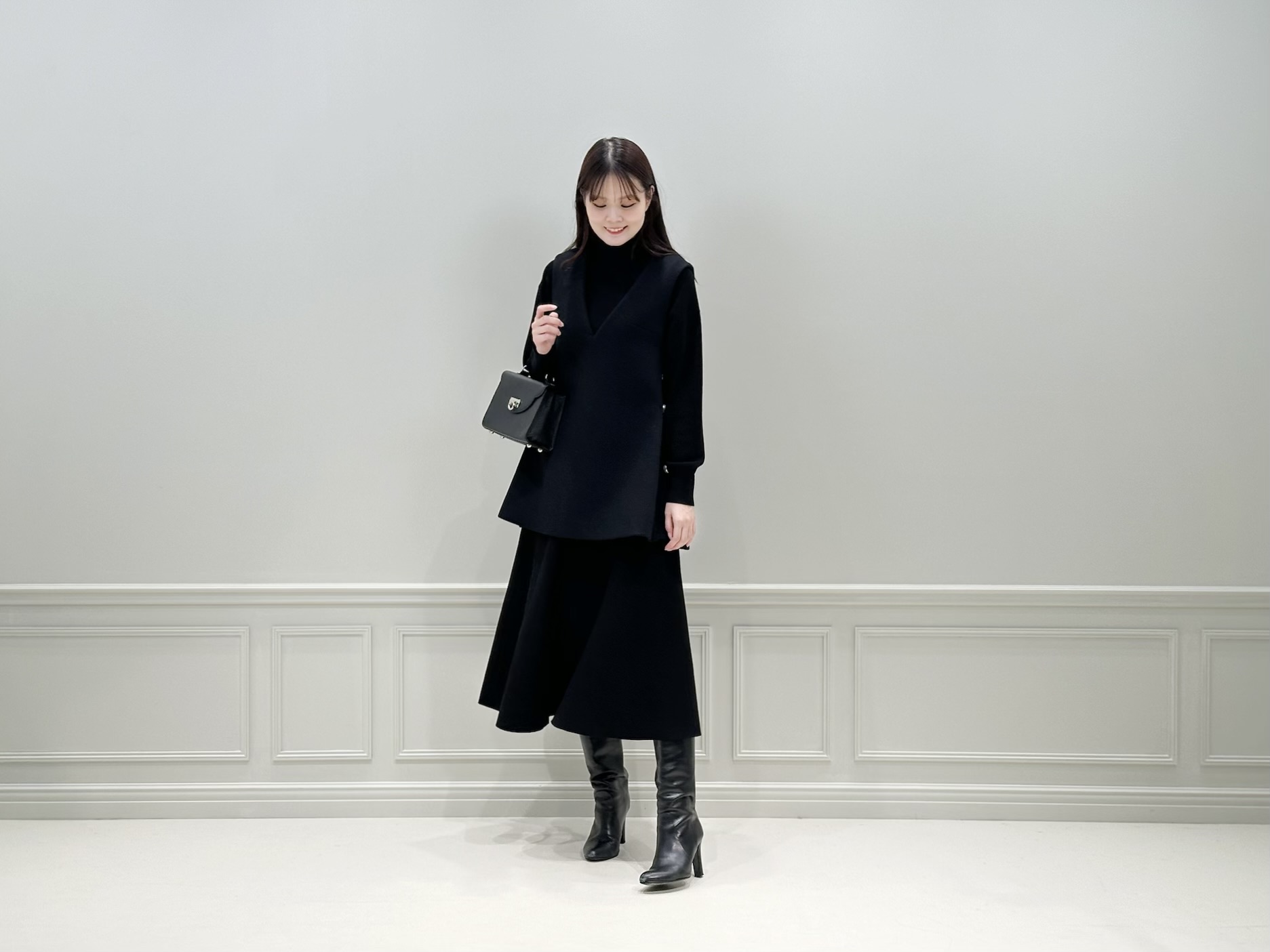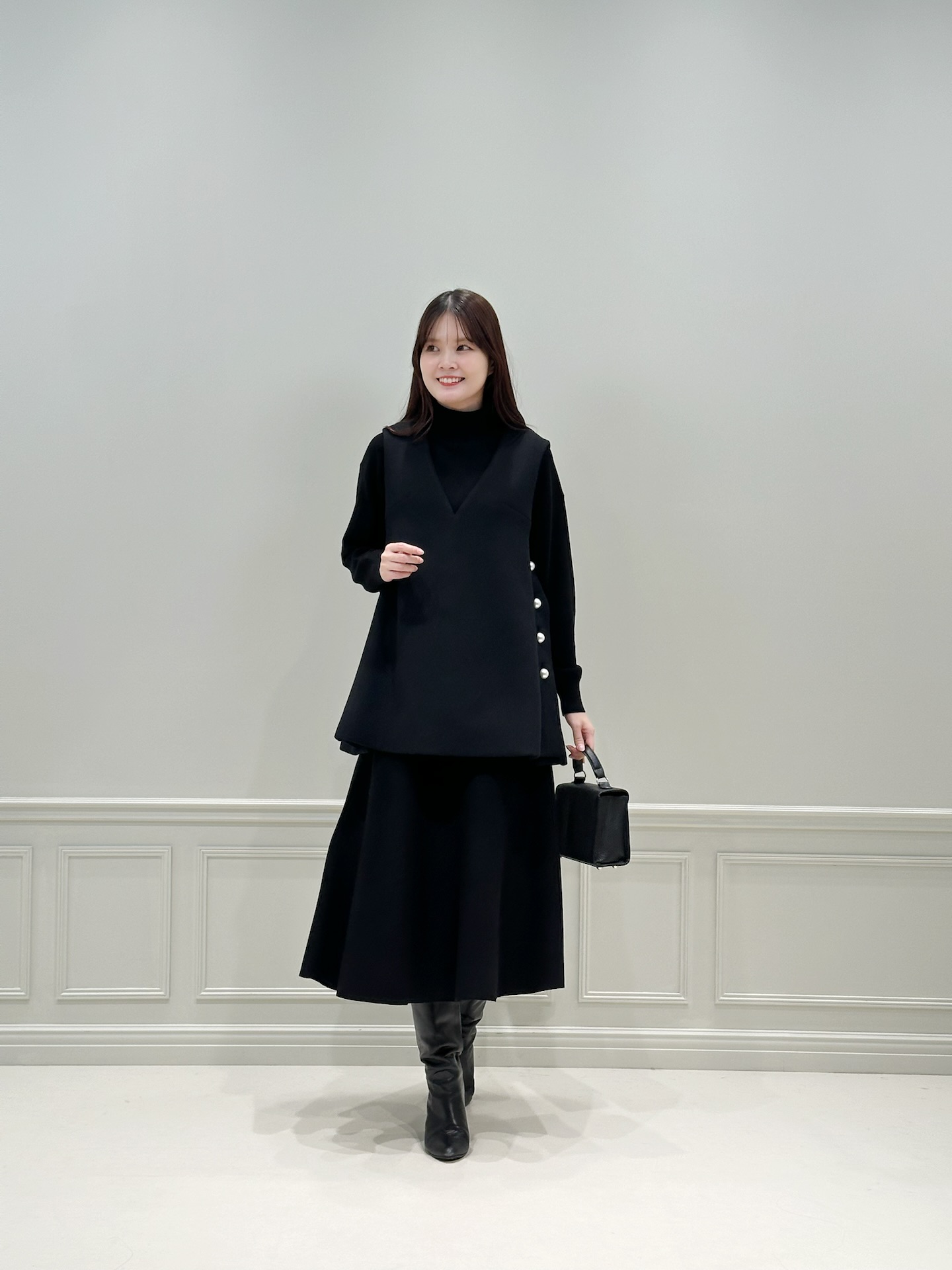 タートル×フレアスカートのセットアップ、そこに“冬ジレ”として活躍するサイドパールジレをON。すべてブラックで統一し、素材とシルエットで魅せる上品レイヤードに仕上げました。