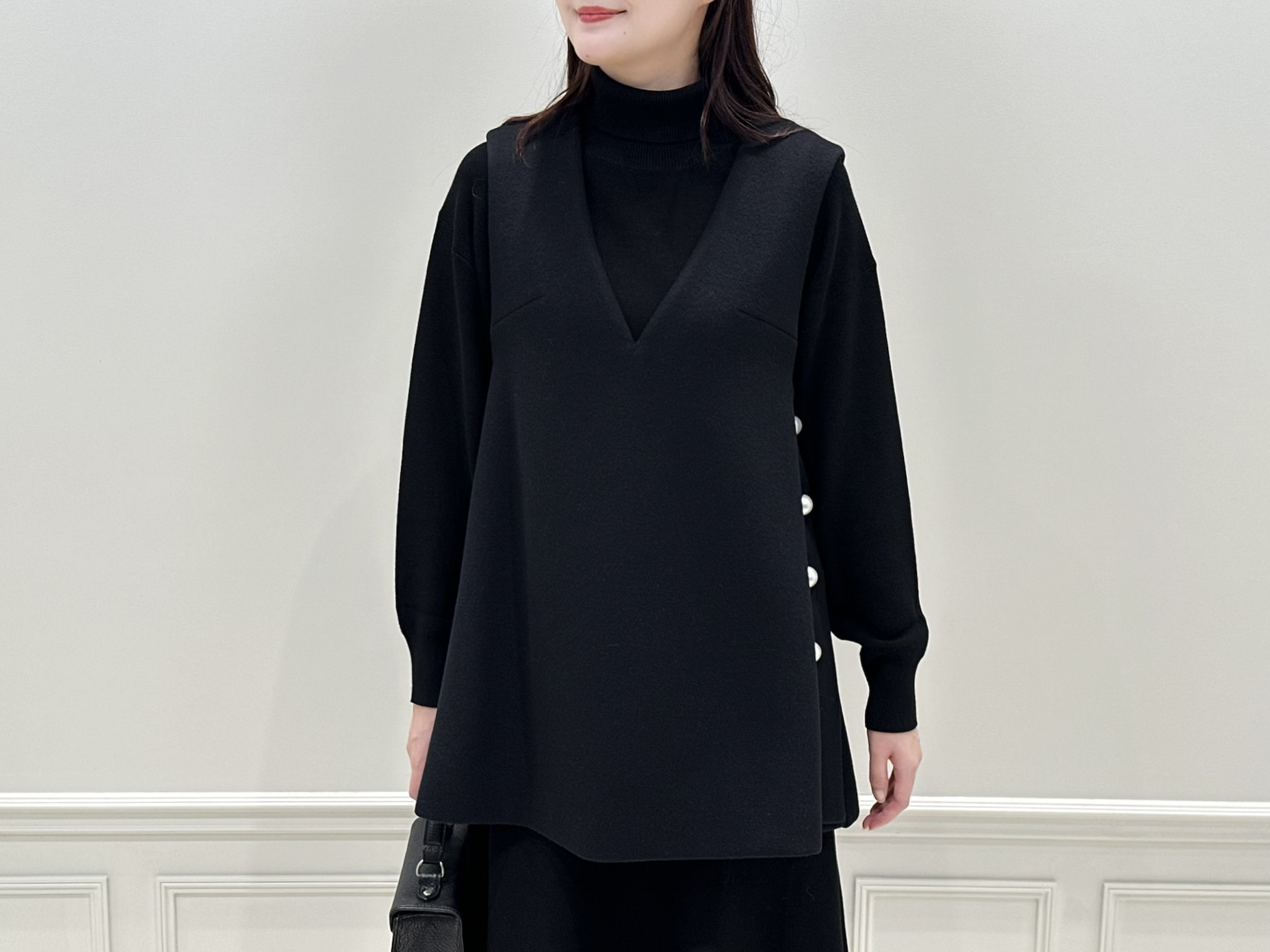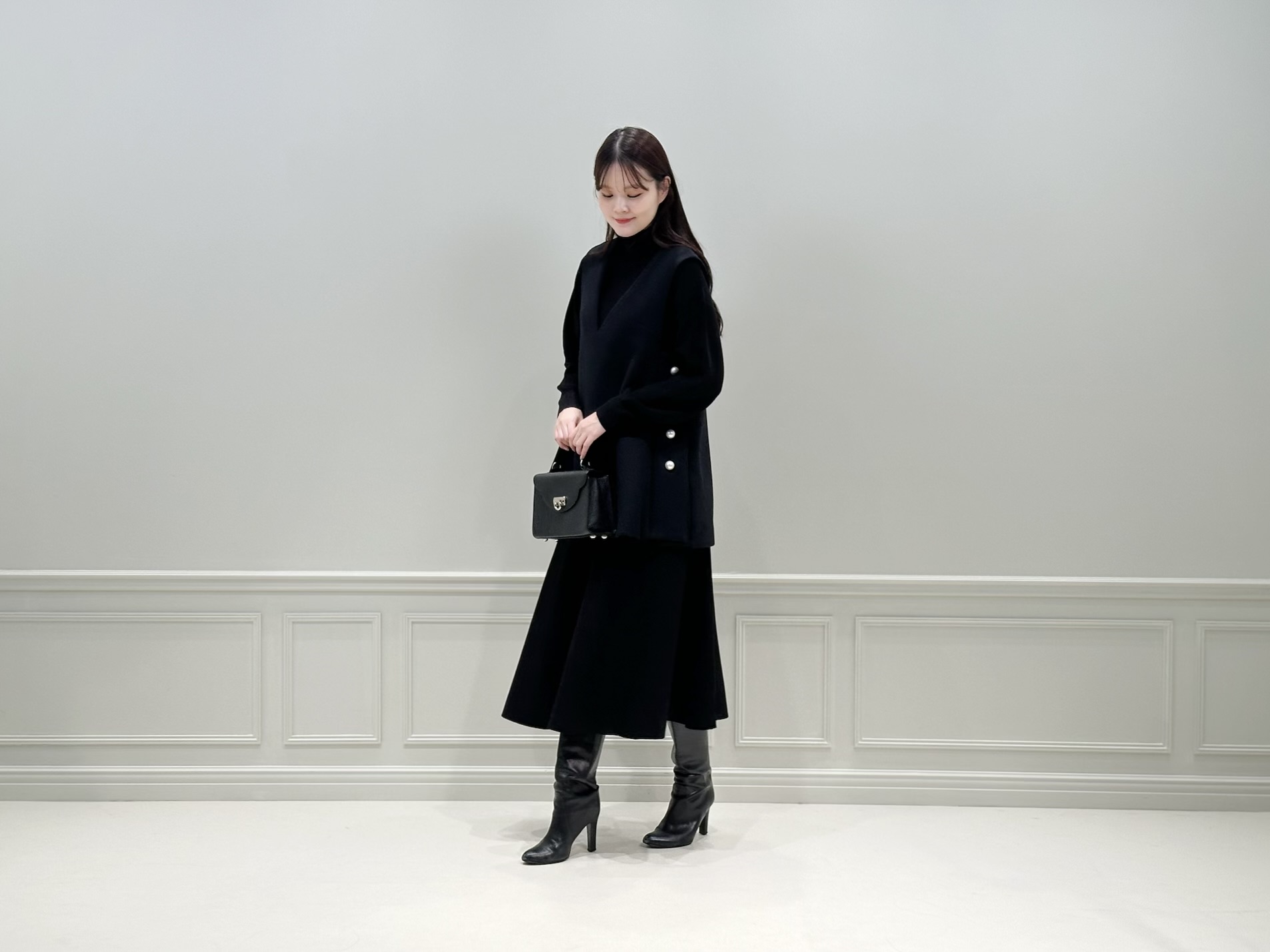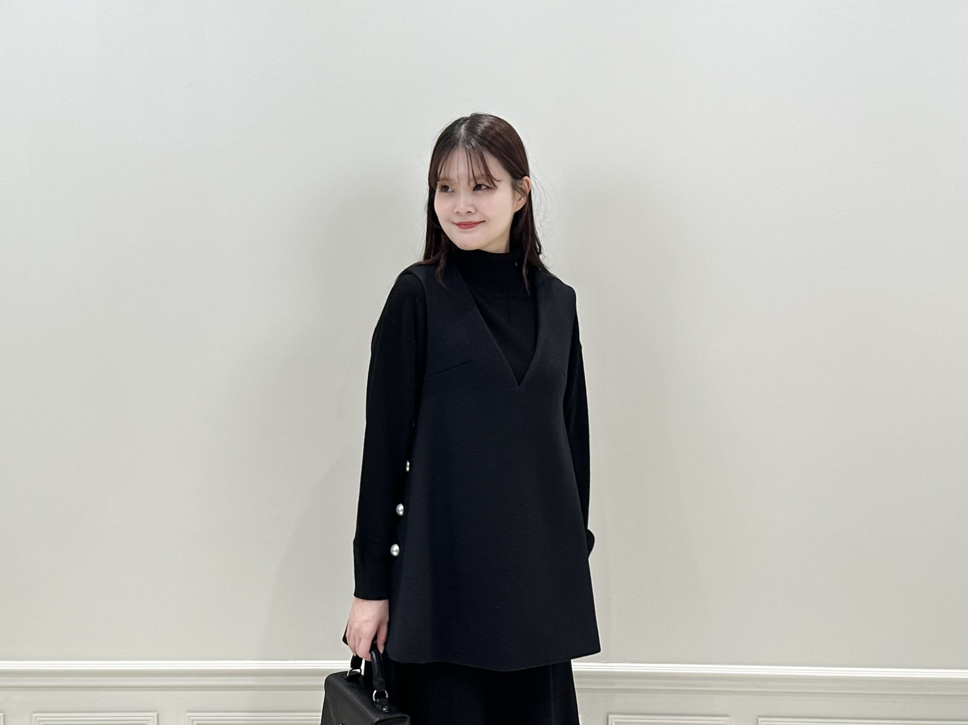 タートル×フレアスカートのセットアップ、そこに“冬ジレ”として活躍するサイドパールジレをON。すべてブラックで統一し、素材とシルエットで魅せる上品レイヤードに仕上げました。