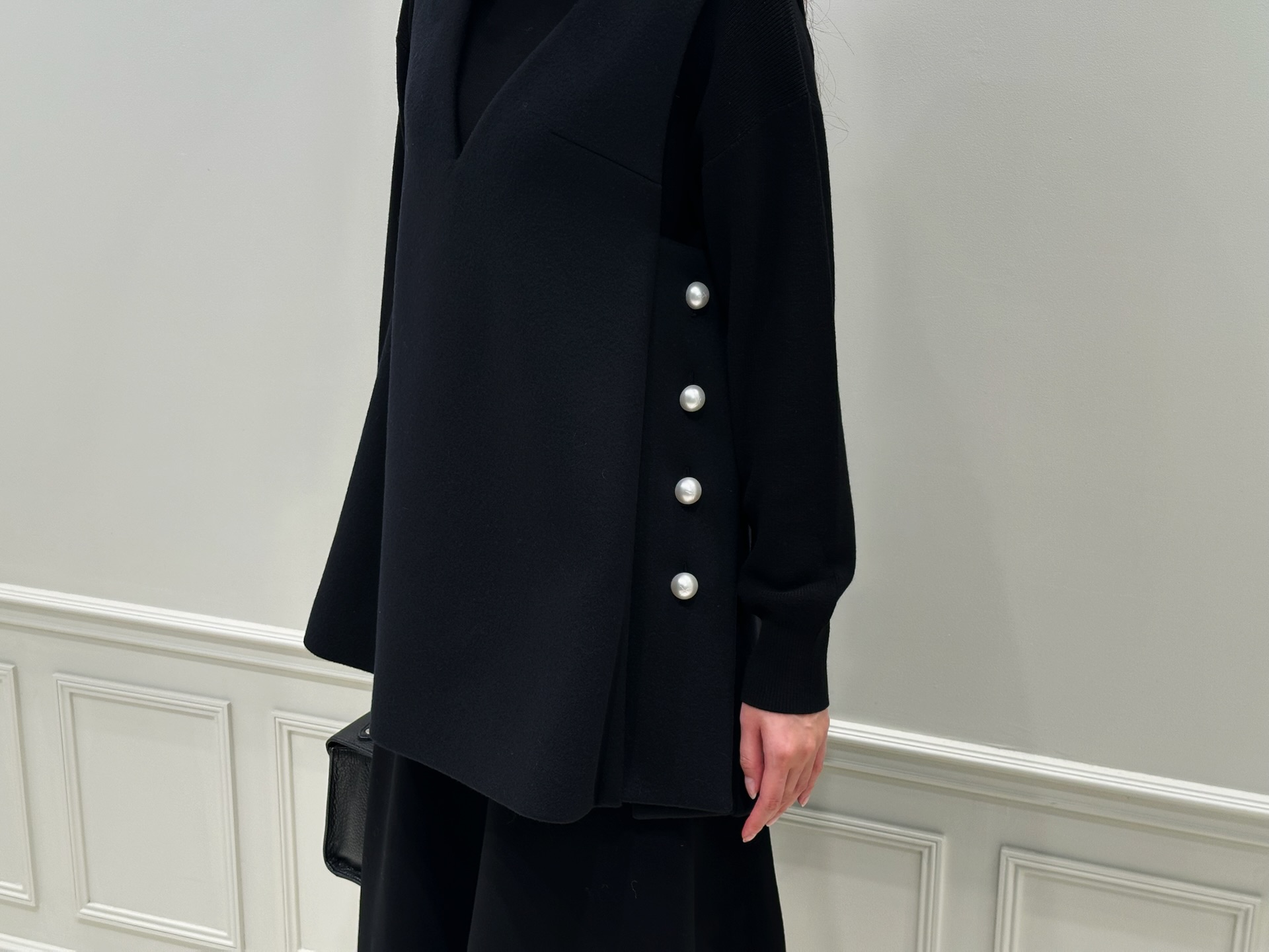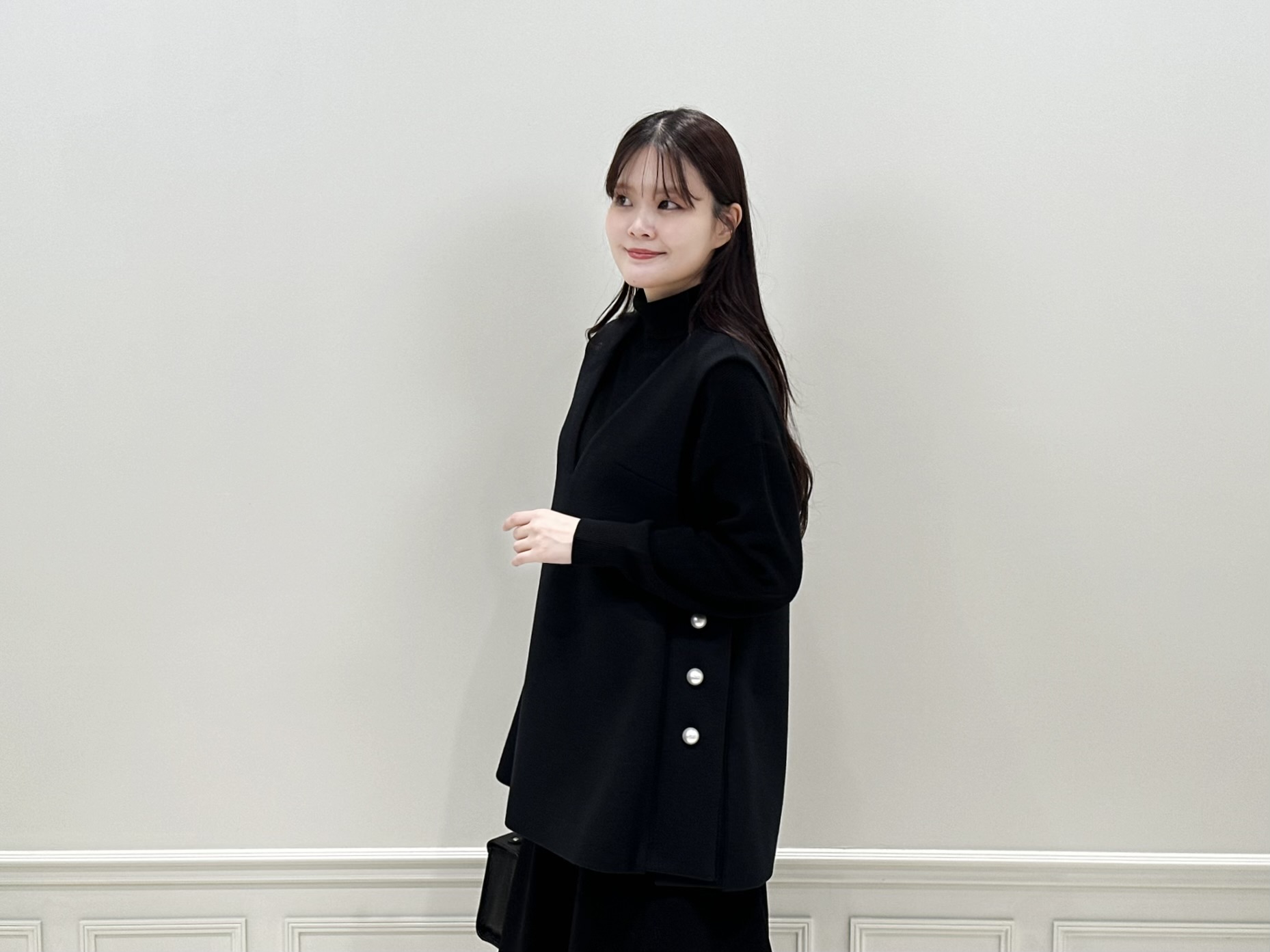 ジレは深いVラインがシャープ見え、美しく縦のラインを強調。同色のブラックでも、サイドに並ぶパールがしっかり映えて華やかさをプラス。