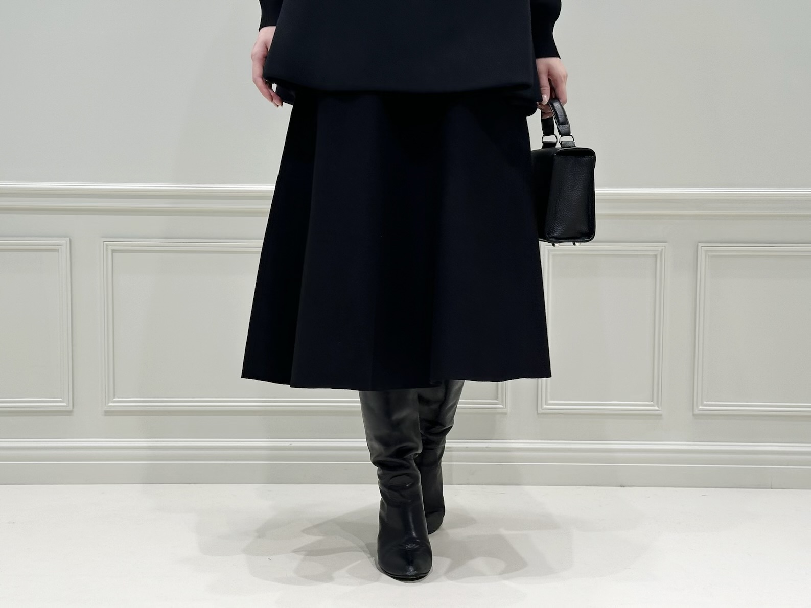 こちらのニットスカートは、黒でも沈まないドラマティックな広がりで、揺れ感が冬の重さを払ってくれます。