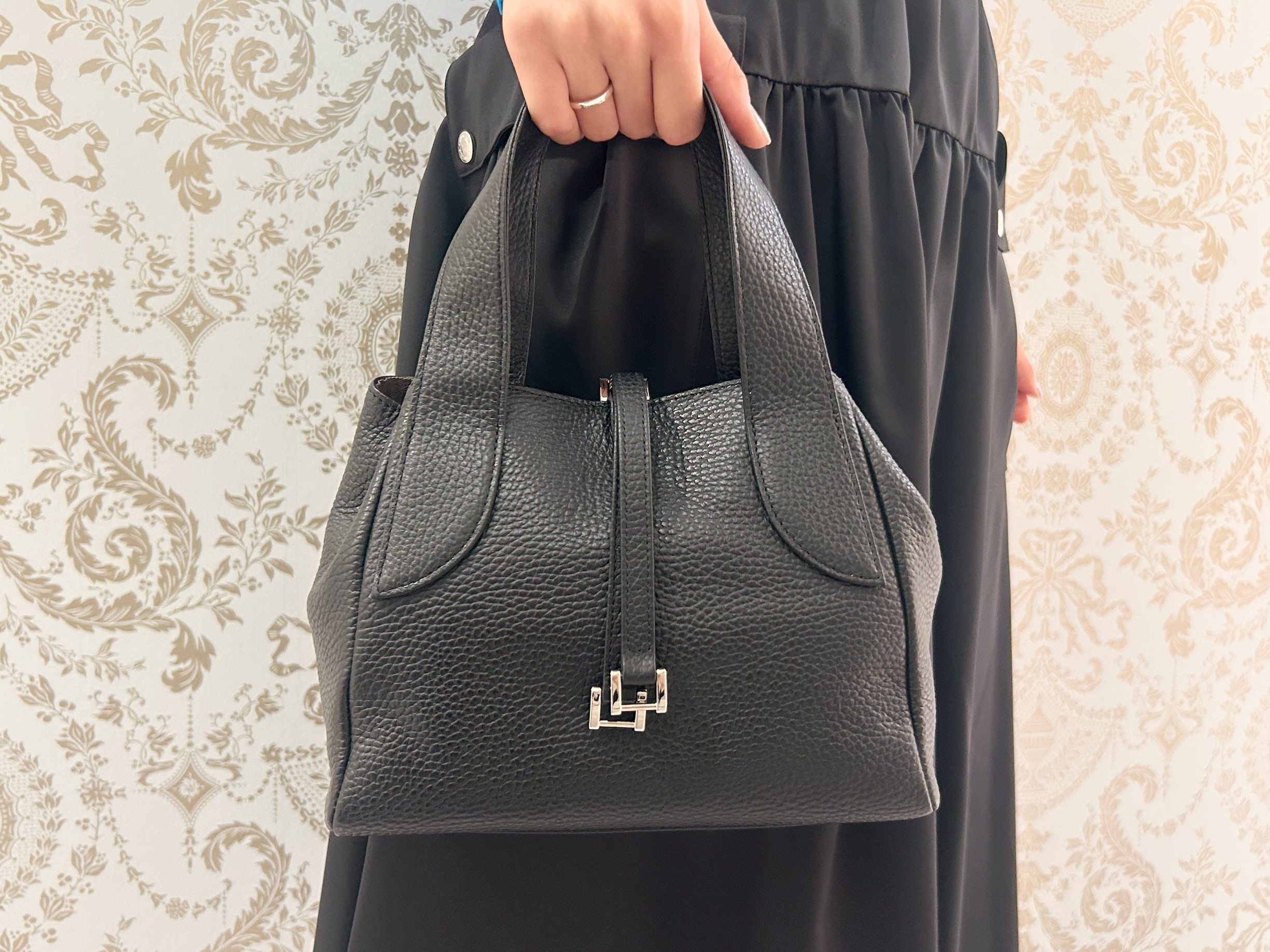 コーディネートの仕上げには、フロントにベルトデザインの施されたレザーバッグをオン。